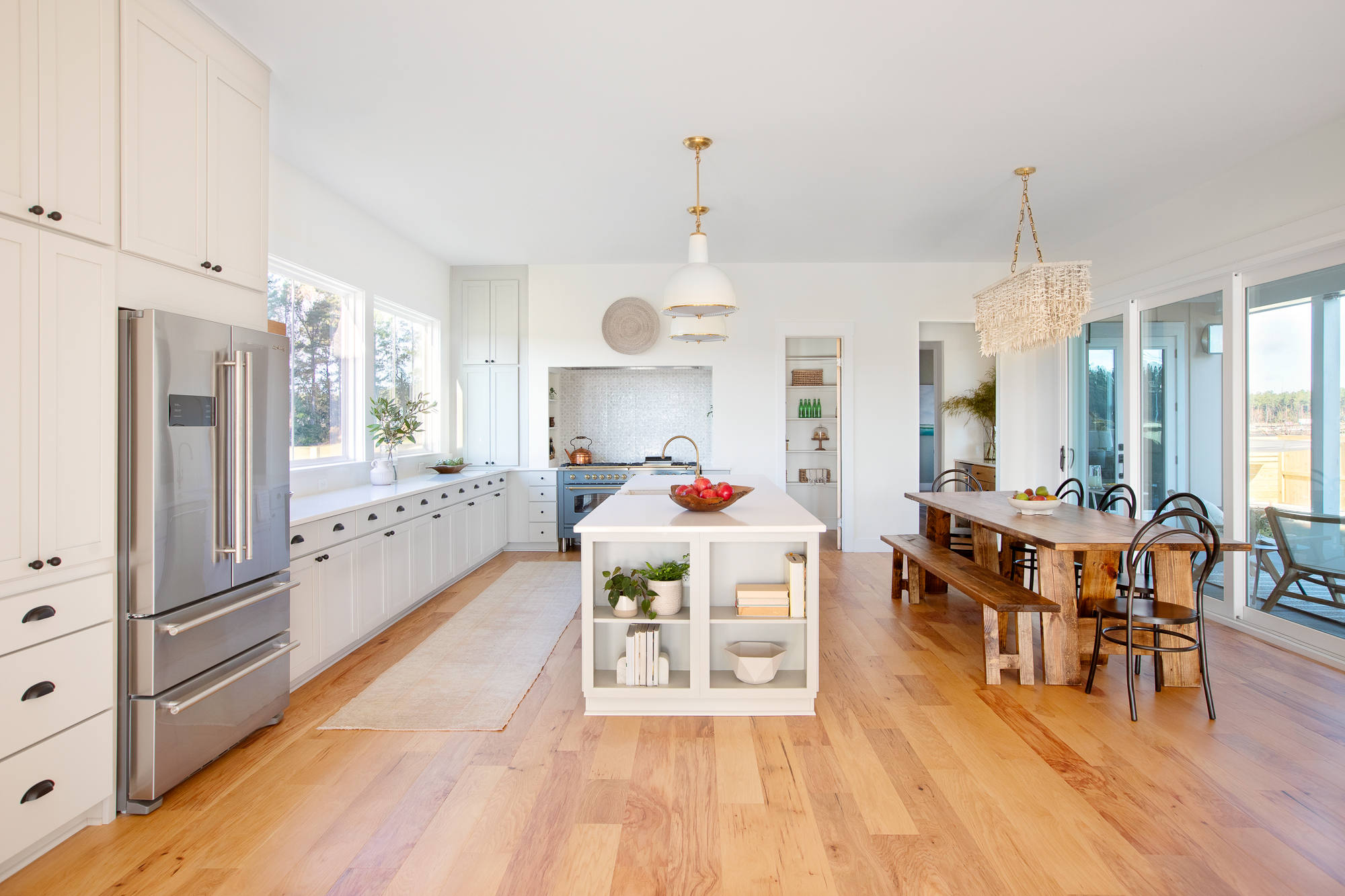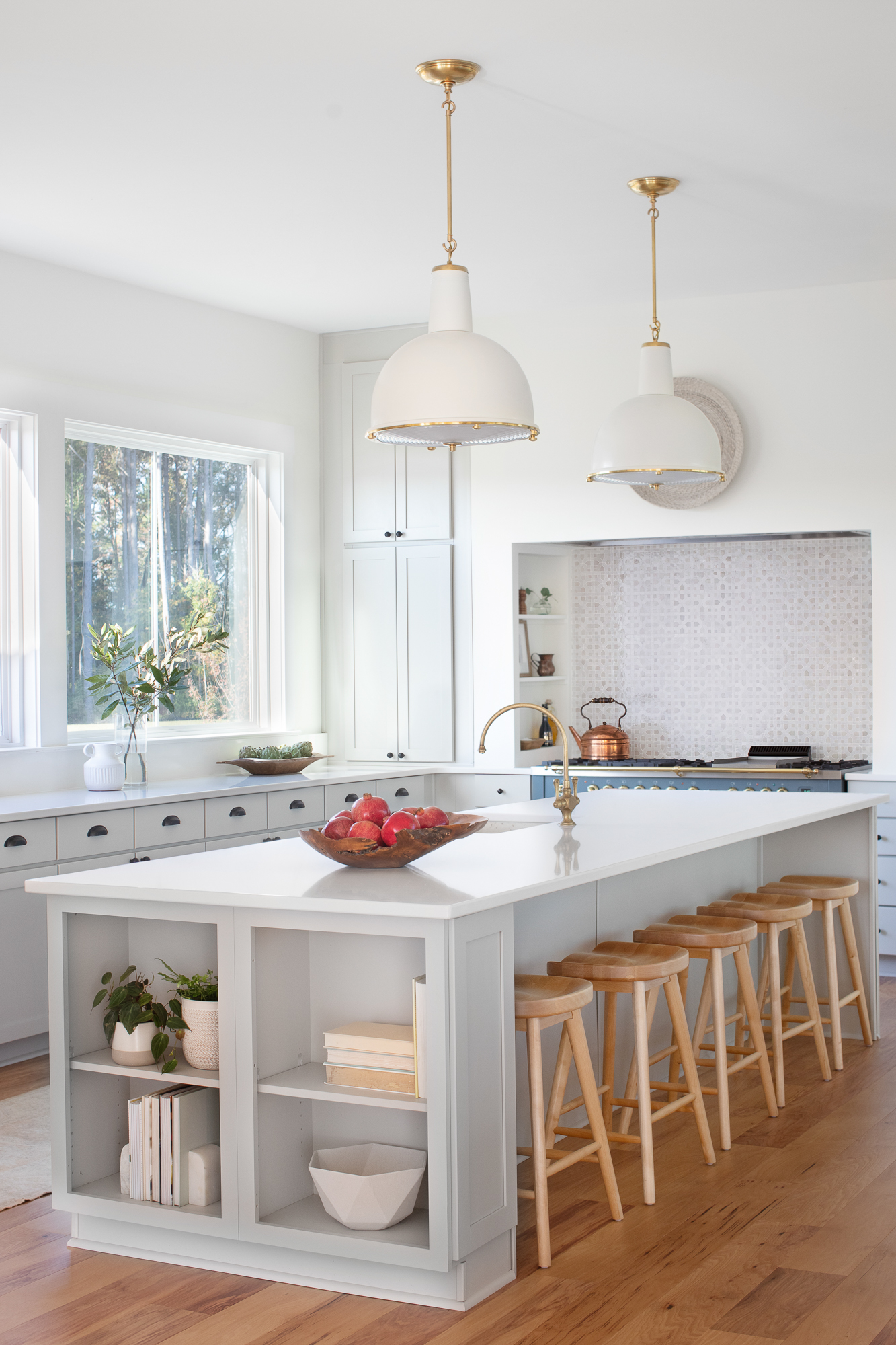 The focal point of the kitchen and the forefront of my entire design is the 60″ blue-gray range. Once I was able to get this range, I knew it would set the tone: coastal, sophisticated and classic. I chose the neutral, yet warm, grey-taupe cabinet color to complement the range without distracting from it. Then, we turned the entire layout of the kitchen in order to maximize the space and allow anyone cooking in here to look directly outside to the amazing patio and outdoor space (to come!). And, we added two large picture windows for natural light… the kitchen is flooded in the most gorgeous light throughout the day!