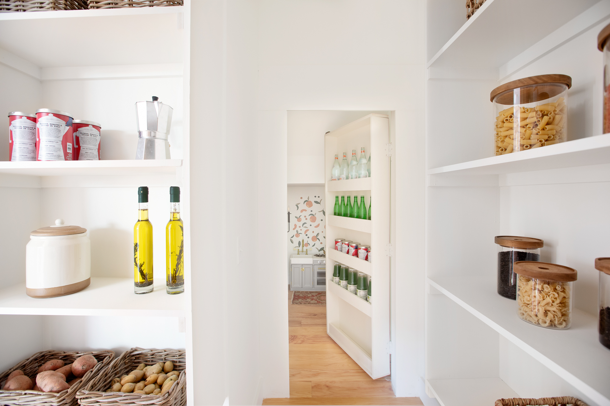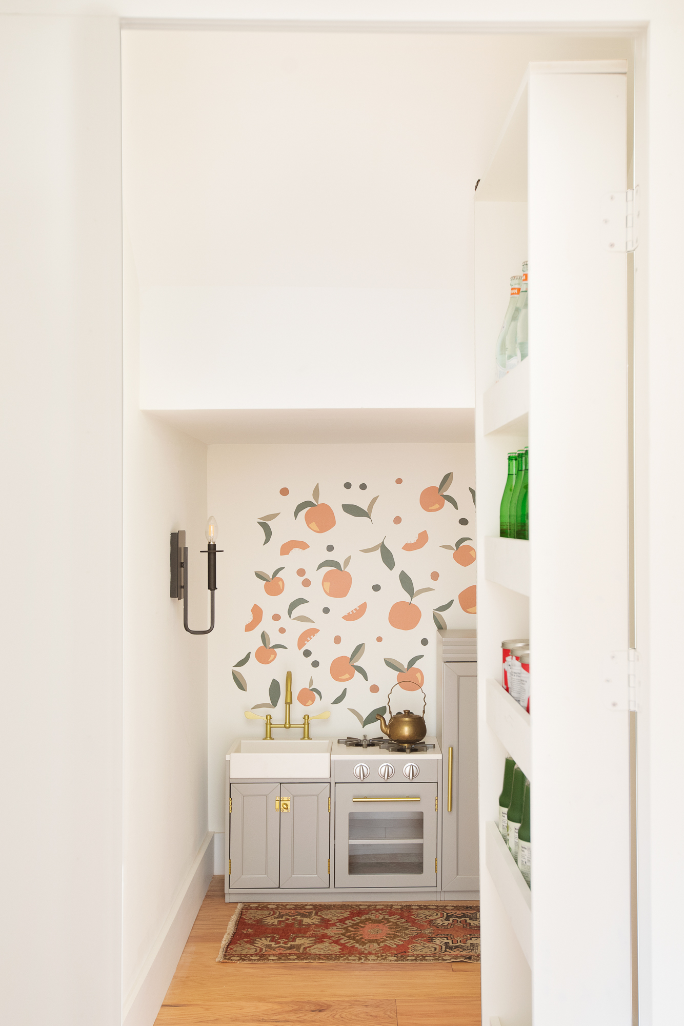 Now, the pantry itself is impressive – Dave built all of the custom shelving and there is plenty of storage (I dream of a pantry like this!) BUT the beauty of this pantry is the hidden entrance to an large, unused space under the stairs. This space is too low and awkward to have incorporated into the actual pantry so we decided to hide it with a door lined with shelving and then create a fun play area for kids (of course, it could be used for extra storage … but the kid area is just way more fun!). Every kid LOVES a hidden fort and every parent with young children LOVES a play area right near the kitchen so they can prep dinner in peace while kiddos play happily nearby.