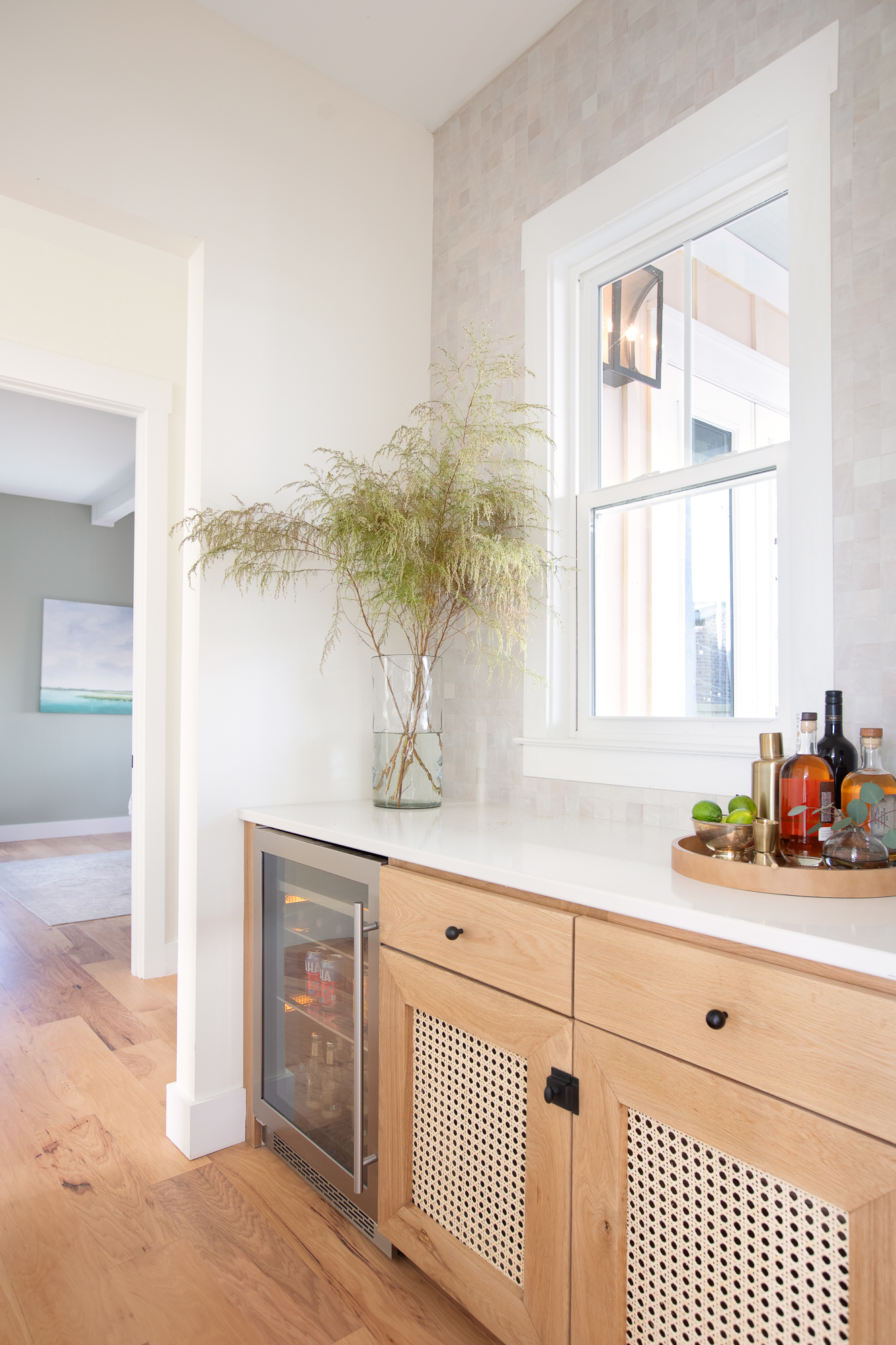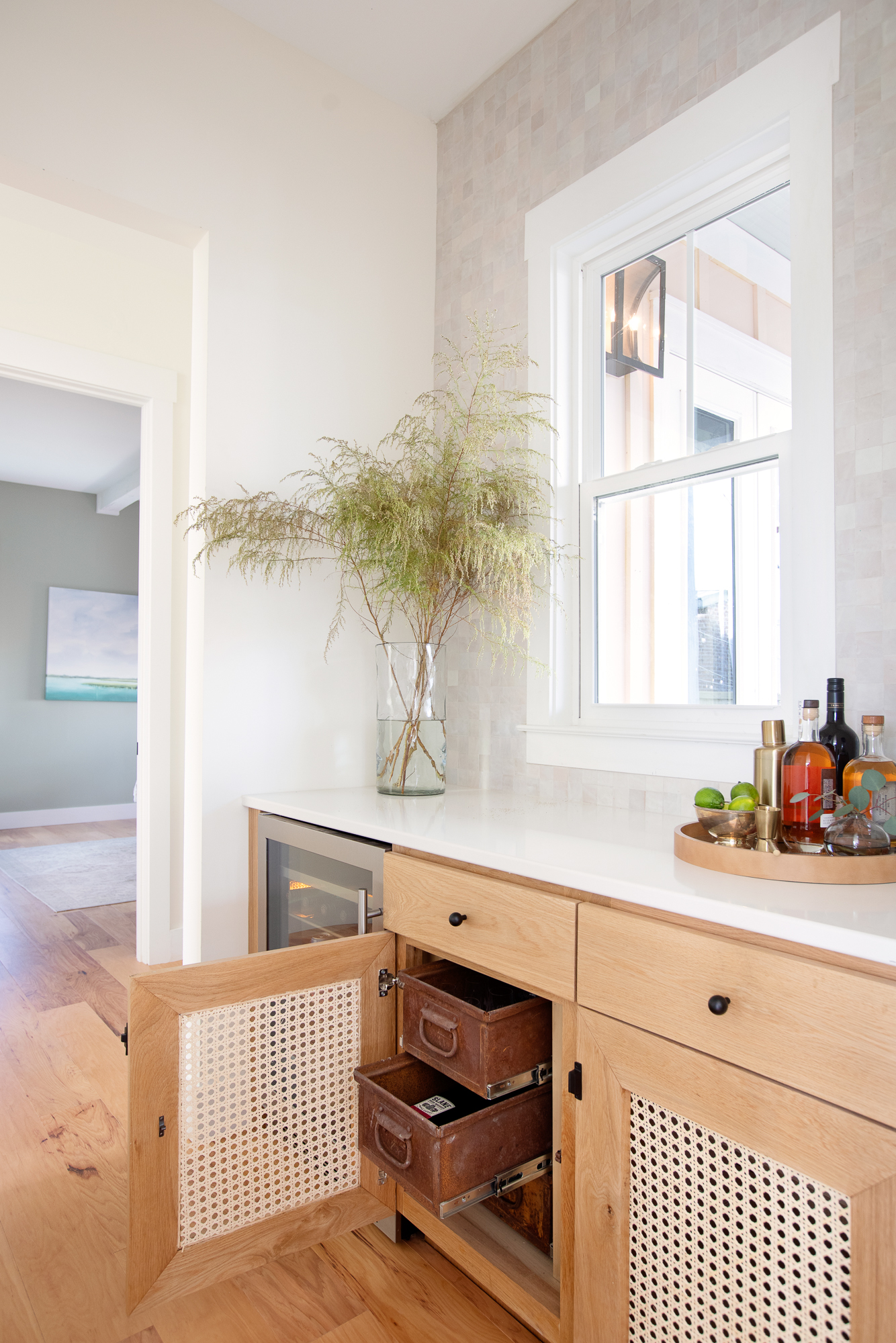 We actually kept the original builder-grade cabinets and then Dave built a new cabinet face and new doors out of white oak. We also added caning for extra detail and texture.
