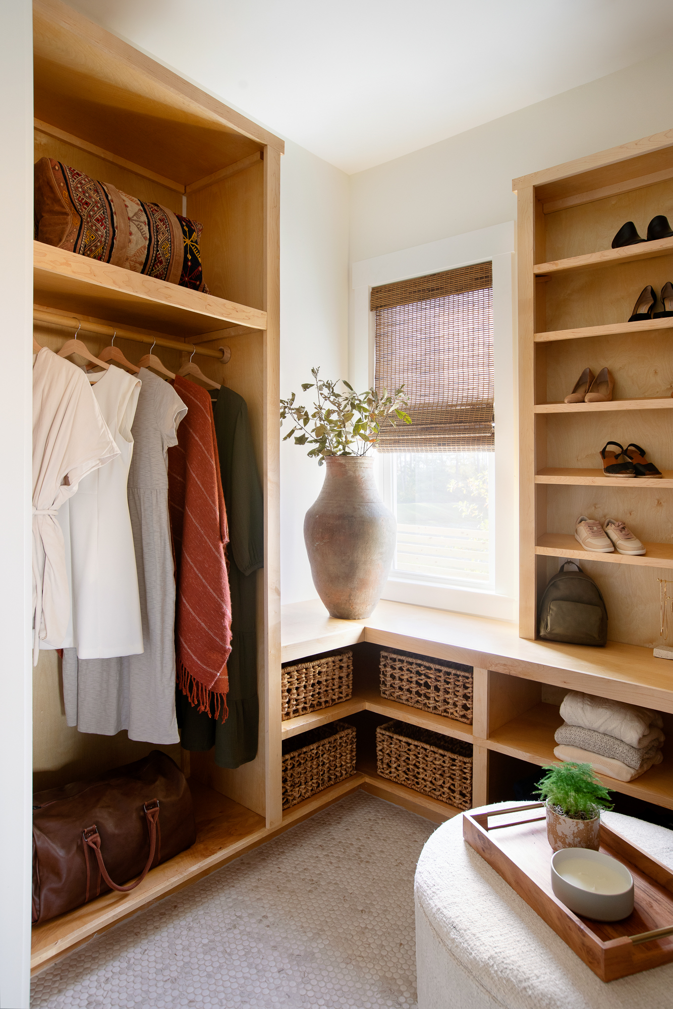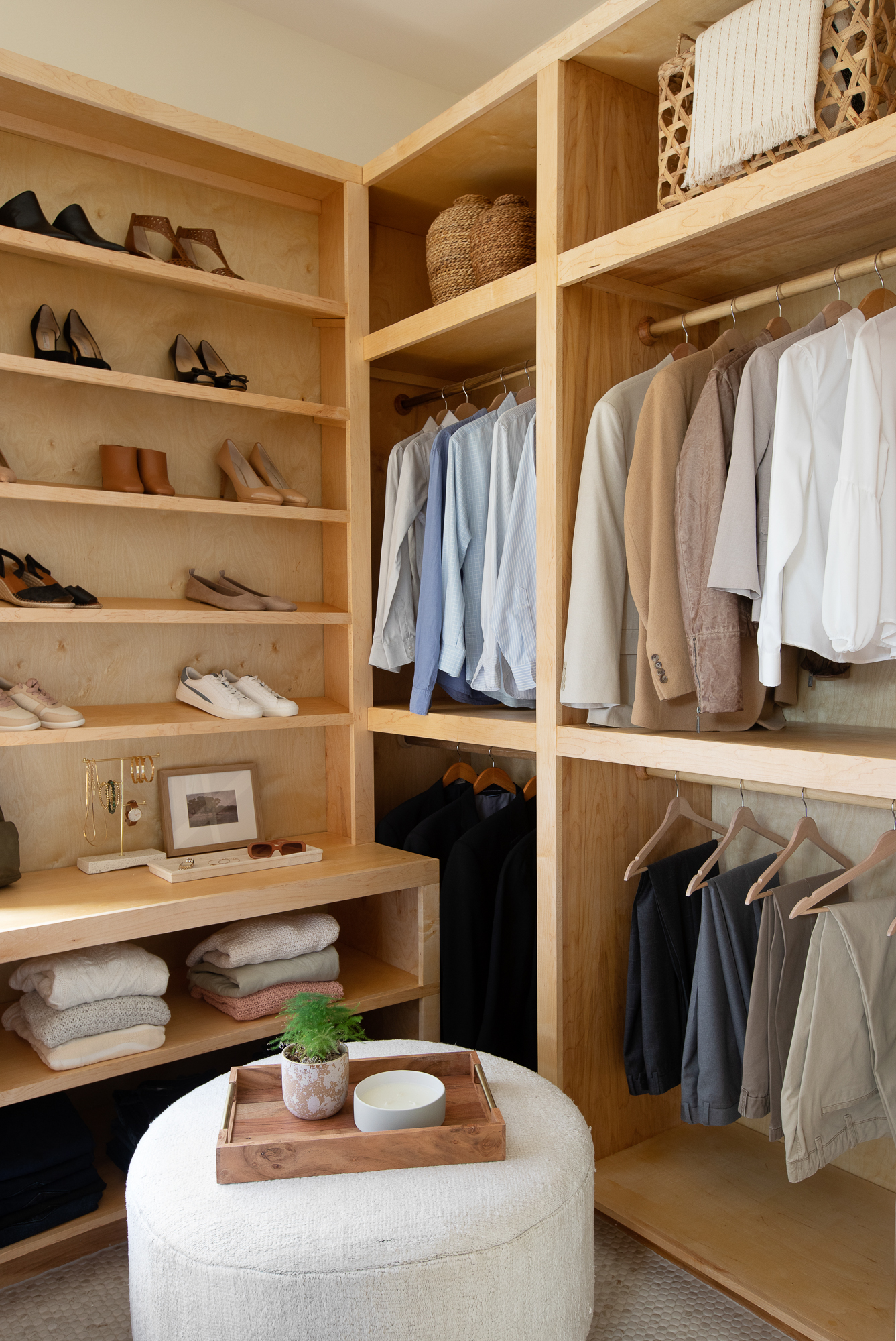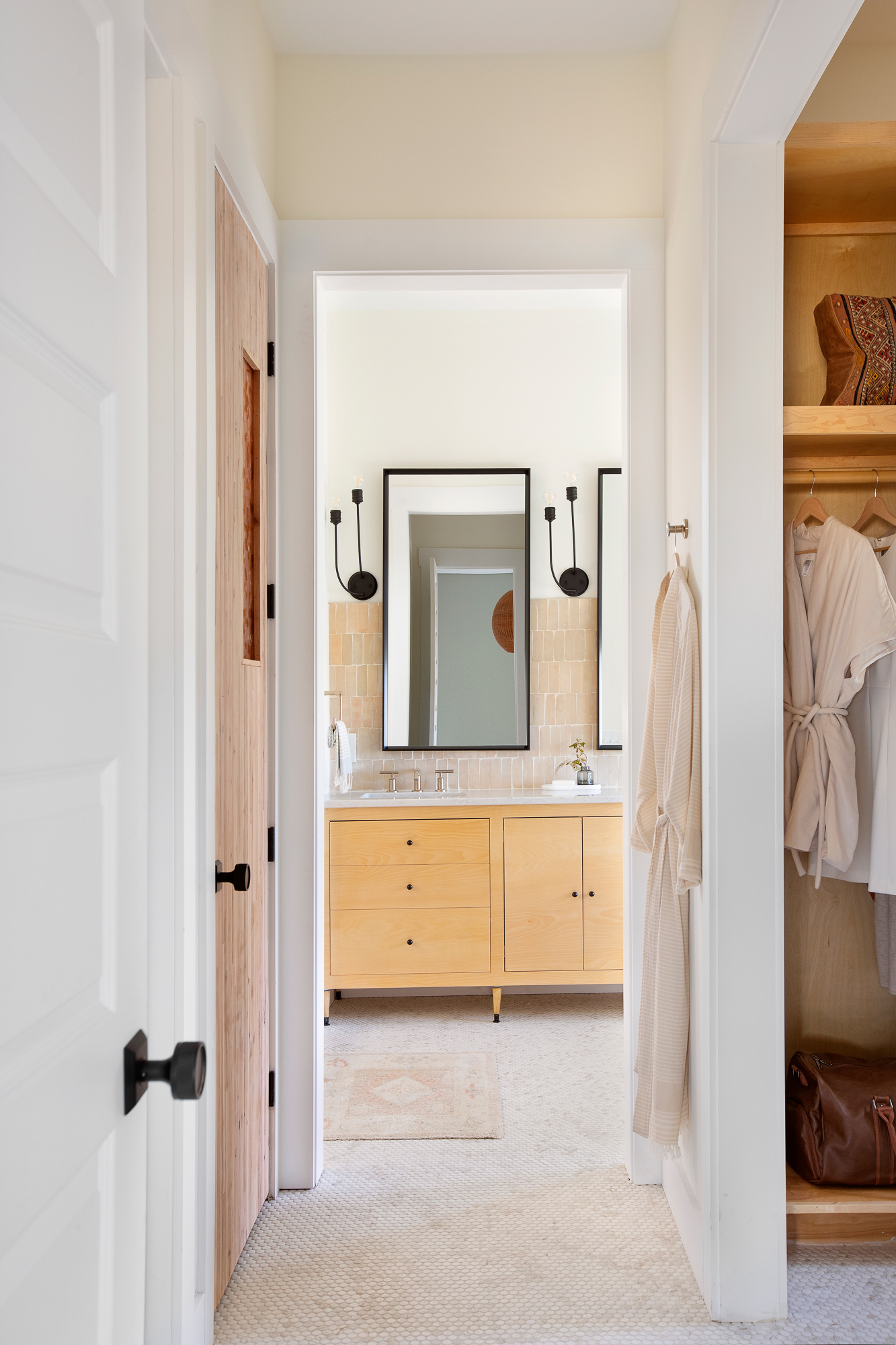 Of course, the closet was a point of contention but we love how sophisticated the space is thanks to the custom build by Dave. I think the gorgeous, custom cabinetry and natural light in this space feel both luxurious and practical. We live in an old home with limited closet space so we took a risk here and went with what works for us: less stuff but ample storage. (And, don’t worry, there is a door to the closet/bath hall).Â