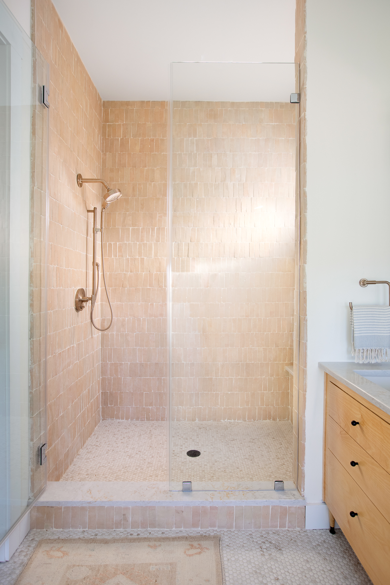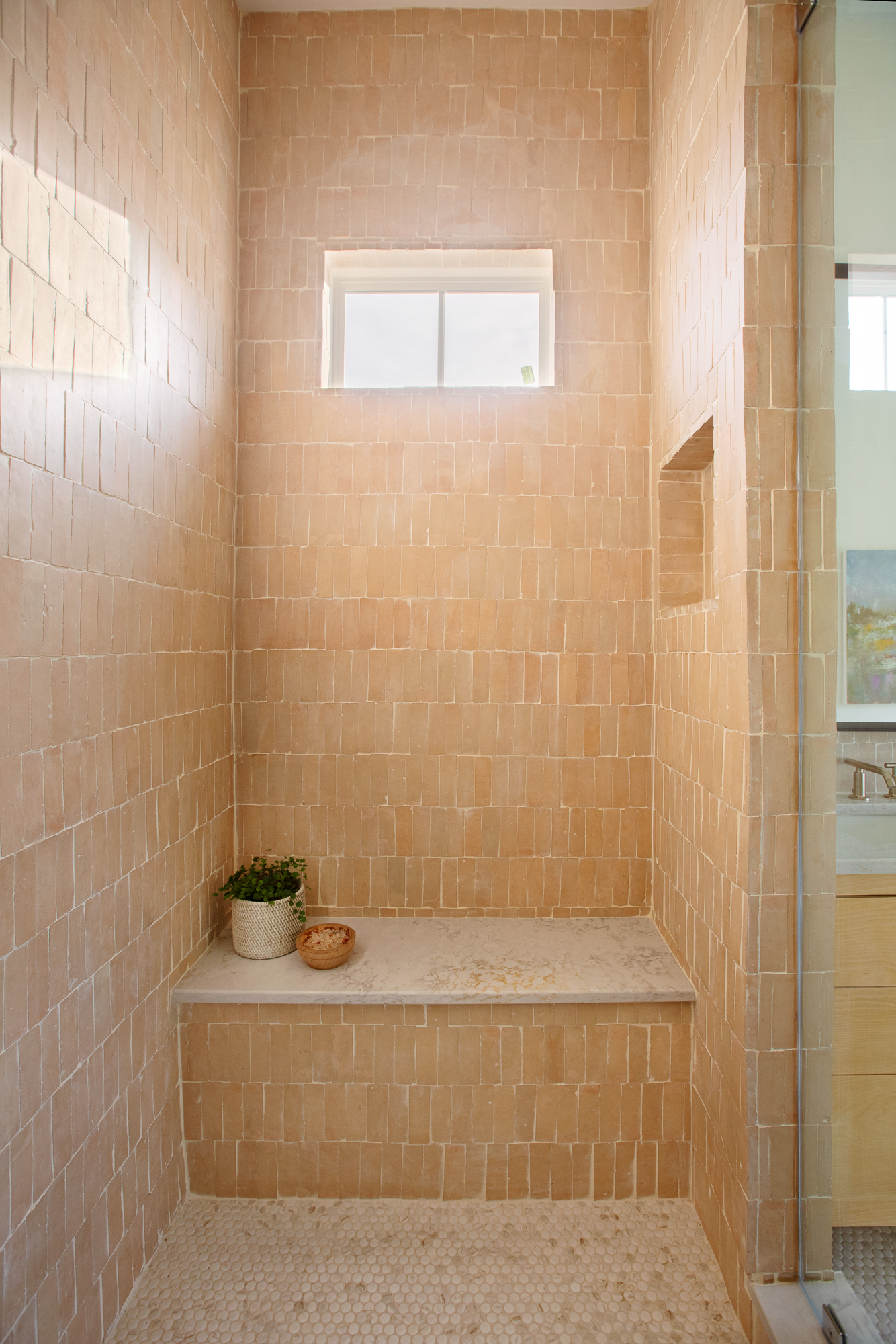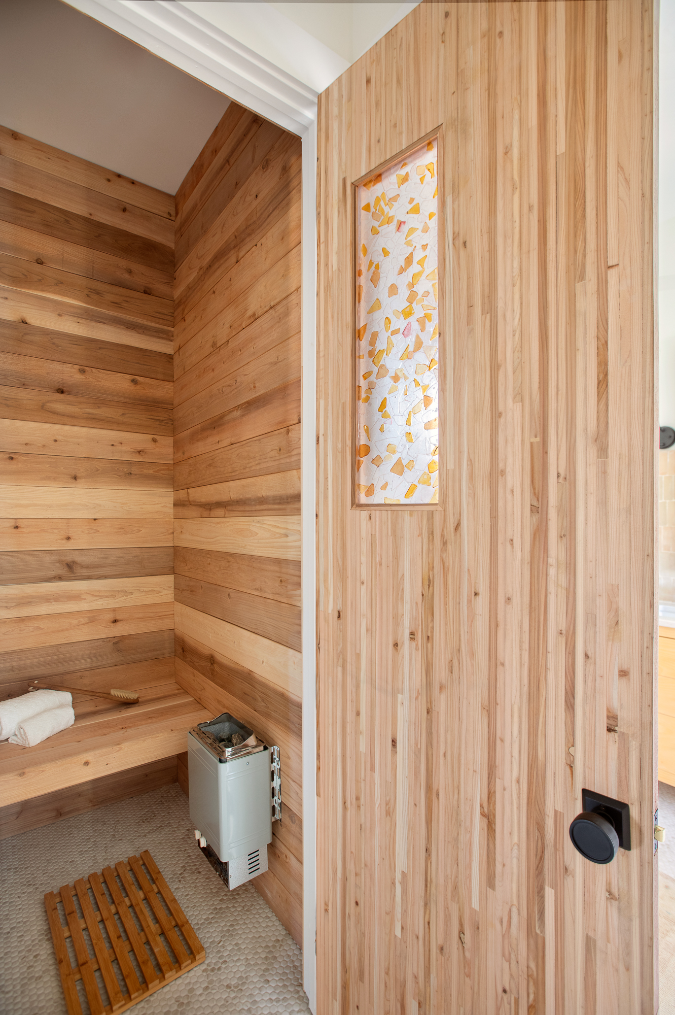 The main bath has more personal touches with the custom built vanity and hand thrown tile. I love how it feels like stepping into a high end spa. I’ve personally always wanted a dry sauna because of the health and relaxation benefits so this little luxury felt like the perfect addition to the main bath. When we were presented with the “Ty Challenge” and had the option for sea glass, we knew exactly how we would use it. Dave built the entire dry sauna, including the gorgeous door, and we made a custom sea glass window that shines the most gorgeous light into the space. It is truly unique and one-of-a-kind.