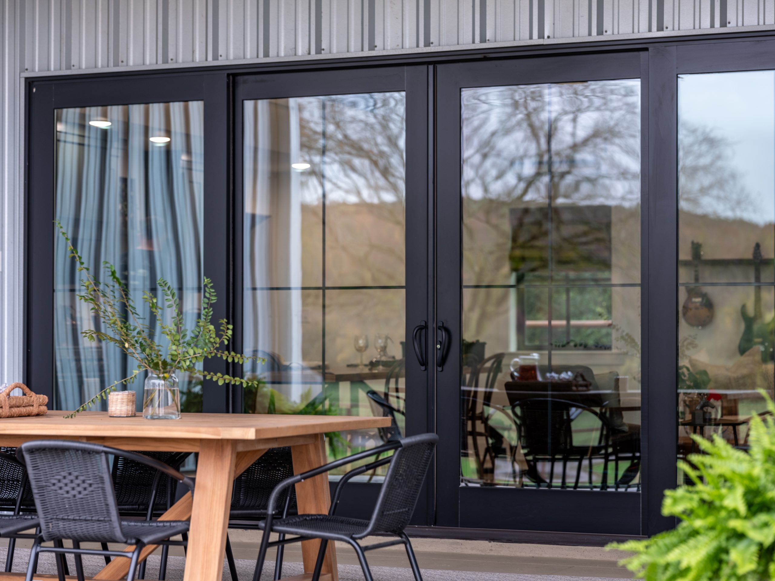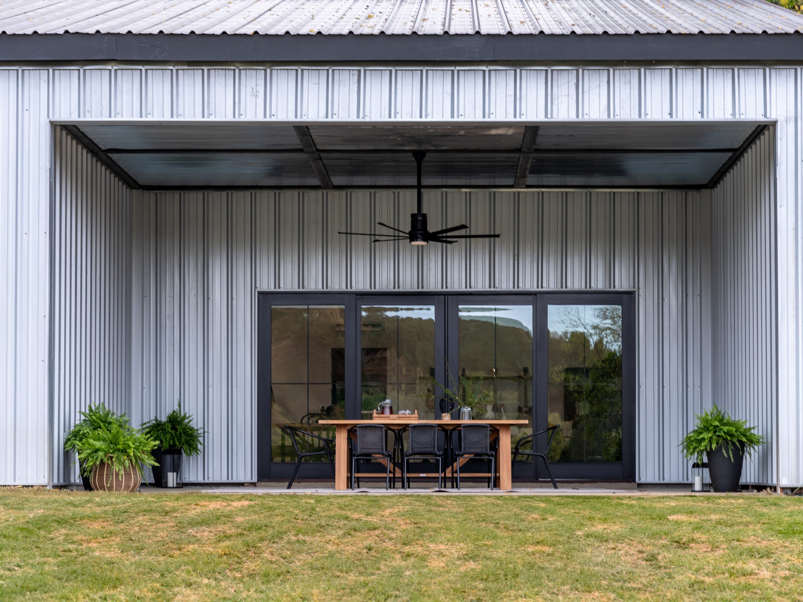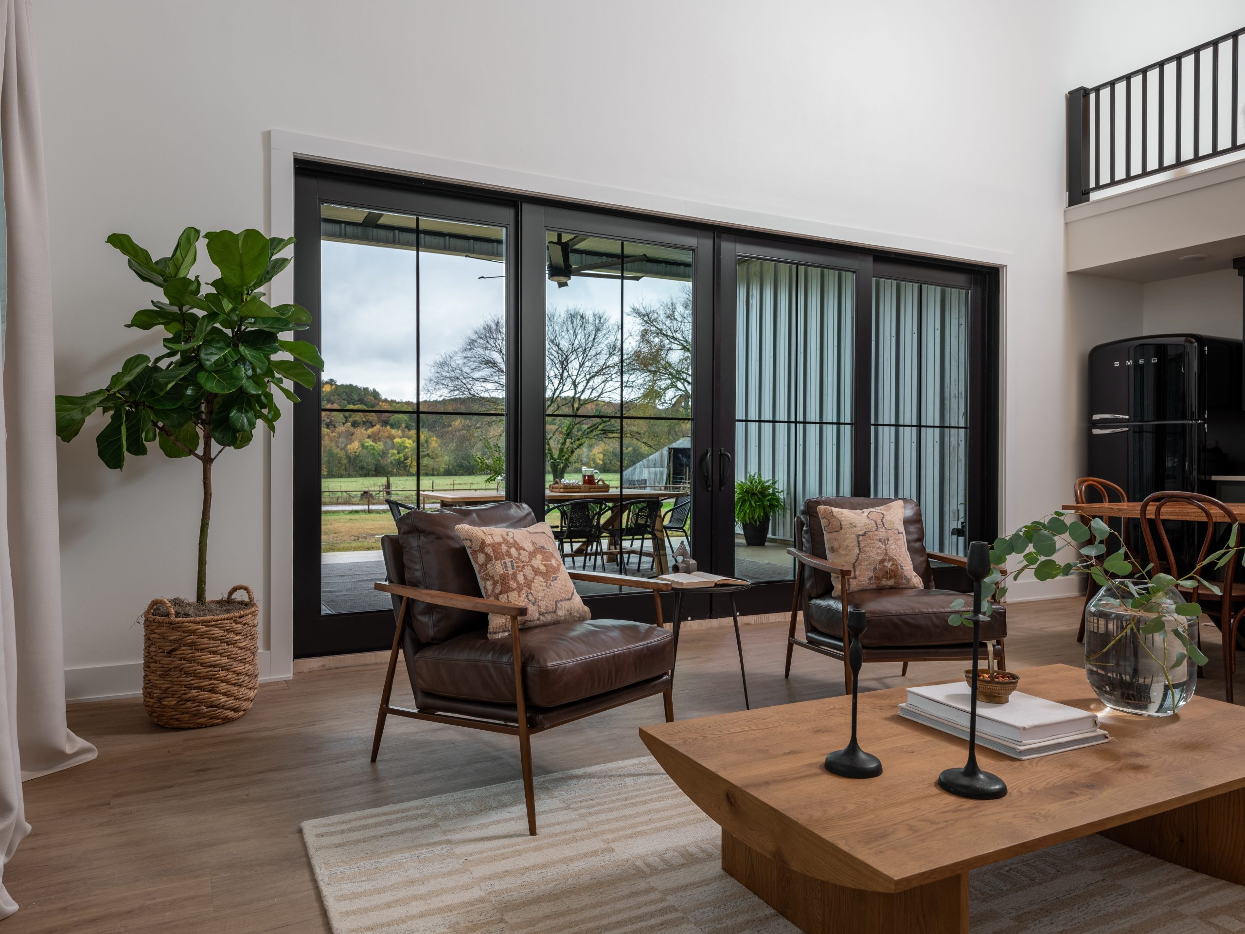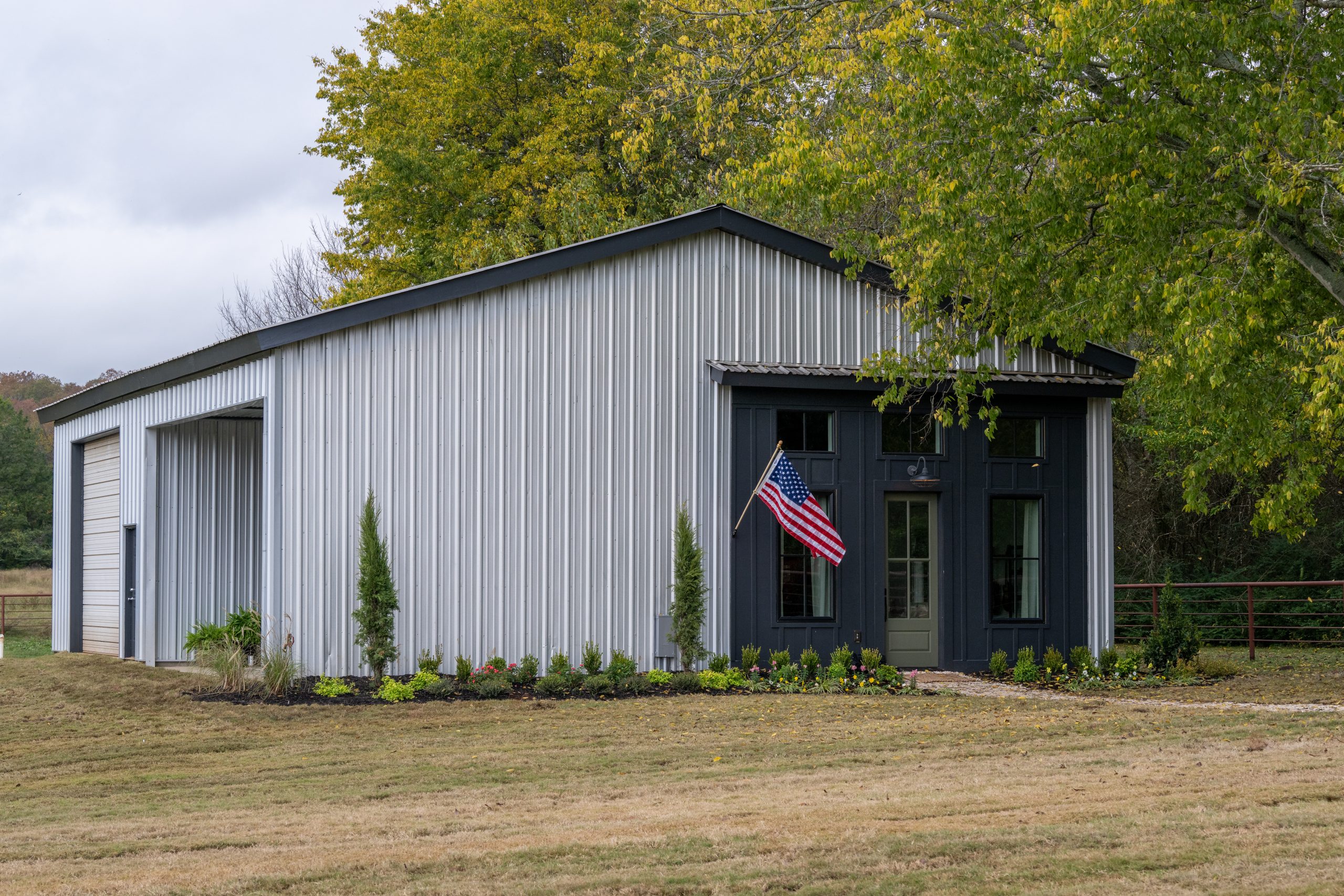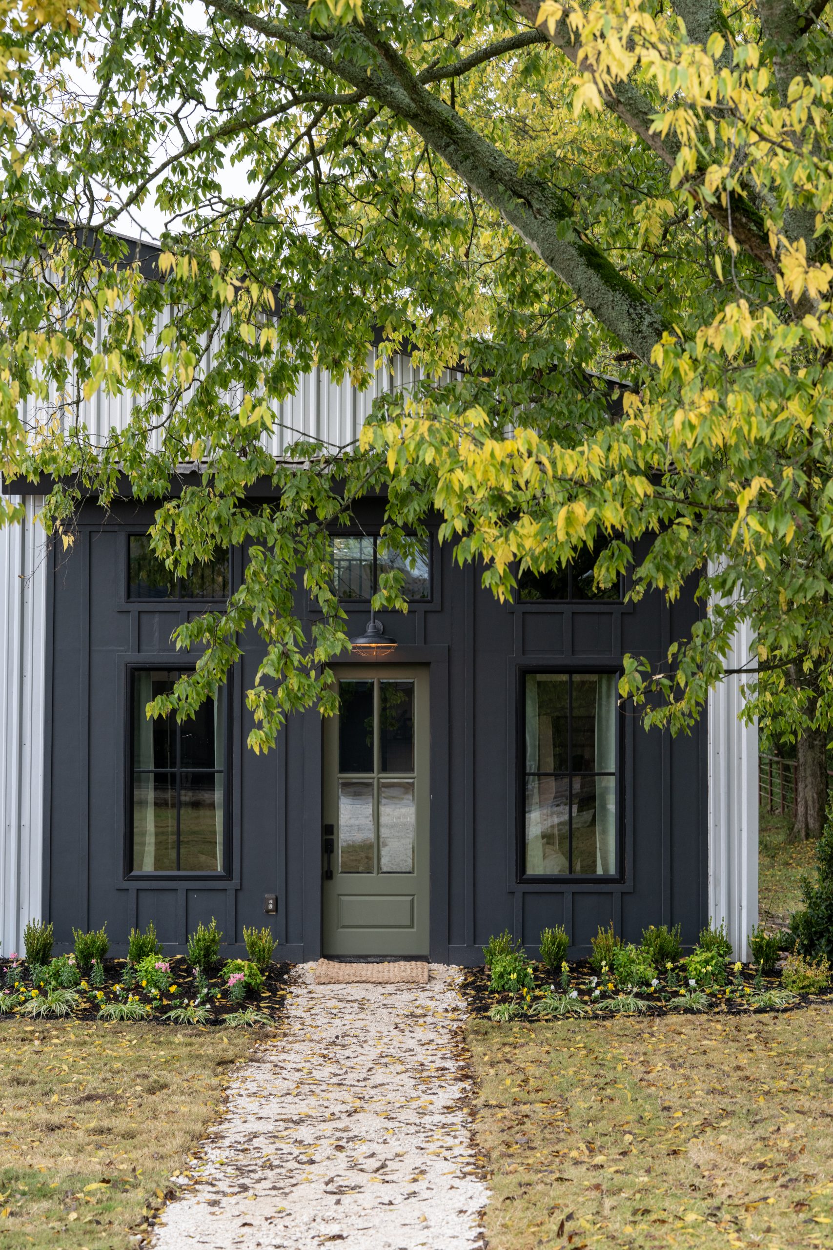 For the exterior of the barn, we added new siding all around, a new roof and a new front entrance. The front door and the sliding glass door on the side of the barn are both framed in black to create a bold contrast to the white siding and create a more modern look. For the front door, we chose a dark green color that matches the cabinets inside the barn, and made the entrance appear larger by adding black wood paneling around the front door. Last, we added new lighting and fresh landscaping.
