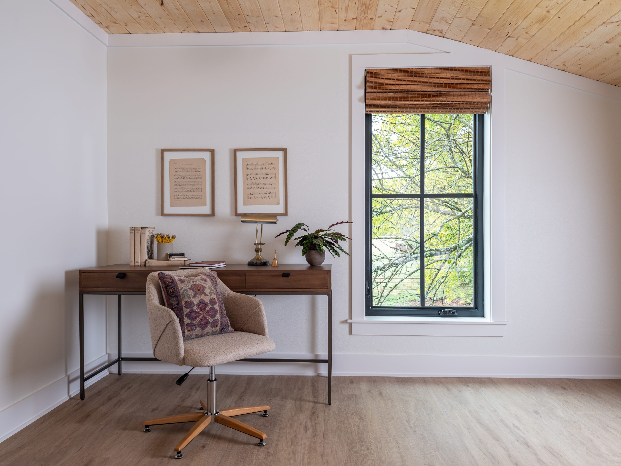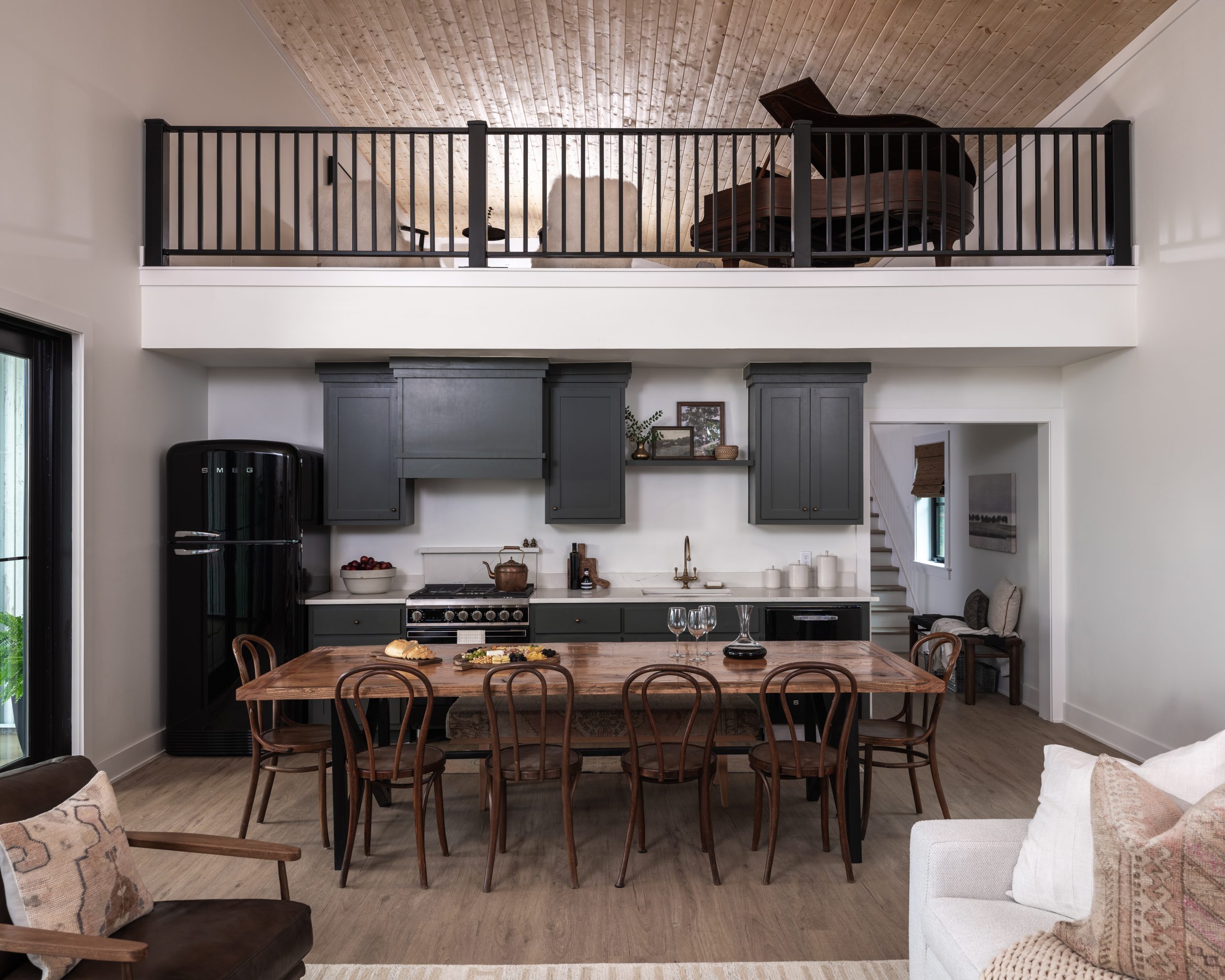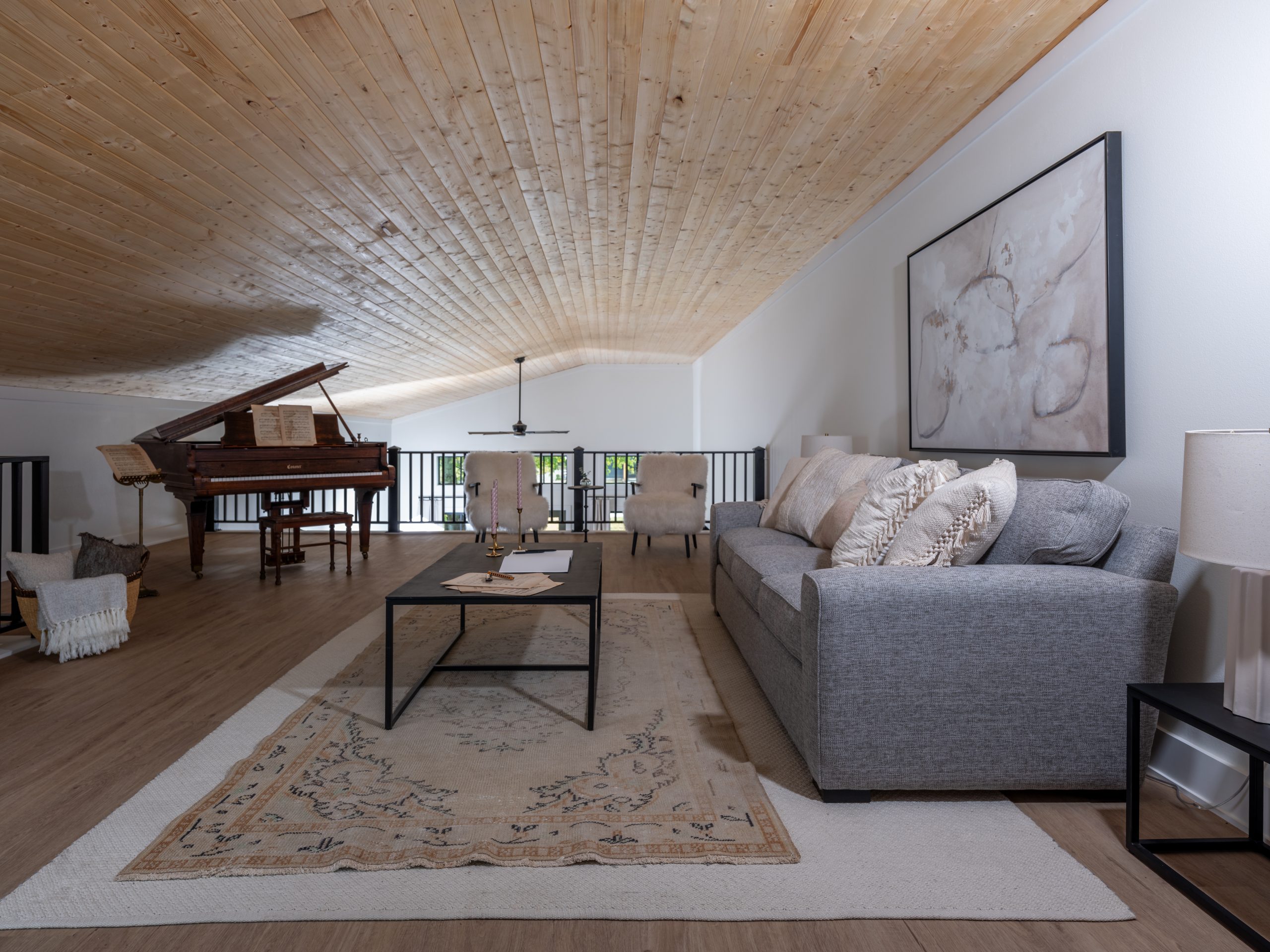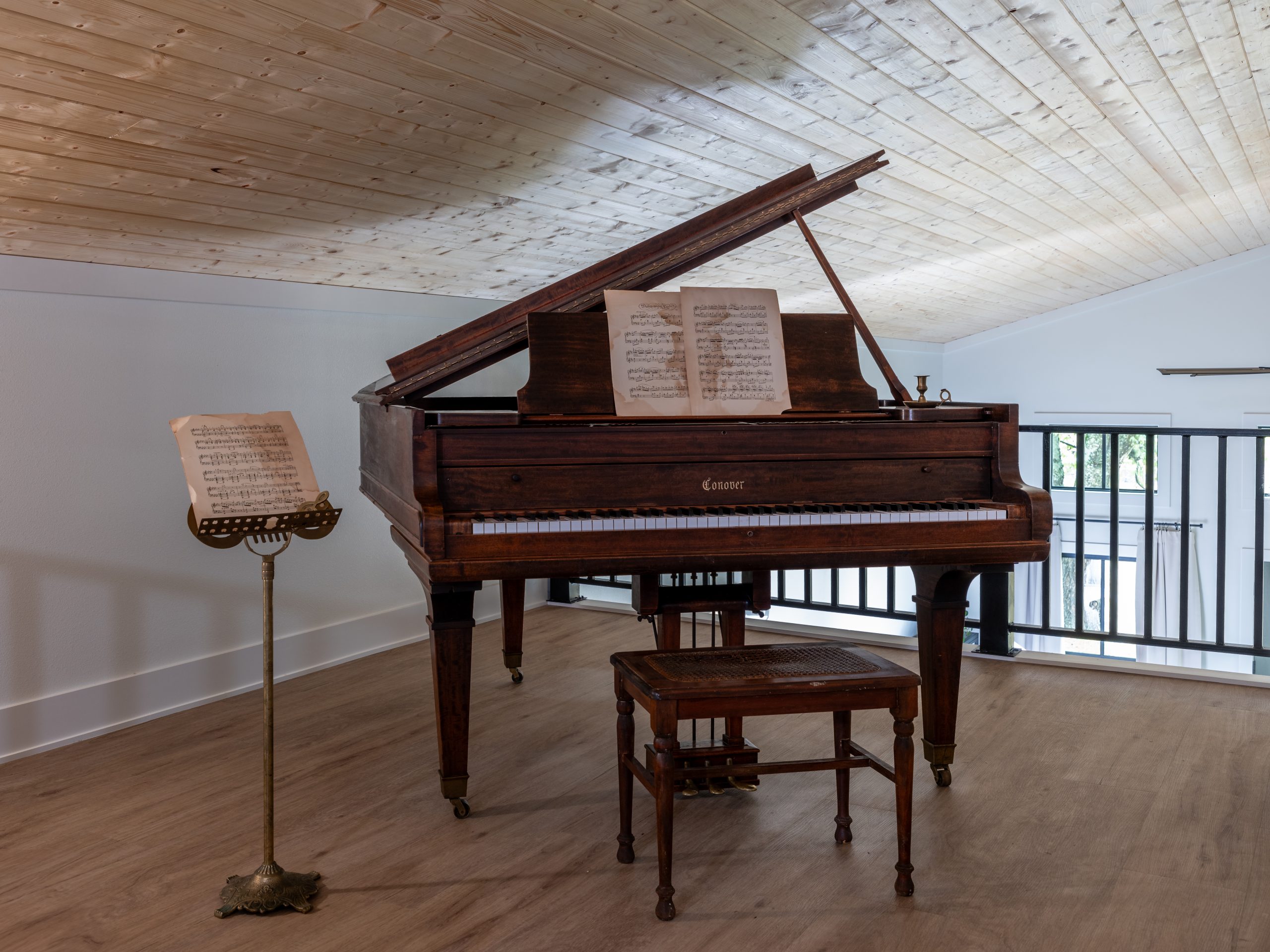 We added a staircase and a second floor with a large picture window overlooking the fields. The new loft has a space for guests to sleep, and it doubles as a writing studio. Shay had told us that Gabby would love a grand piano, so I found a gorgeous antique piano and the perfect spot for it. We put it near the balcony so she can look out the windows while she writes and plays.