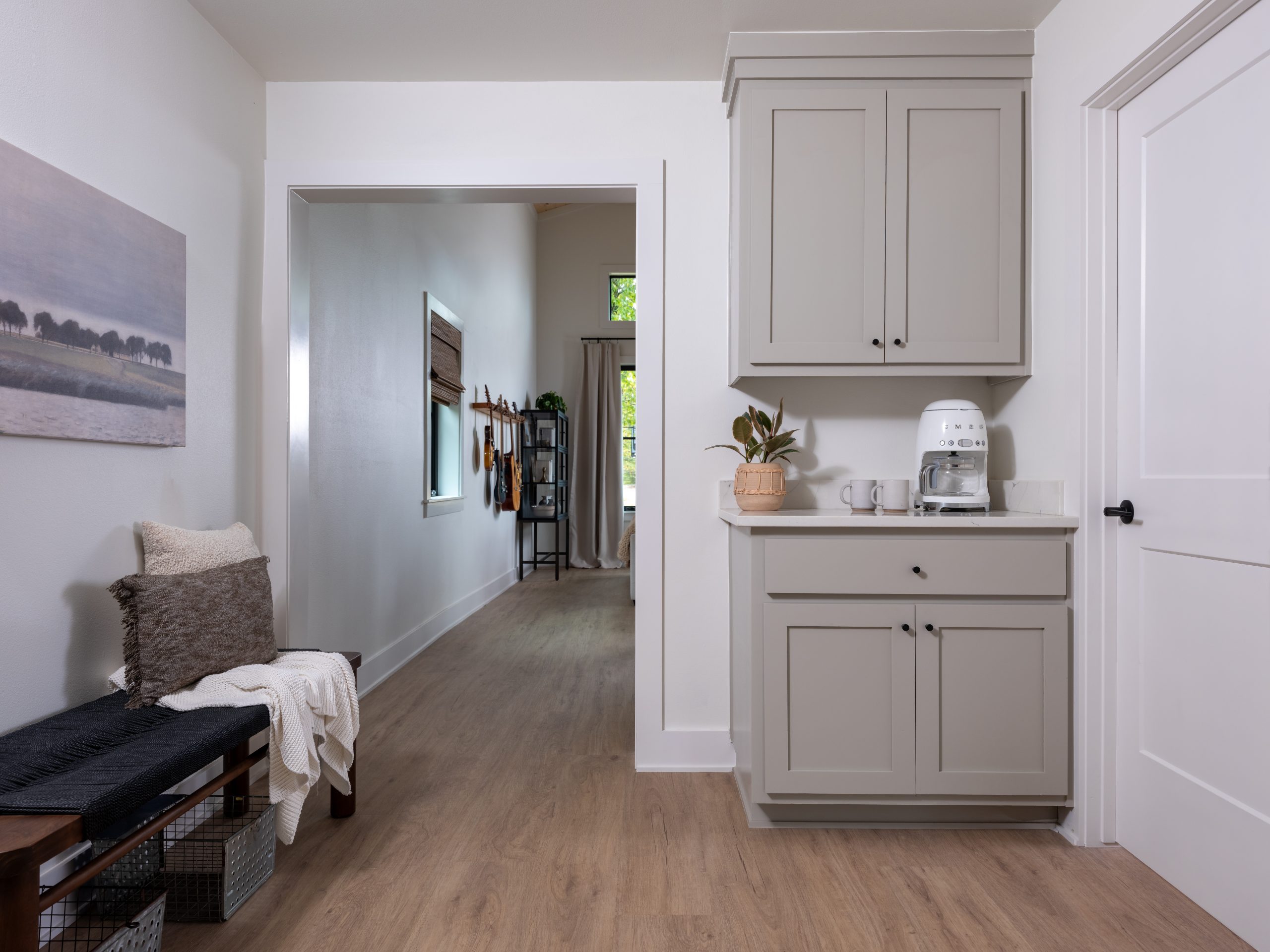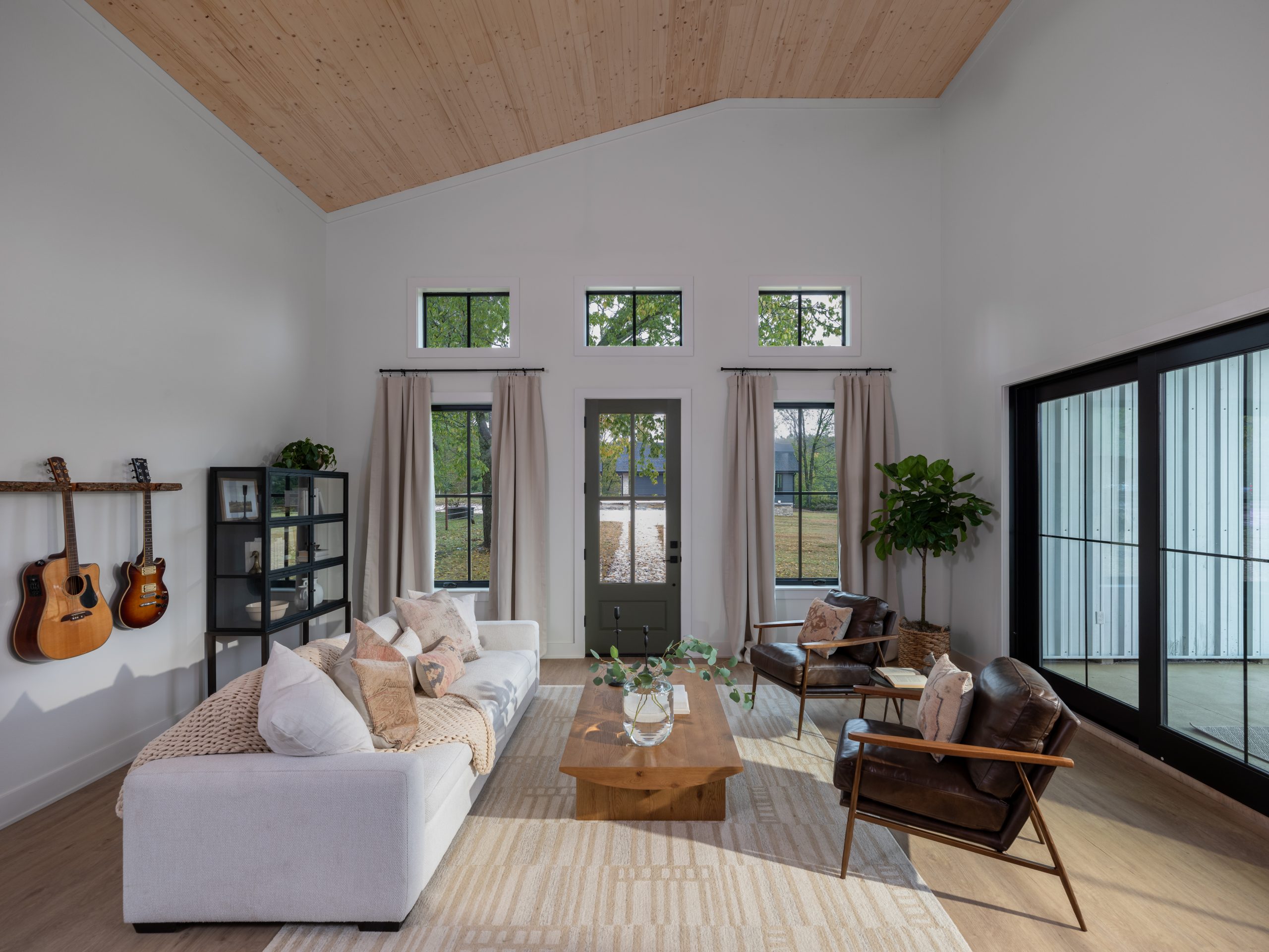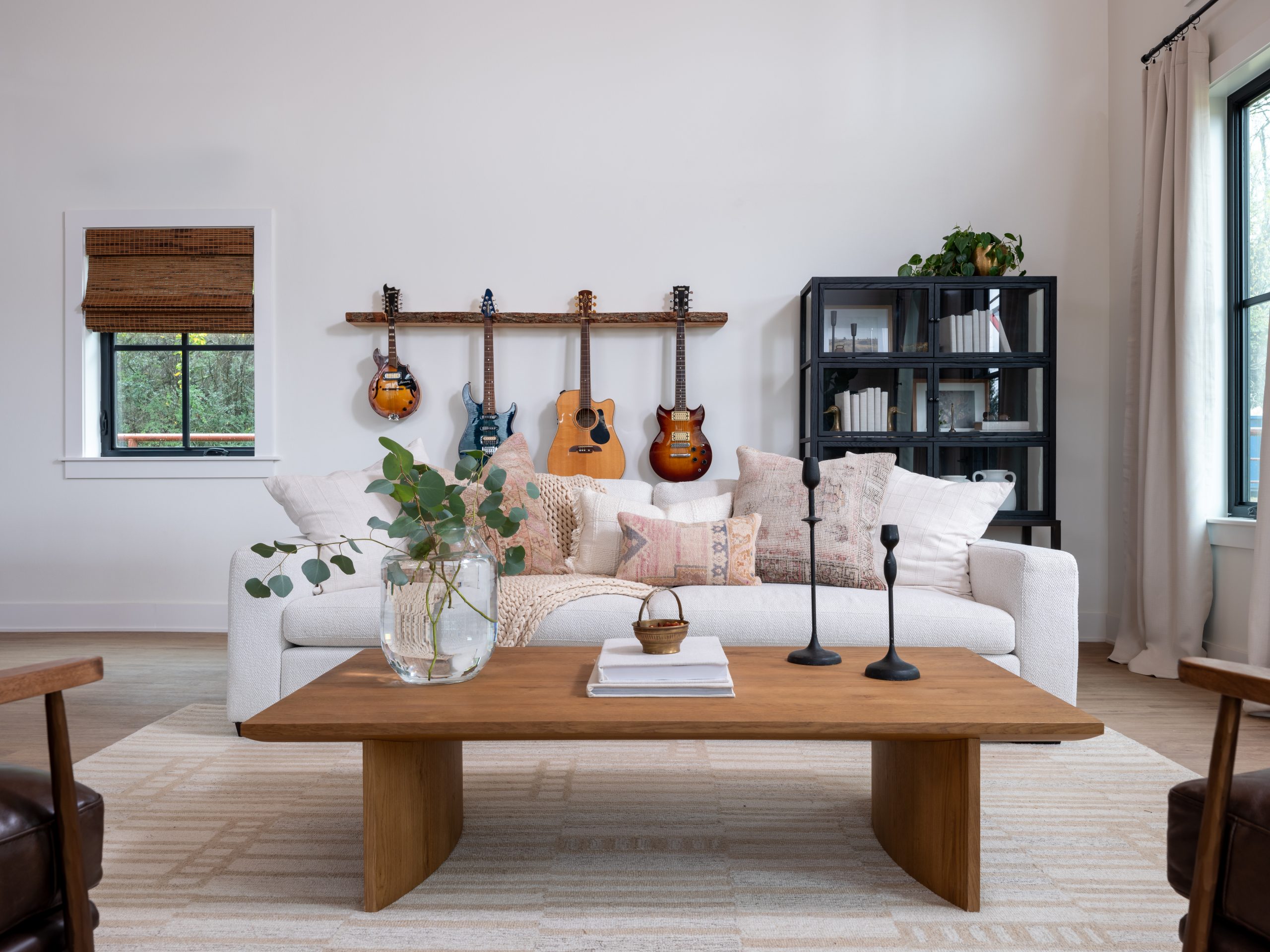 Before the remodel, the inside of the barn was used as storage space. Now, when you walk in the front door, you enter a modern, yet cozy living room with plenty of seating for guests. The barn’s high ceilings needed some detail, so we added wood paneling to honor the barn. The wood detail, fabric window treatments and the different textures of the rug and cushions all soften the space and make it cozy. For a special touch, Dave built a guitar stand to meet the mood and intentions of the space. Gabby can now hang her guitars and showcase them in a way that adds her signature to the room.