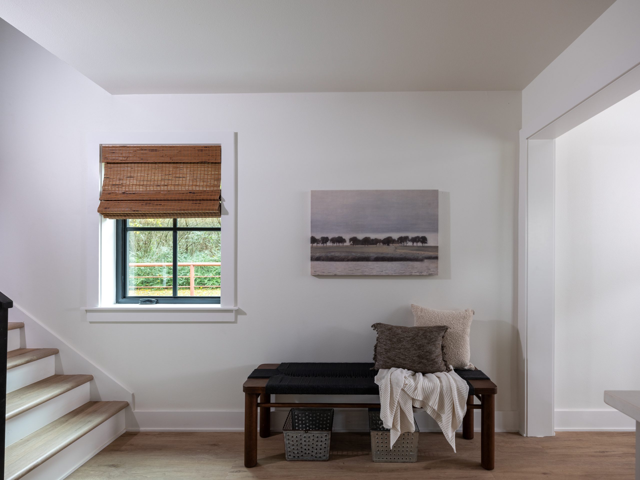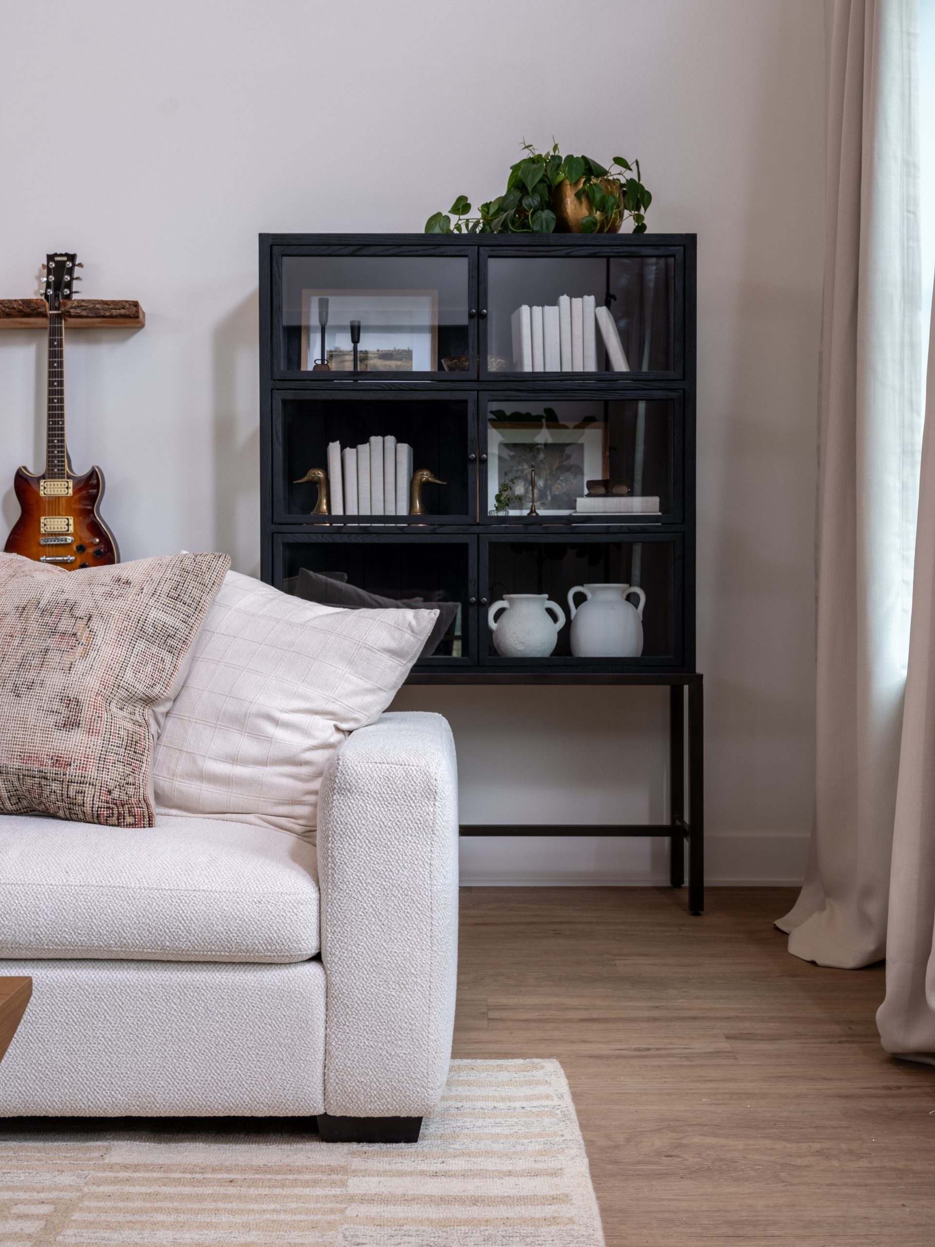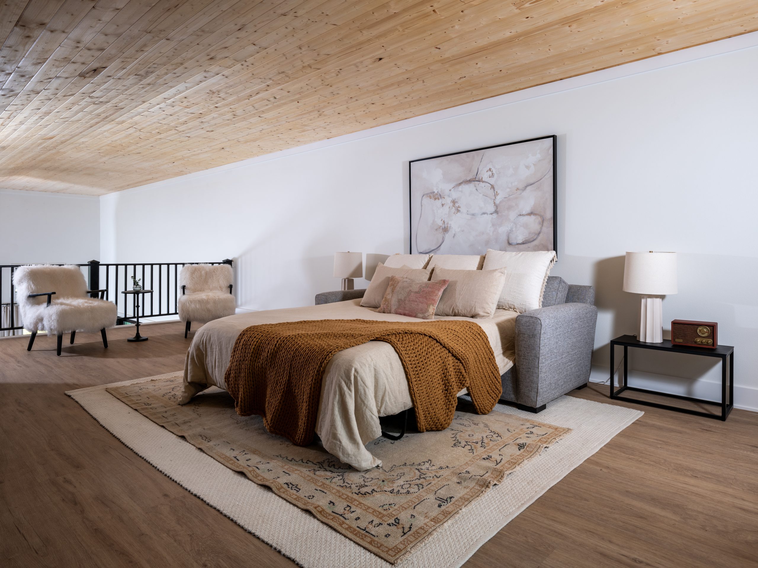 Before the remodel, the inside of the barn was used as storage space. Now, when you walk in the front door, you enter a modern, yet cozy living room with plenty of seating for guests. The barn’s high ceilings needed some detail, so we added wood paneling to honor the barn. The wood detail, fabric window treatments and the different textures of the rug and cushions all soften the space and make it cozy. For a special touch, Dave built a guitar stand to meet the mood and intentions of the space. Gabby can now hang her guitars and showcase them in a way that adds her signature to the room.
