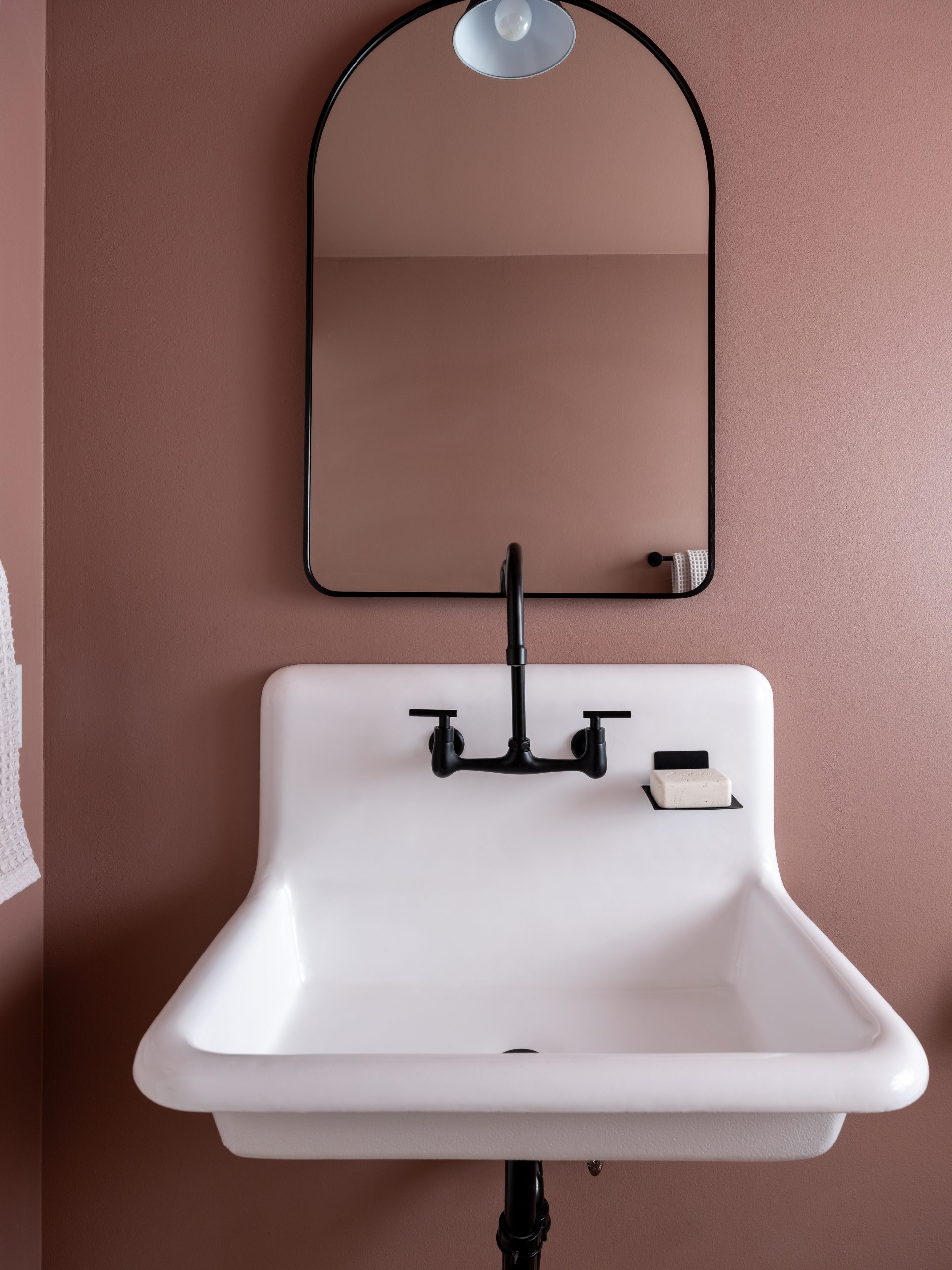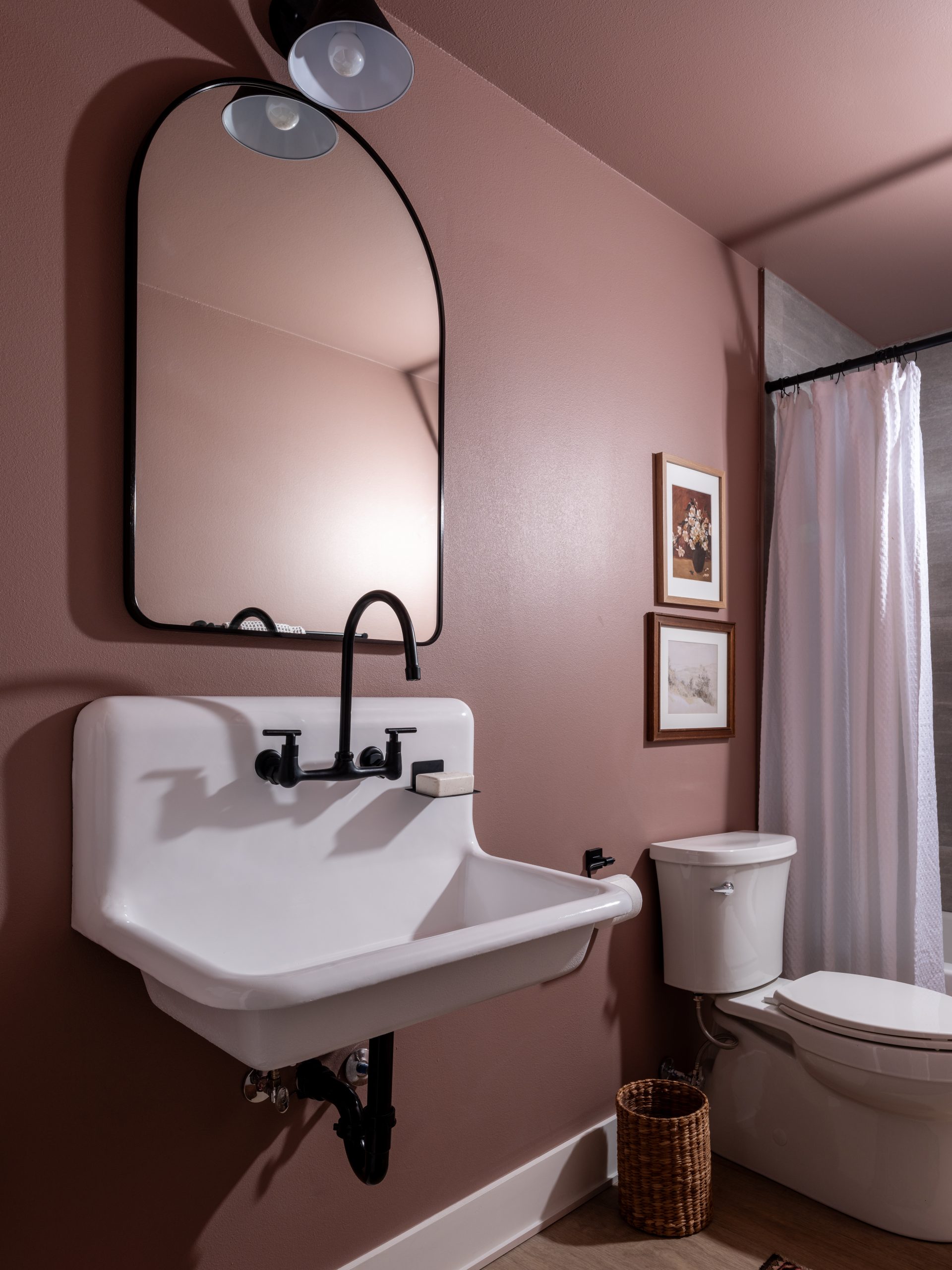 Since the barn was previously a large open space, we needed to build a dividing wall to separate the living room and kitchen from the bathroom and gym. The new bathroom is on the other side of the kitchen wall. Before we got started on the project, I had gone through the barn and found this old trough-style sink. It was pretty gross, but we were able to get it resurfaced and it adds so much character and is original to the barn. We built a full bathroom, complete with a shower. The fun pink color is a joyful touch that radiates Gabby and Graylan’s happy personalities.