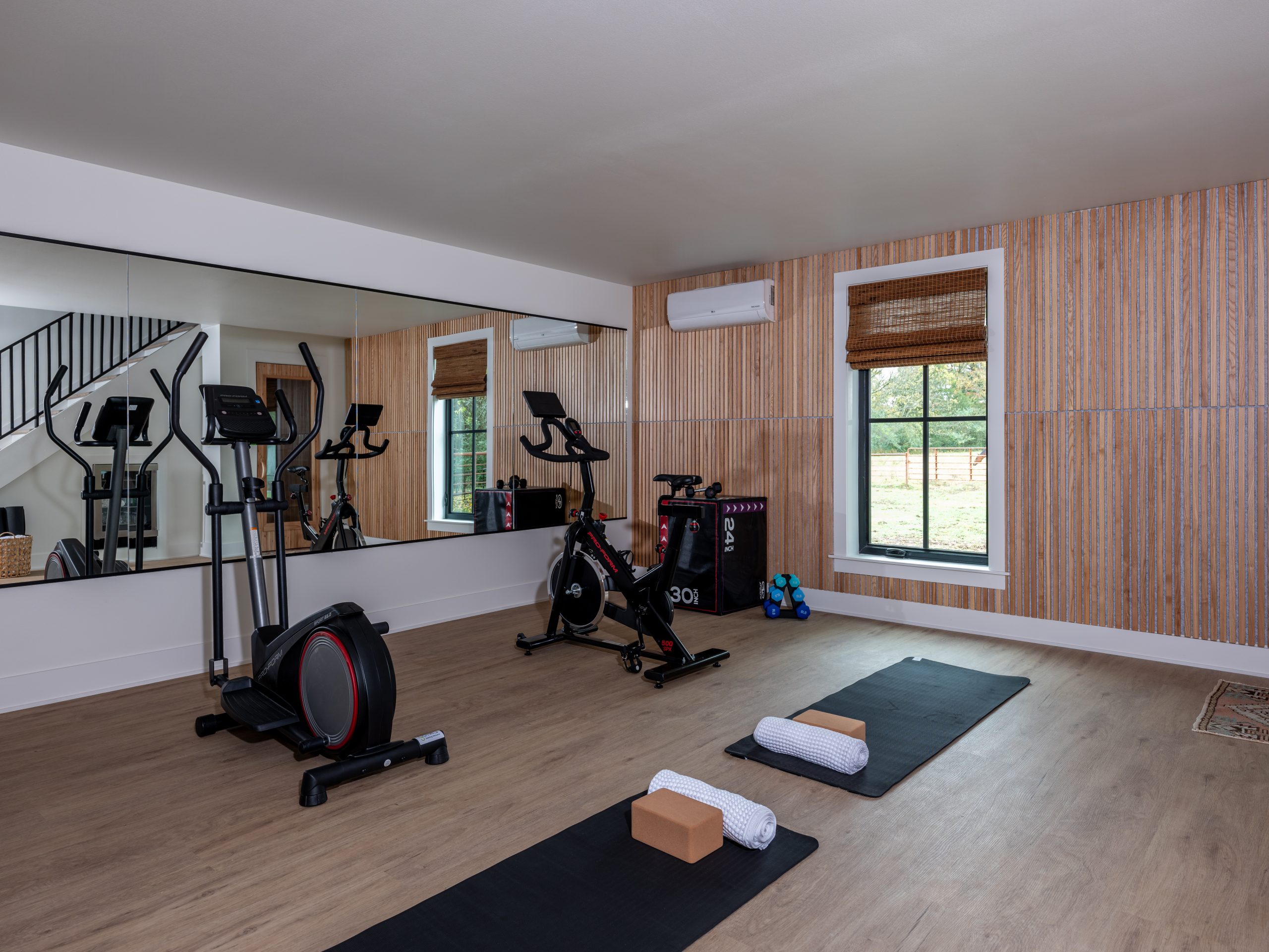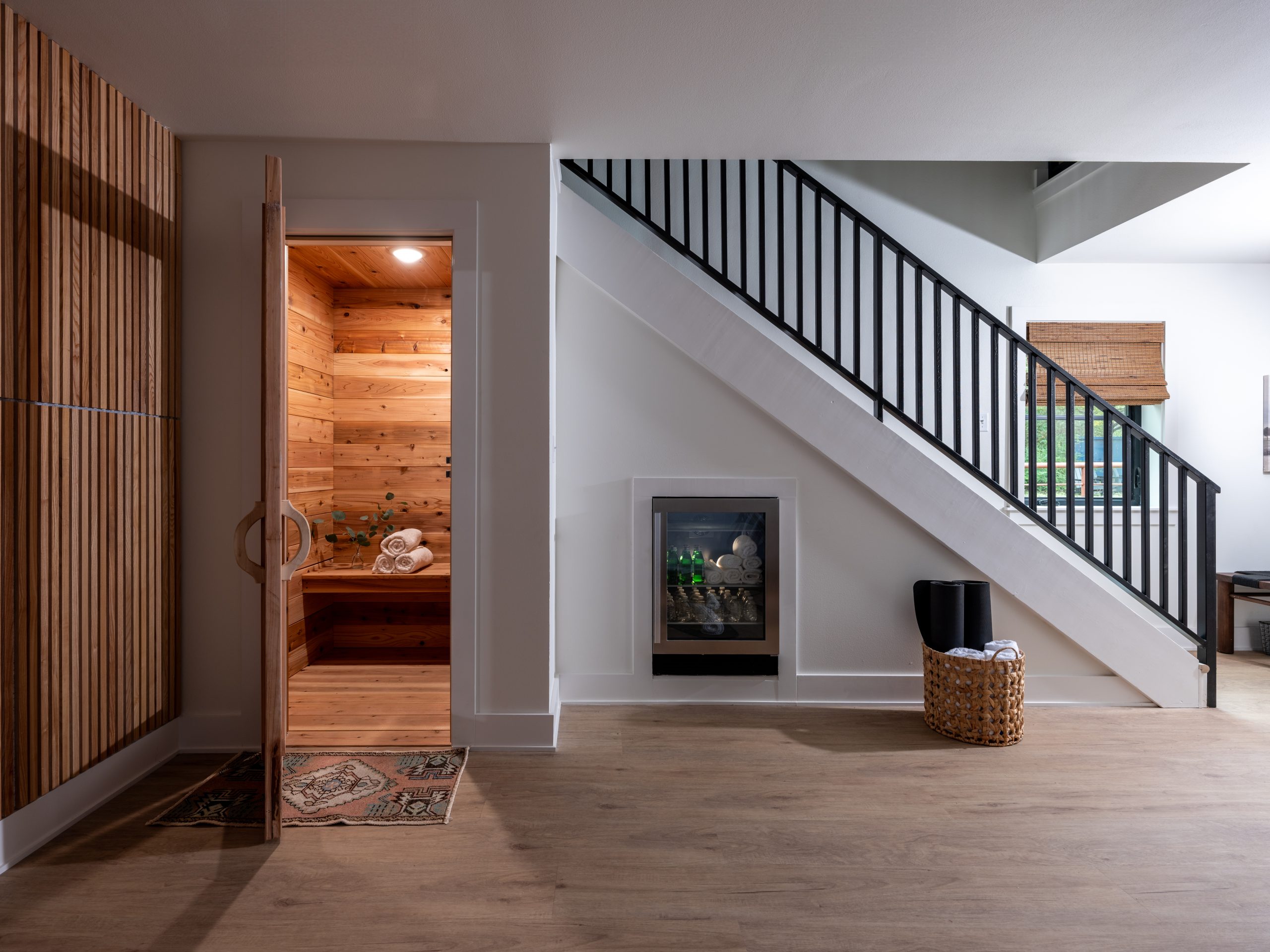 On the other side of the barn, we created a beautiful wellness spot for Gabby. She loves to work out and, with her recent surgery, she really wanted a space to focus on her health. We added wood paneling around the walls to create that spa feel, and Dave built a beautiful, custom sauna in the corner. It’s a perfect spot for her to relax in after a good workout. We also put mirrors along one of the walls to add to the intentions of the space and make the room look a bit bigger. Some extra touches include new workout equipment and a beverage cooler under the stairs.