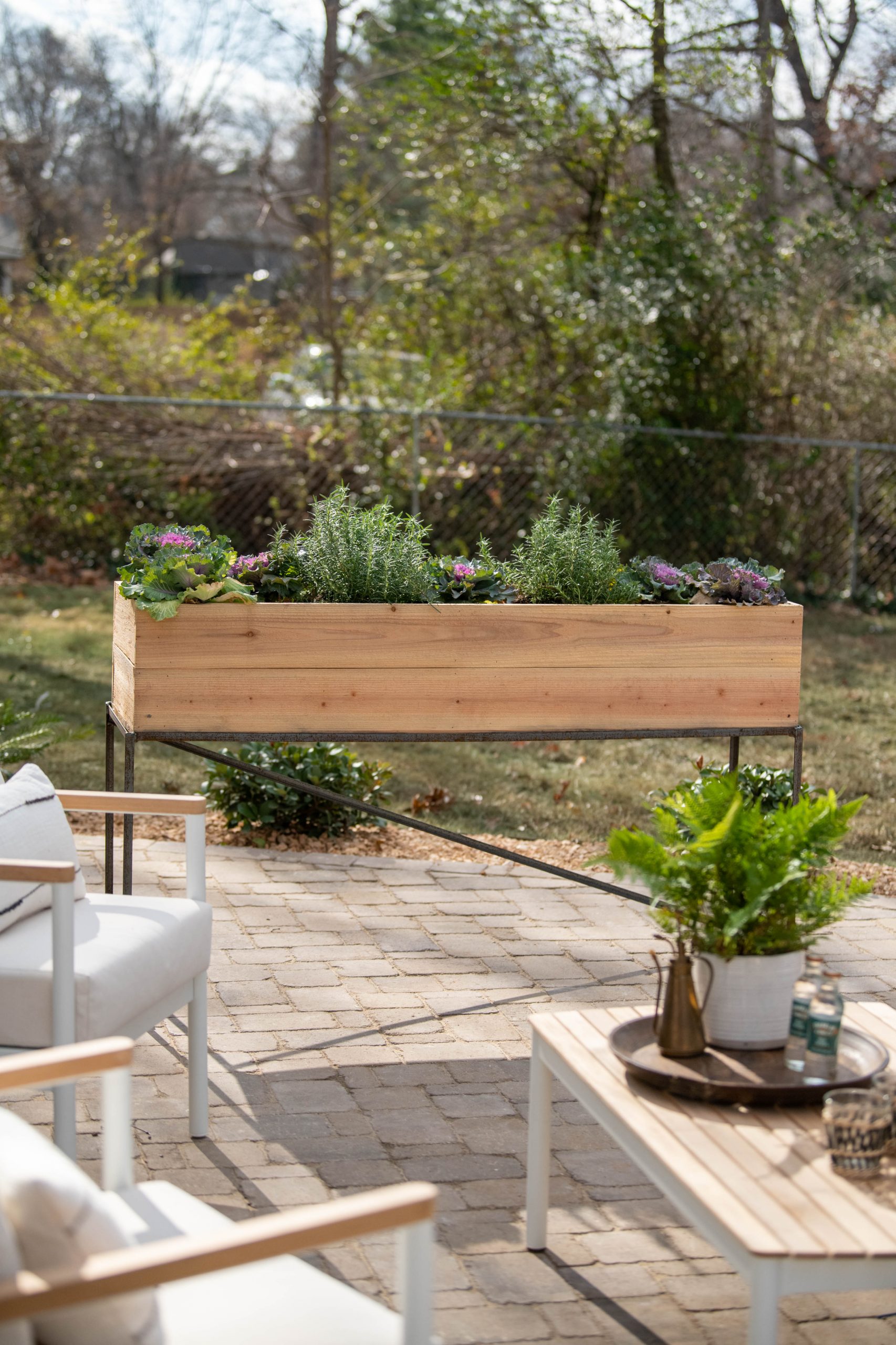 Dave also handmade raised flower beds out of cedar, which will last a long time and look great next to the tumbled pavers. Lastly, we created a little sitting area in the backyard in honor of Denise’s mother who passed away during the time we were working on her house. Dave made a bench using salvaged wood from our stock, and we added a tree next to the bench. Denise’s mom loved cherry trees. Now, they can sit and remember her in this quiet spot.