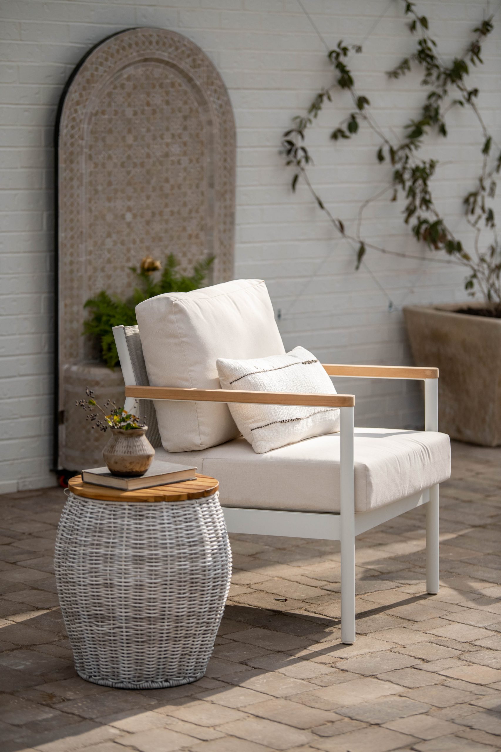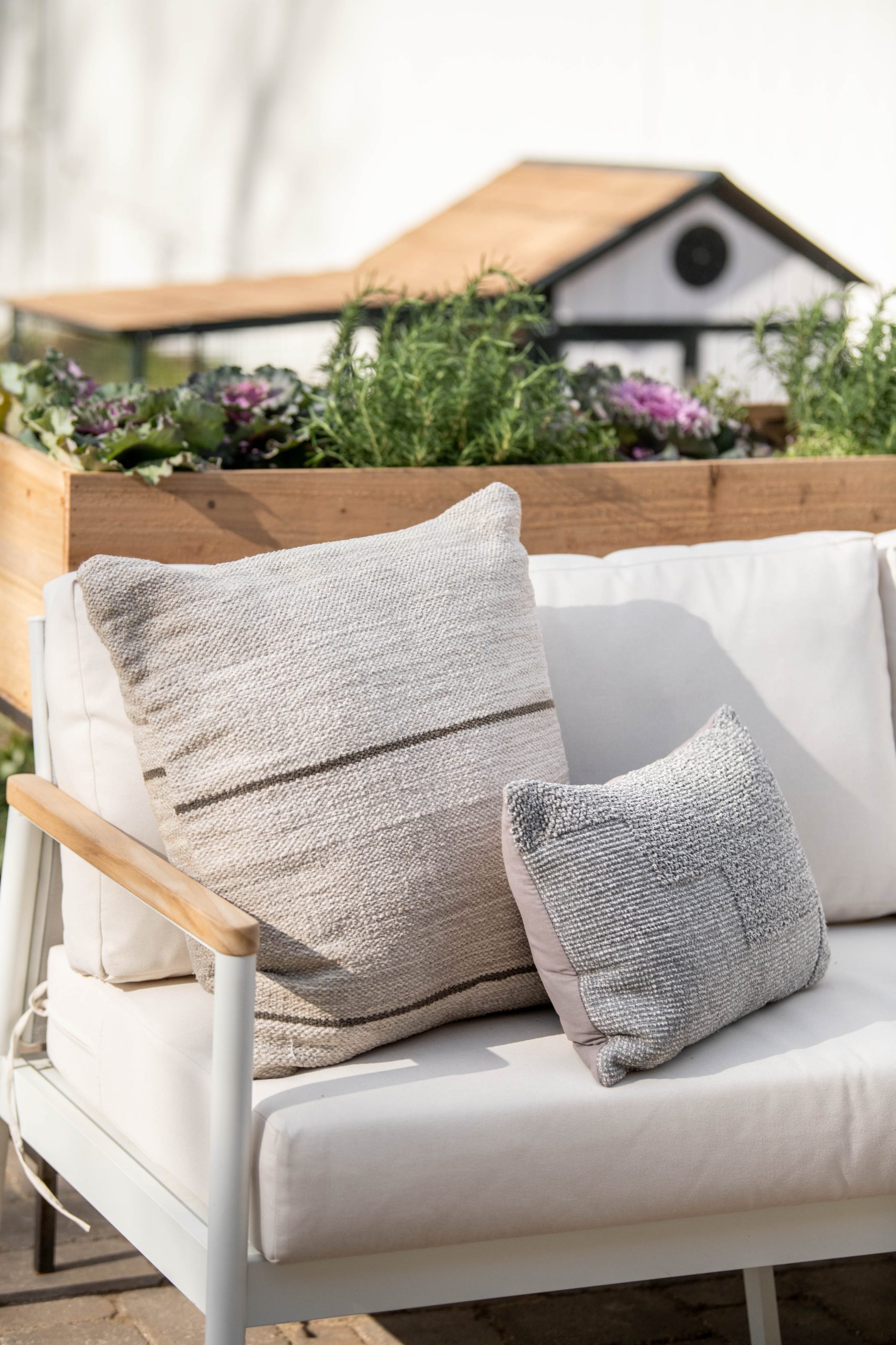 We removed the overgrown bushes, replaced them with new landscaping and added lots of beautiful flowers. A fresh coat of paint goes a long way. We chose a soft white shade for the brick and also made the entryway more welcoming by creating a front sitting area. Dave replaced the old post with a warmer natural wood post that coordinates with the new shutters. If you watched the episode where we did my sister’s house, you’ll see the huge tree where we got this beam from. Lastly, we installed new lighting and a new warm wood front door.