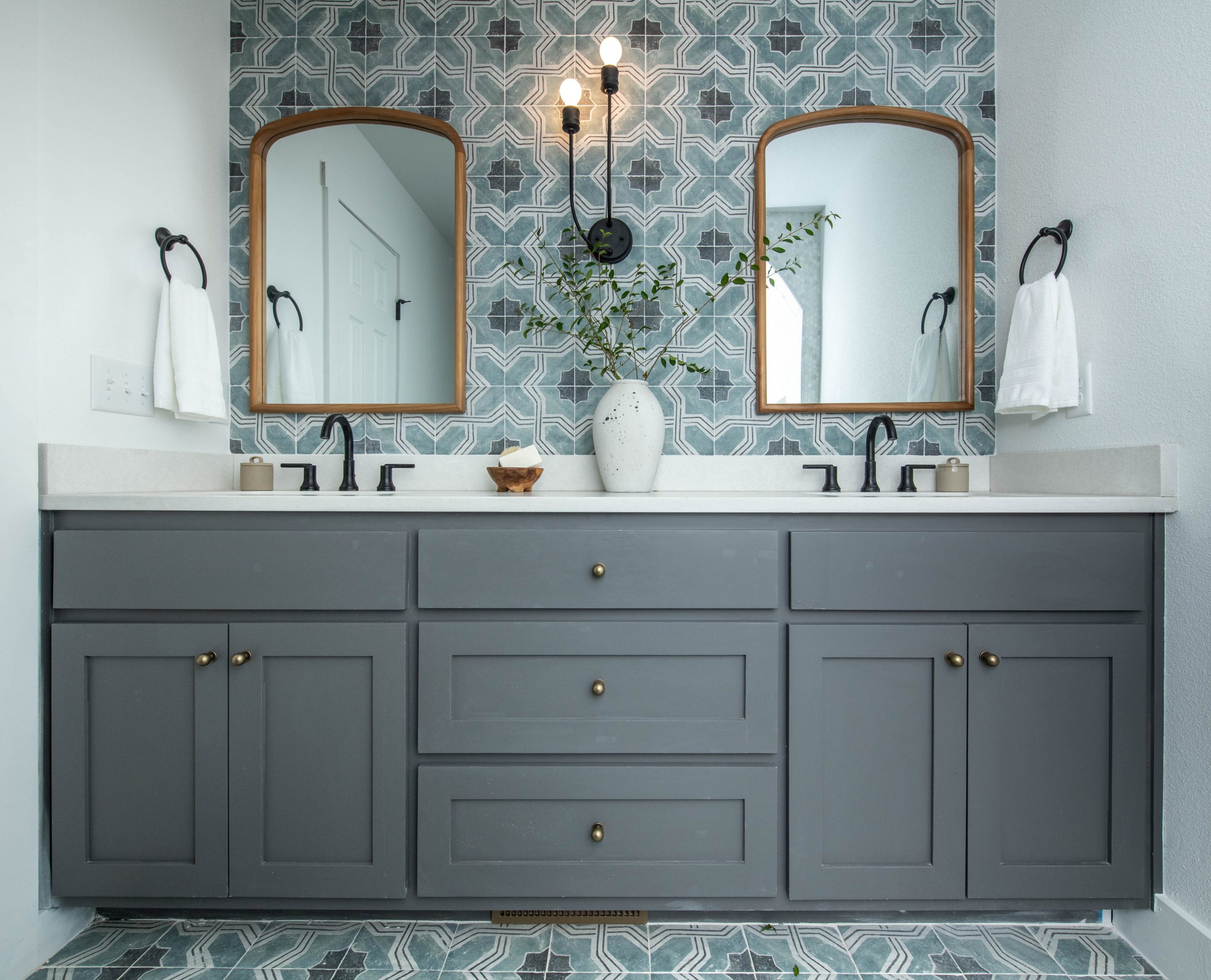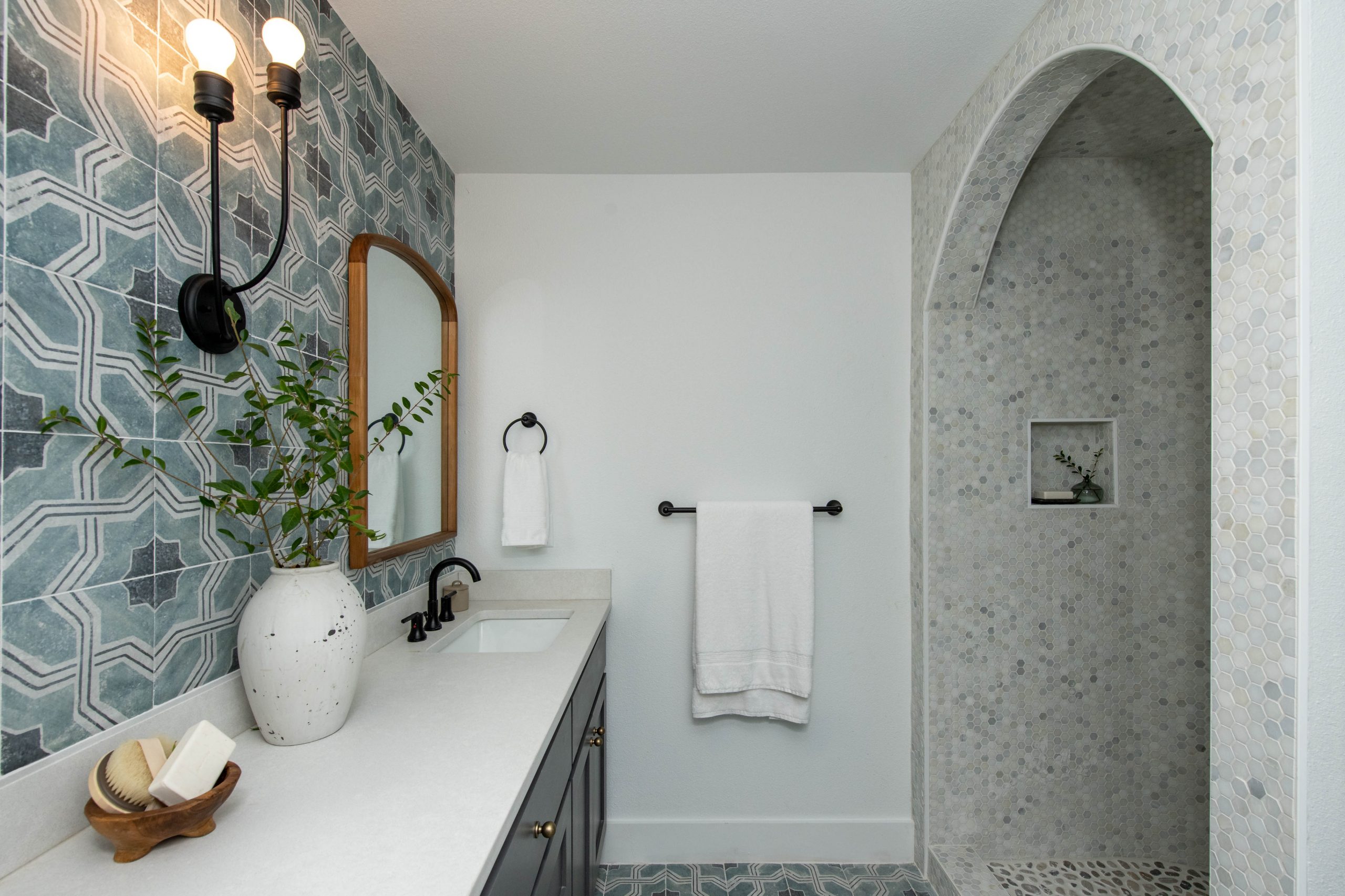 Since there was a second bathroom available near the main bedroom, we were able to attach it to the main bedroom and turn it into a master suite. Pepe and Denise wanted to get rid of the bathtub, so that gave us some extra space to reconfigure the layout for a large walk-in shower, double vanity and better closet space. We wanted to have a little fun with the bathroom and bring in a Peruvian feel with the tile choice. The blue accent colors go beautifully with the arched shower wall, reminiscent of dome shapes you see in Peruvian homes. The pebble floor tile in the shower feels very natural, while the marble hexagon tile on the shower wall looks amazing.