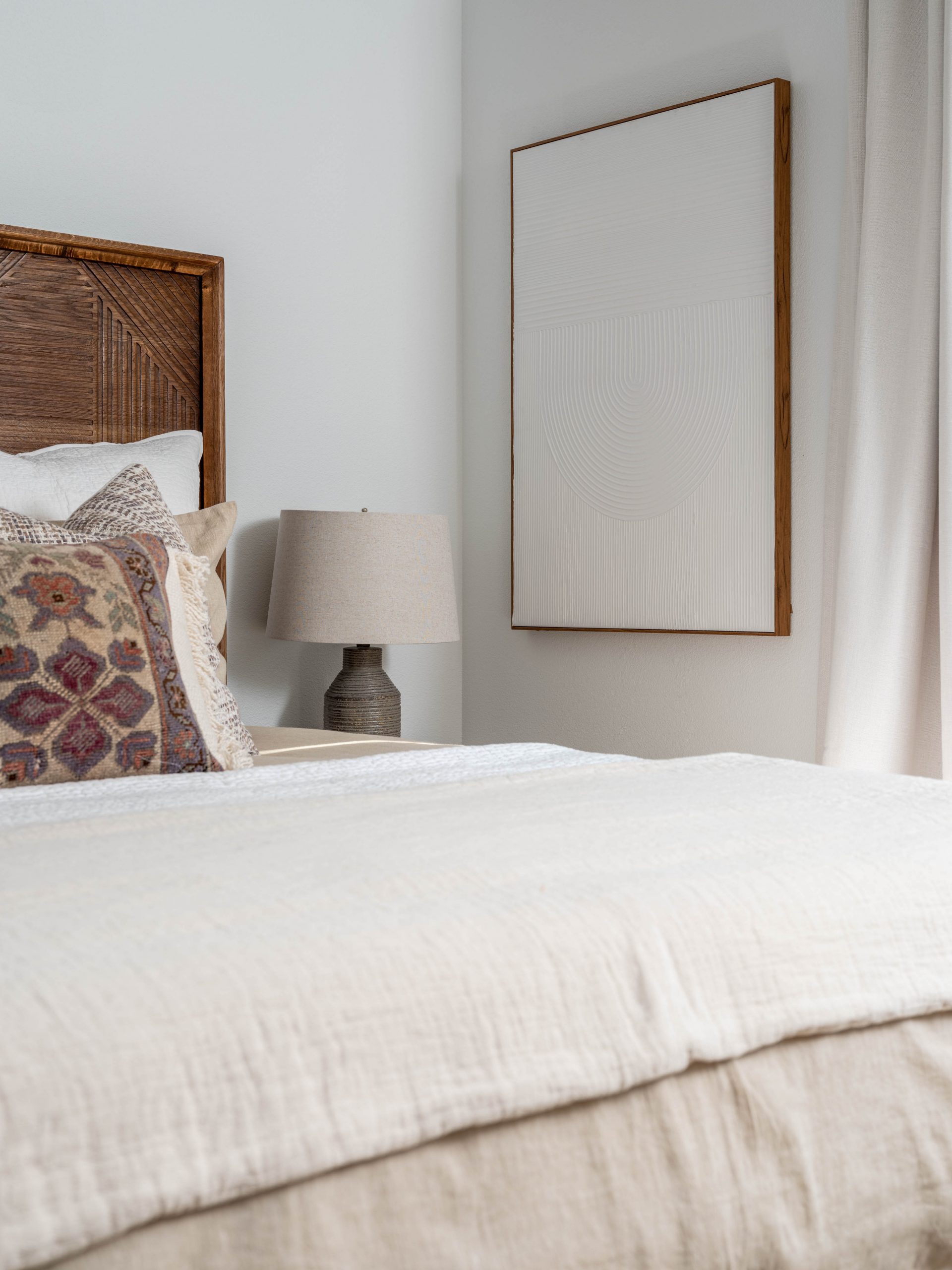 For the bedroom area, we kept it serene and peaceful with a calm paint color and we brought in some texture with woven shades and the bedding. We also added new flooring and new lighting.