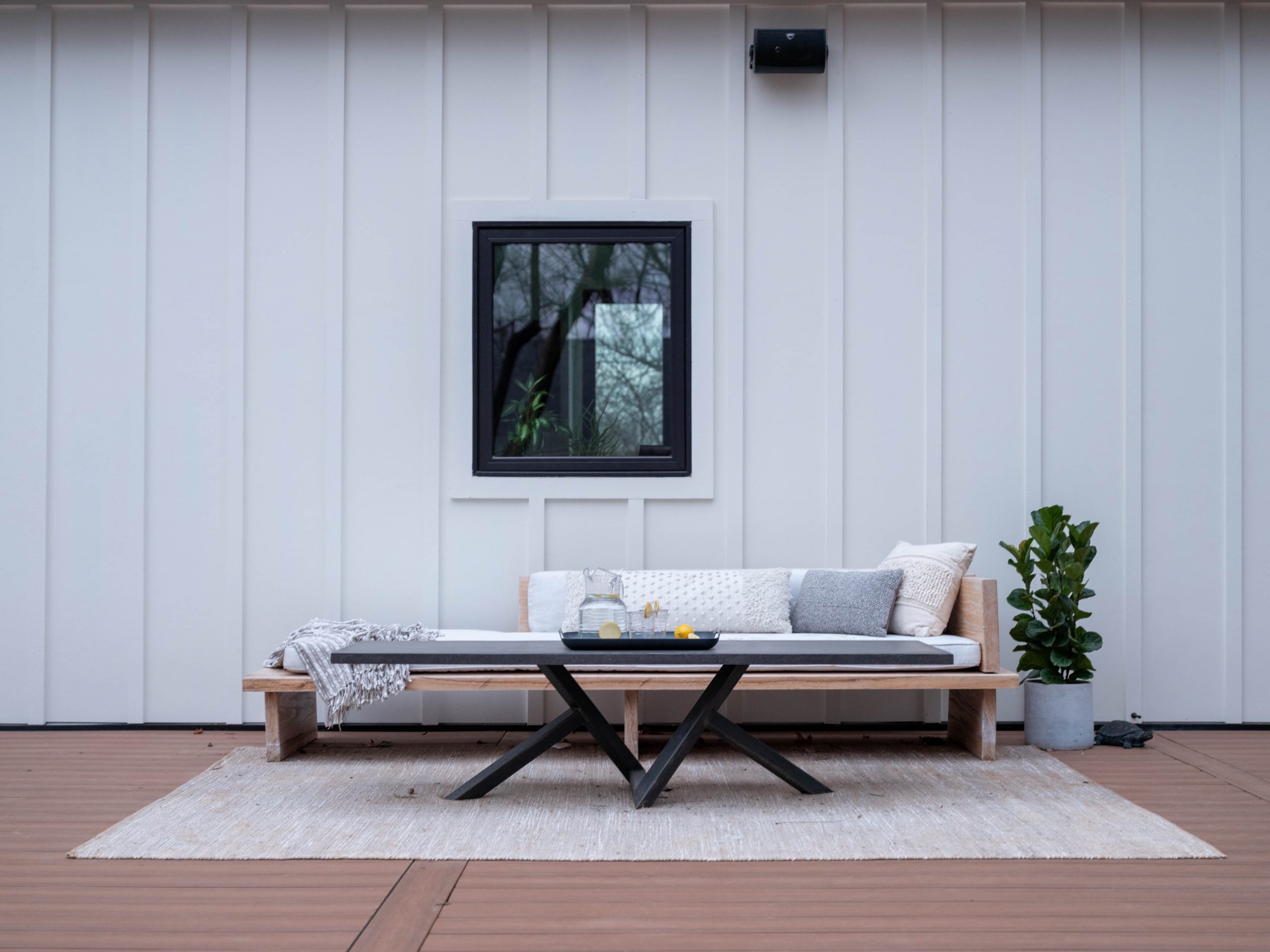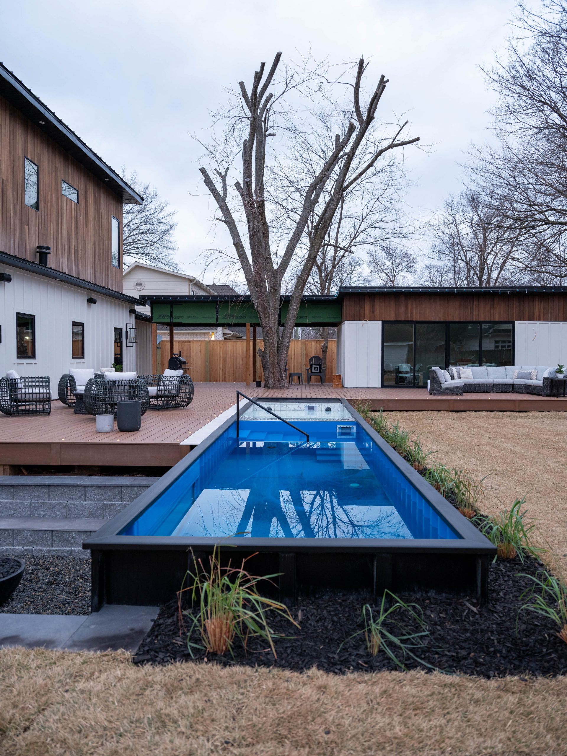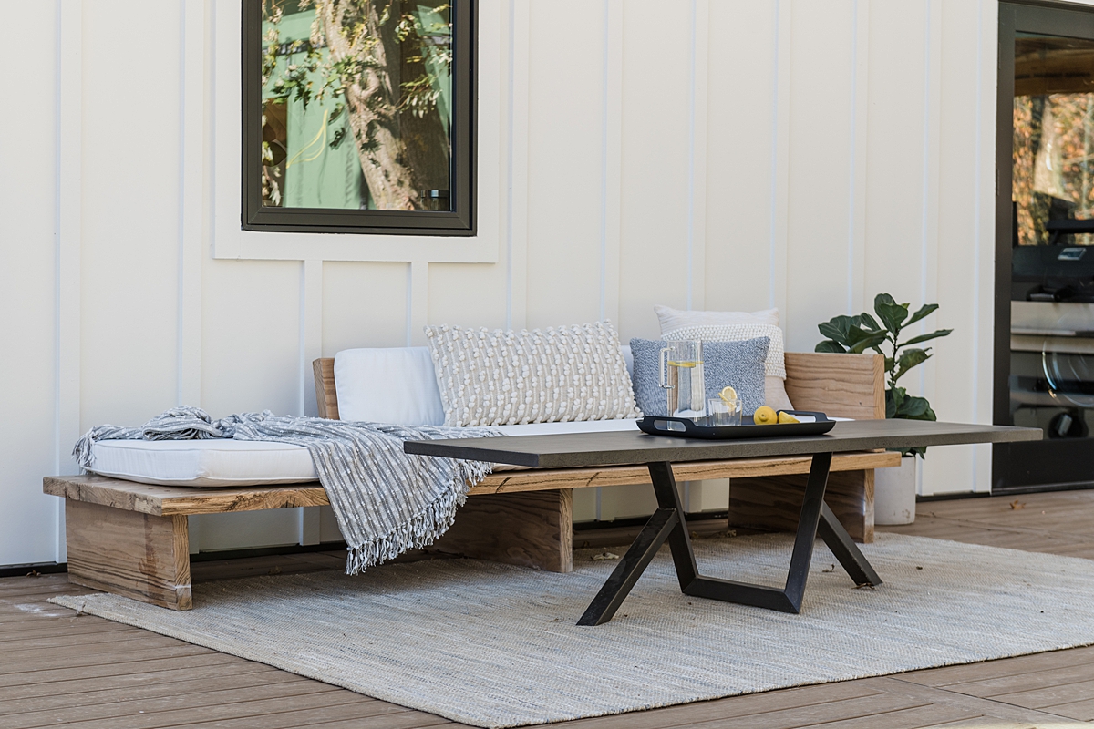 When Dave and I first got a glimpse of the yard, we immediately agreed this was the most hideous yard we had ever seen. Ha! After clearing out all the tree parts and mud, Dave was able to salvage a lot of the wood, which he used to build a bench for the backyard and the surfboard we put in the game room. We had a container pool delivered and built a moisture shield composite deck all around. New patio furniture and a coffee table made by our concrete artisan friend, Jason, complete the backyard as an outdoor entertaining space.