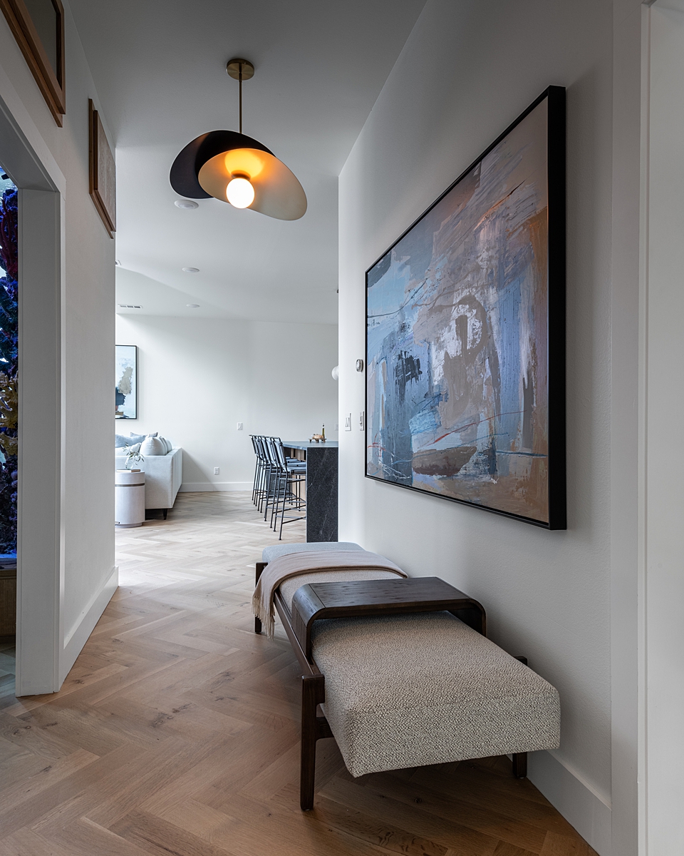 A little peek into another space we weren’t able to share on the episode (for time’s sake) is Rob and Angie’s new office / entertaining bar. I love the deep hue of this tile and the way the entire space feels like I’m stepping into an episode of “Mad Men.” It’s a very cool spot! It’s also at the end of my favorite hallway in the house – featuring two of my favorite pendant lights! I love how these lights look like a work of art and draw your eye down the hall.