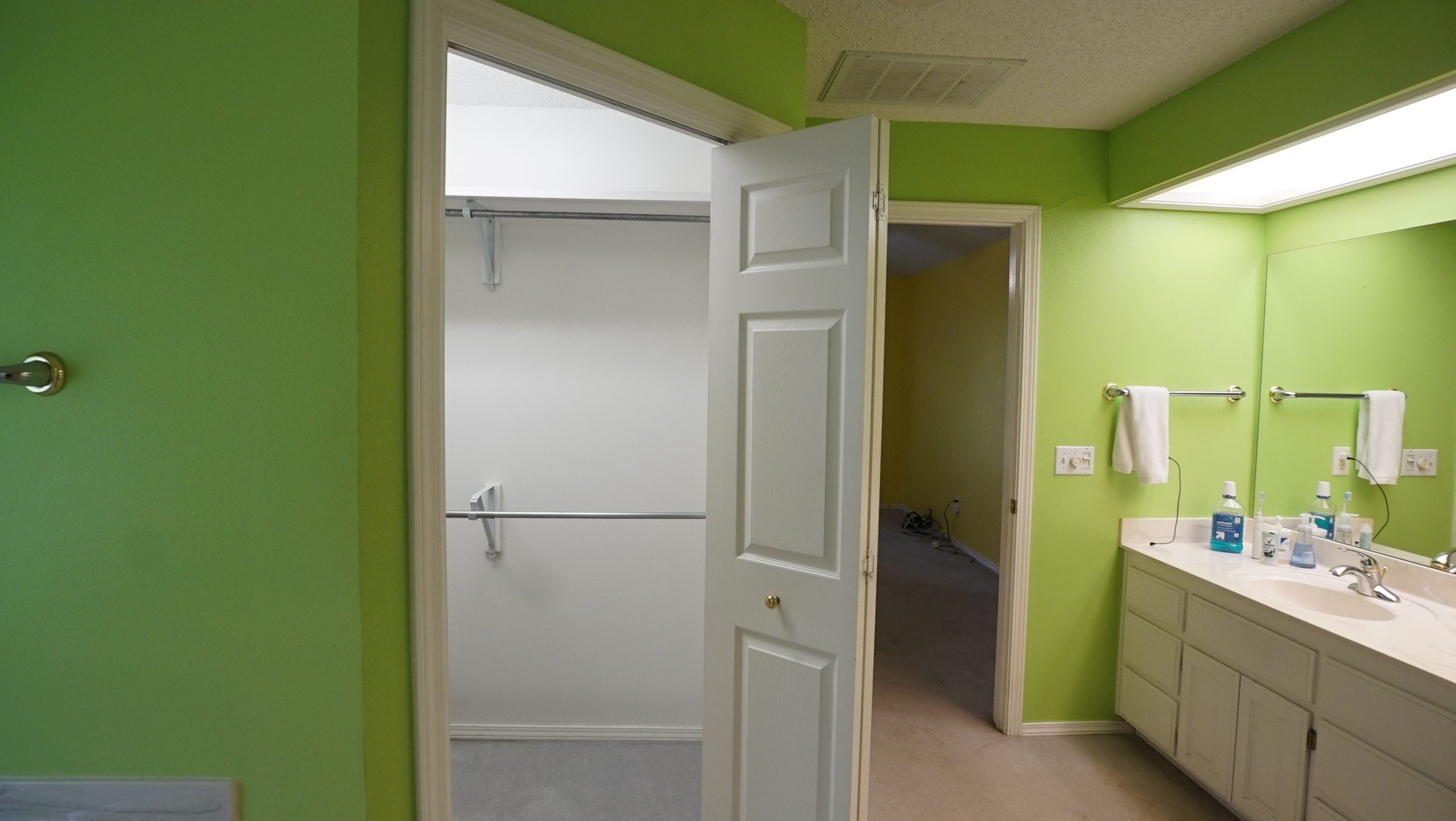 We did a full closet installation with custom shelves and created a new double vanity sink. The deep bathtub will give the Lemerys a place to relax and unwind, and a clear shower door ensures that the pink tile remains the focal point in this totally remodeled bathroom.