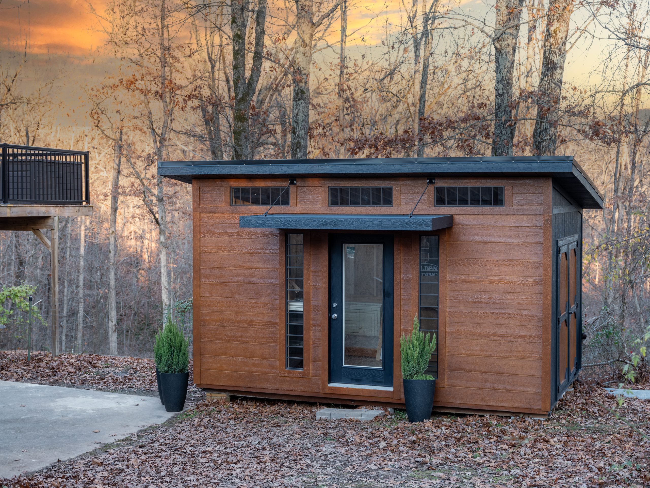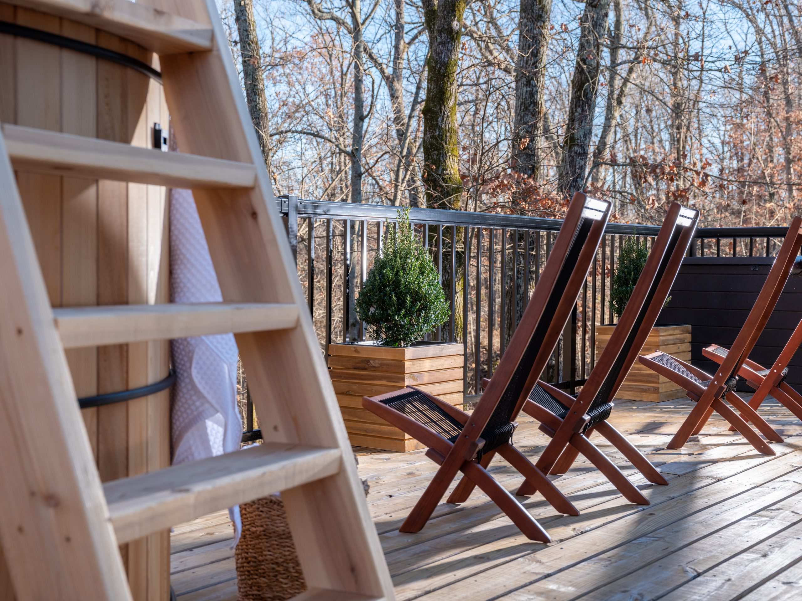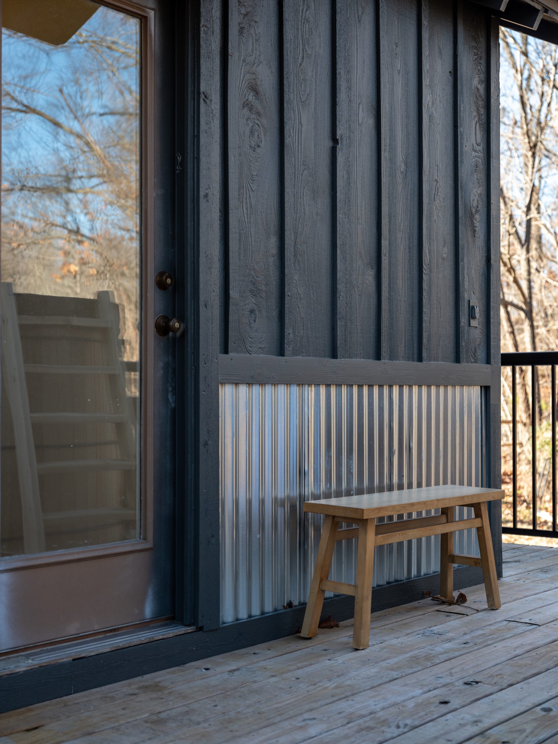 Located in a heavily wooded area, this little cabin already had a peaceful feel to it, but it was looking a little outdated. We fixed up its wraparound porch by replacing the old wood-and-wire railing with a more updated black metal railing. We also beefed up the existing columns with thicker wood, making them stand out more and creating a nice warm contrast to the dark paint we chose for the exterior. We also put in a gravel walkway leading up to the front porch with fresh landscaping on both sides to make the entrance grander and more inviting. The front door got a refresh and we added new lighting to finish off the entrance.