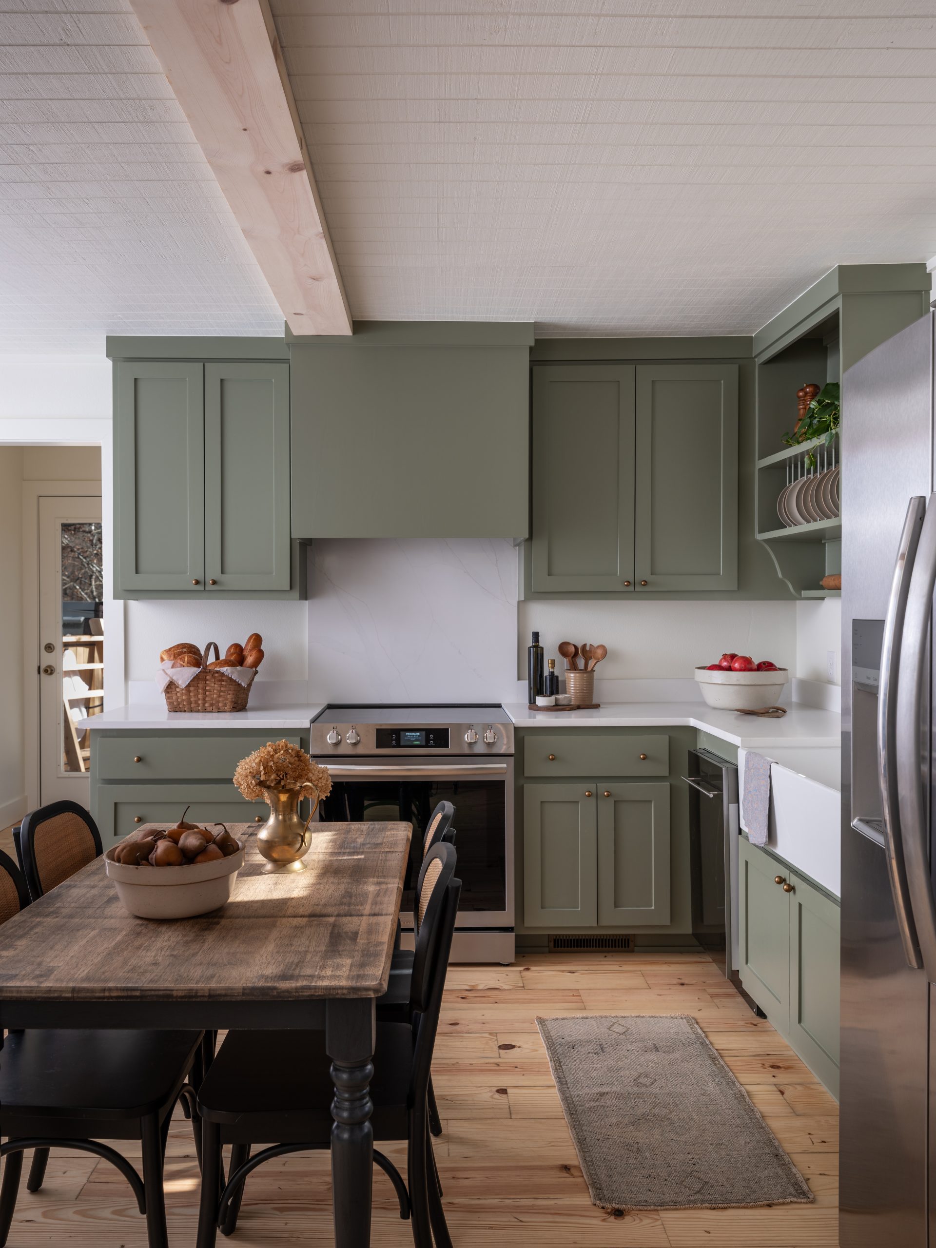 Rikki had no counter or cabinet space. One of the things she asked for was to have a kitchen where she could be proud to host family and friends. To do this, we removed all the existing cabinets and replaced them with a new L-shape cabinet layout. We installed new appliances, including a dishwasher which she didn’t have before. We went with a soft green color for the cabinets. It’s a warm shade that brings in the color of the trees outside and goes nicely with the white counters and white farmhouse sink. To make the most of this small space, we took advantage of the unused space under the stairs and made it into a pull-out pantry and a cute little dog nook. With new lighting and refinished floors, the kitchen looks like a sweet cottage and it’s much more functional.