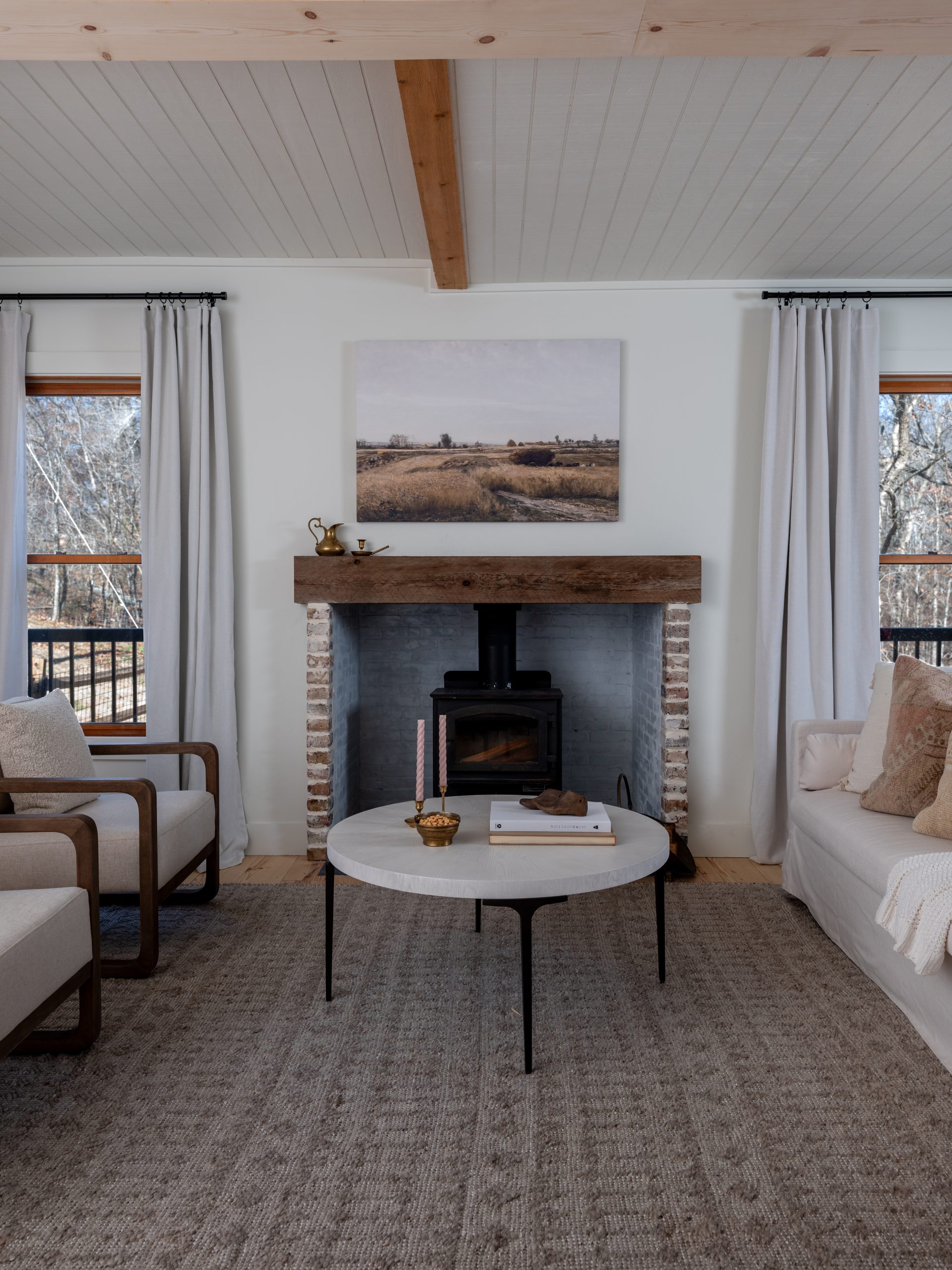 The living room needed a refresh. It had old wood paneling all around that made it feel smaller, darker and dated and the ceiling was just plywood. We painted the existing wood paneling to brighten it up, and now that it’s white, it has a light and airy cottage feel. The vertical shiplap feels so cozy. We also refinished the ceiling with a wood treatment to cover the plywood and added wooden beams for character. The fireplace got bumped out onto the deck to gain more space in the living room. The old-fashioned chimney fits the look perfectly. We created a small alcove for it and painted the brick white to blend in with the house, with a wood mantle to tie in with the beams on the ceiling.