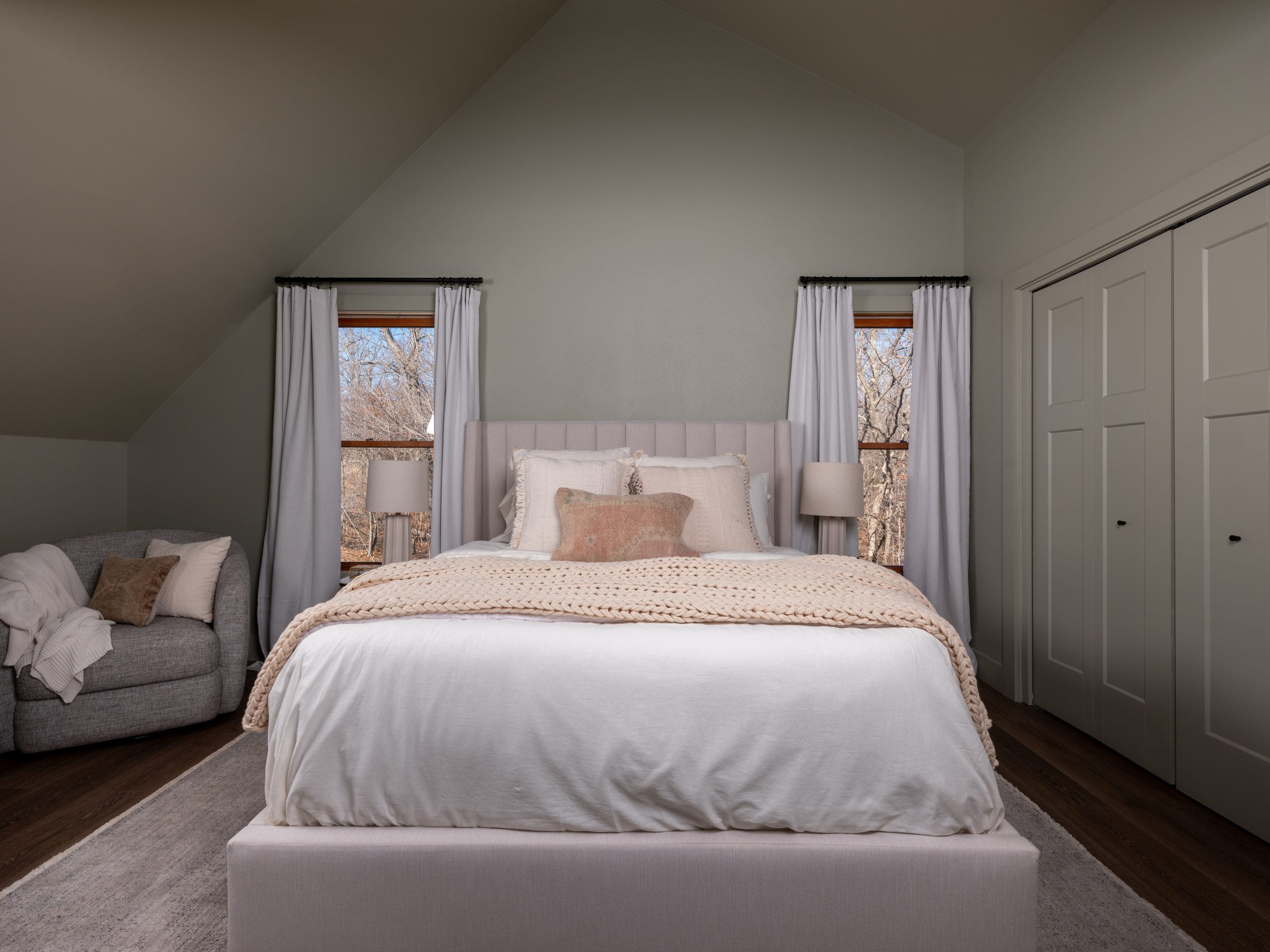 We started by removing the wall that separated Pearson’s room so we could gain more space and give Rikki a walk-in closet. Then, we took out the carpet and replaced it with new LVT flooring. We replaced the trim around the windows and doors and painted the walls a soft serene shade, while warming up the room with natural wood beams on the ceiling.  By removing all the original walls and starting over, we were able to add a window, center the bed and give her a built-in book shelf.