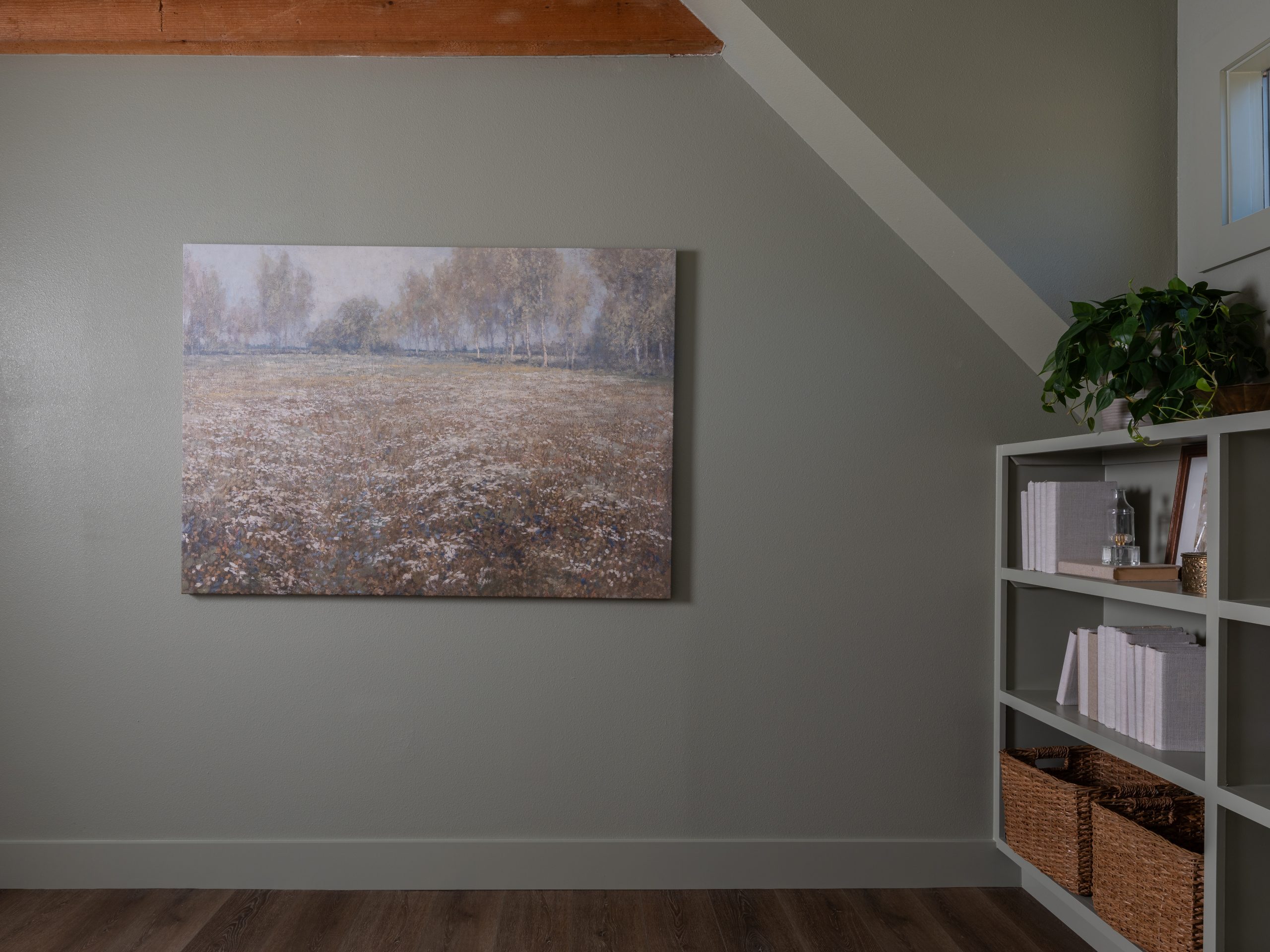 At the bottom of the stairs, we included a special project – a painting by our friend Bethany Carroz. You’ve seen her paintings in other homes we’ve done. She’s so talented. Rikki had an old picture of her and Pearson standing in front of the house when they first moved in. Bethany turned it into a sweet painting.