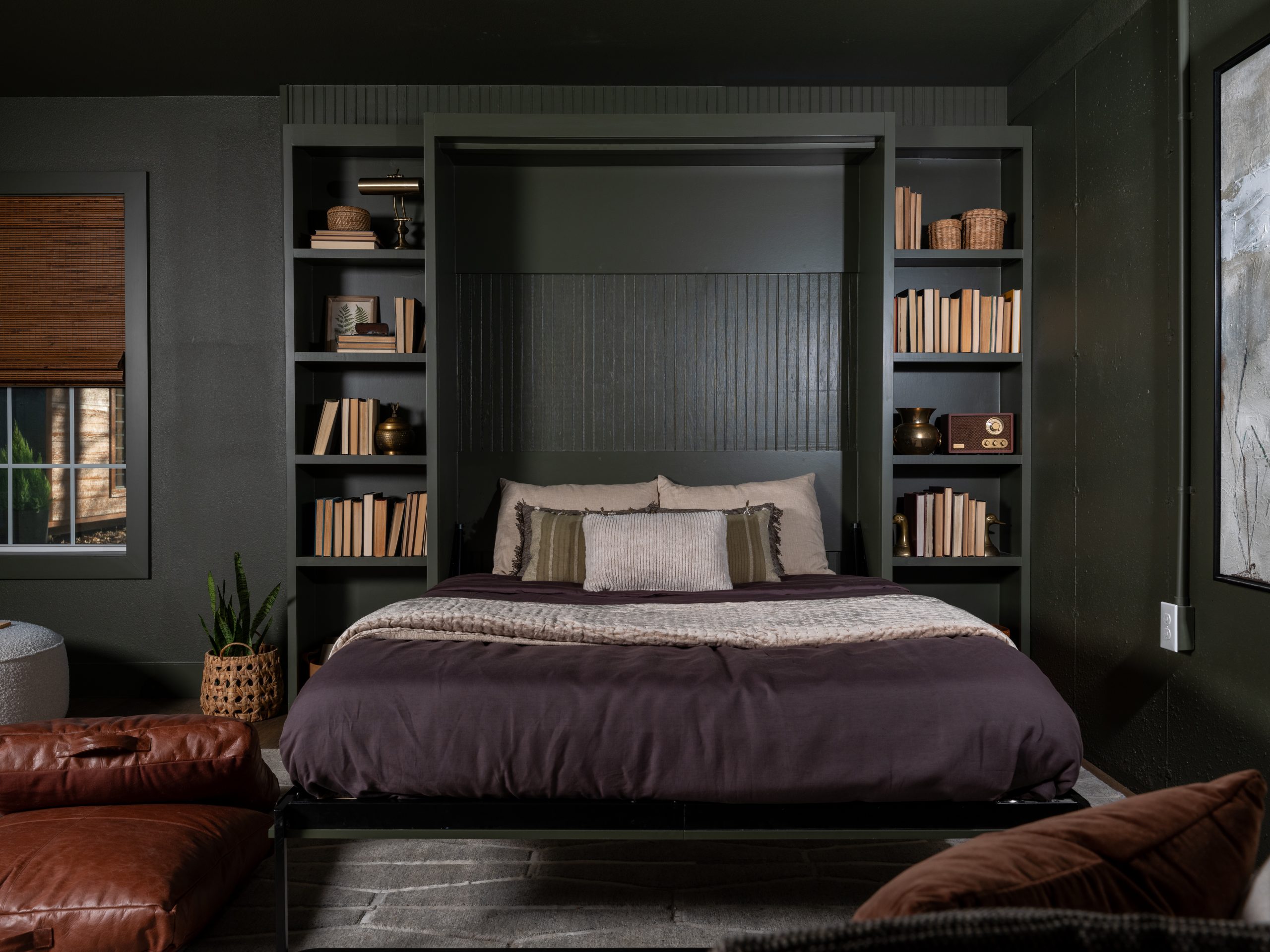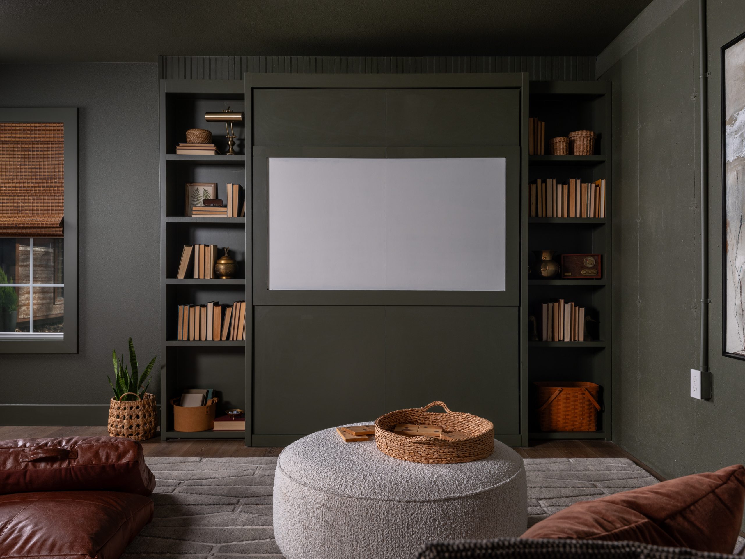 This was such a fun project! We put in a murphy bed that becomes a movie screen when it’s closed and hung a projector from the ceiling. With big, cozy seating and a full kitchenette stocked with movie-watching snacks, Pearson has the ultimate at-home theater where he and his friends can hang out.