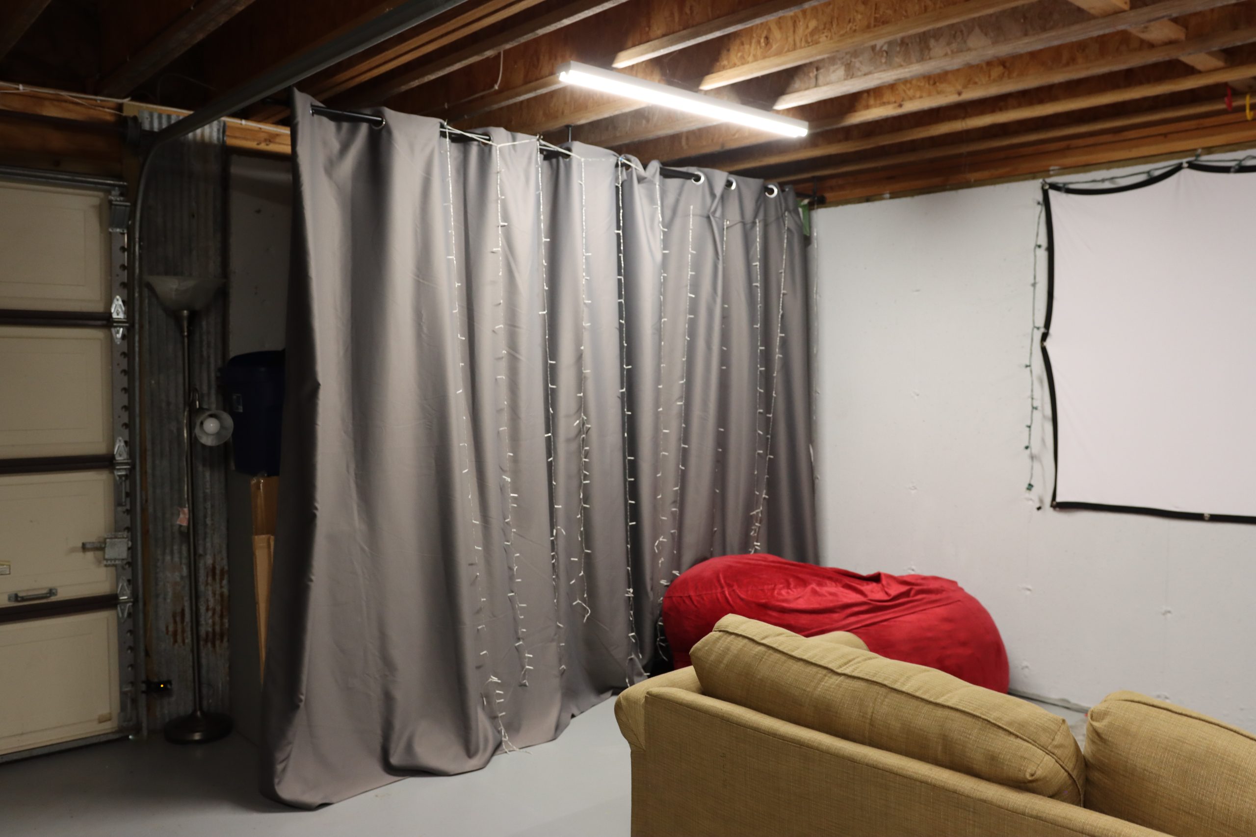 Rikki had mostly been using the basement as a storage area, but she knew it could be the perfect space for Pearson to get his own room. When we talked to him about it, he said he loves movies and then mentioned in a non-serious way how he would love movie room. We ran with that idea by creating the ultimate bedroom/movie theater space, complete with a kitchenette and a full bathroom.