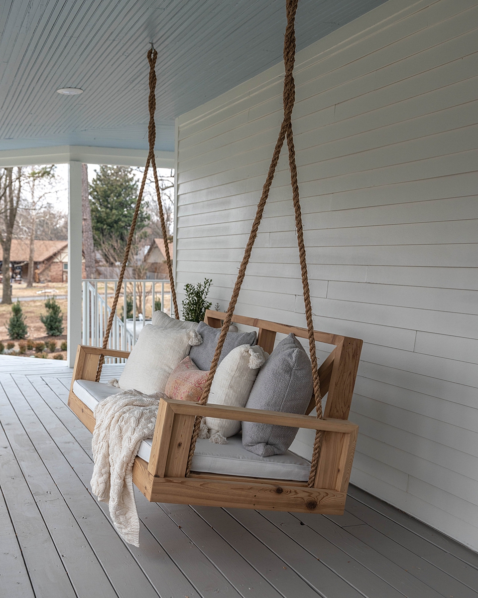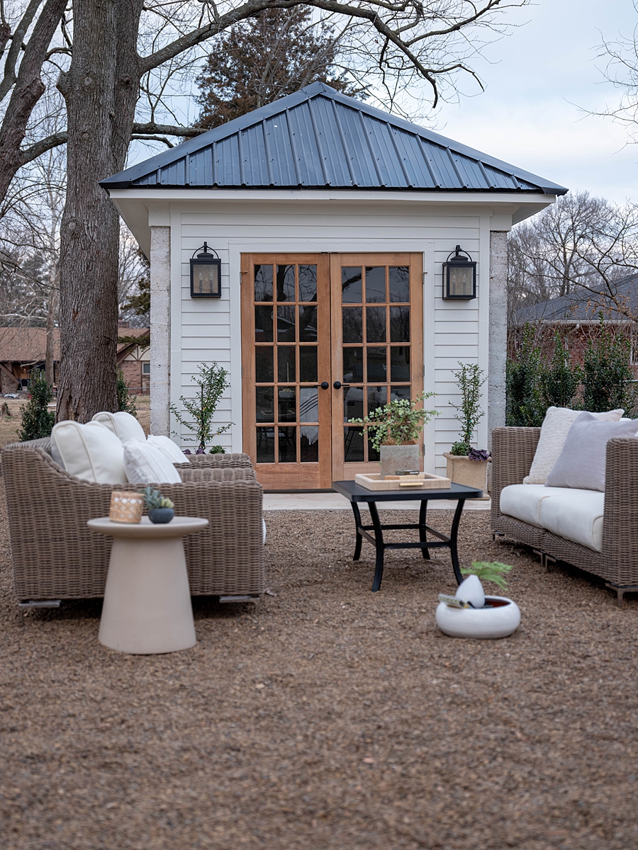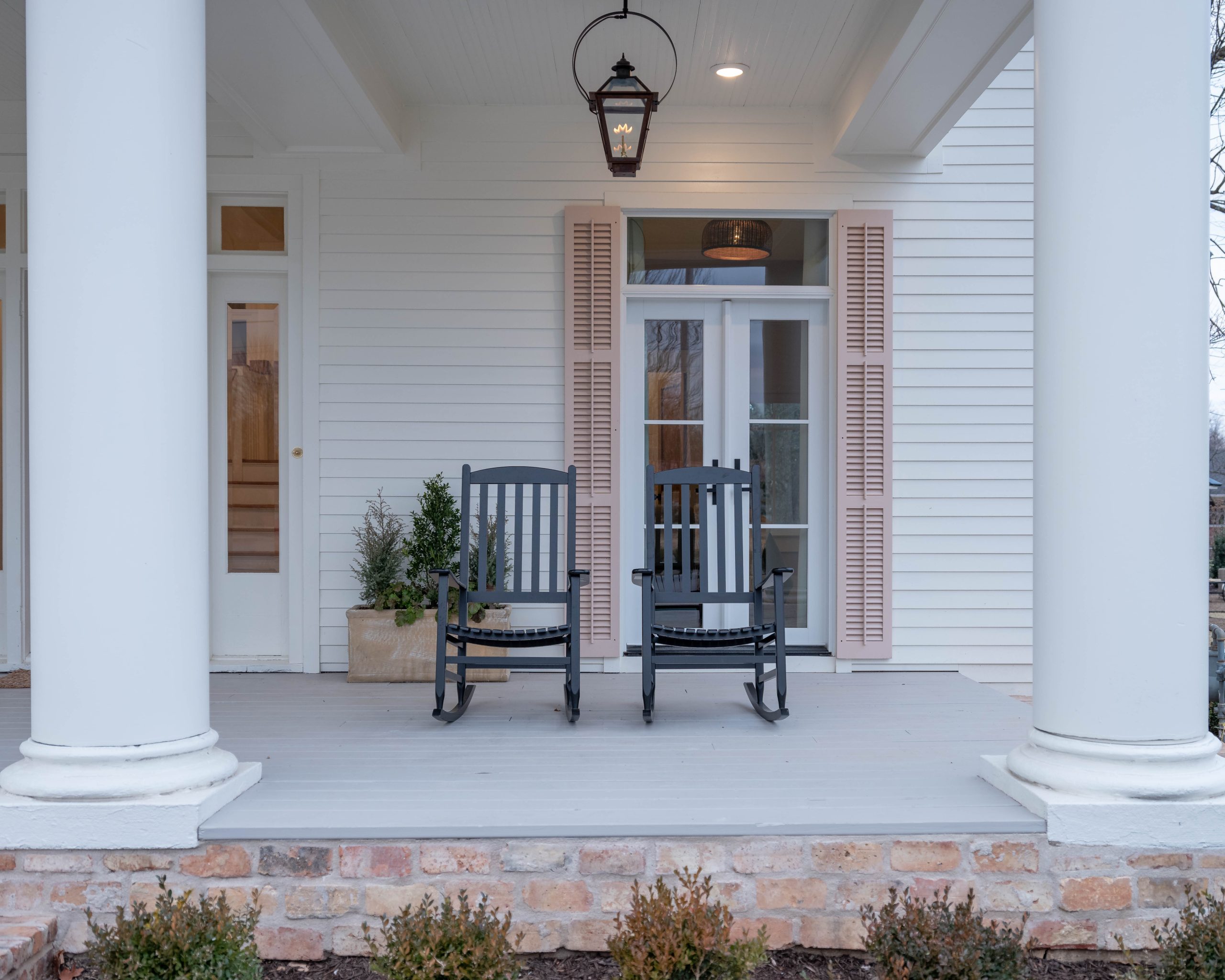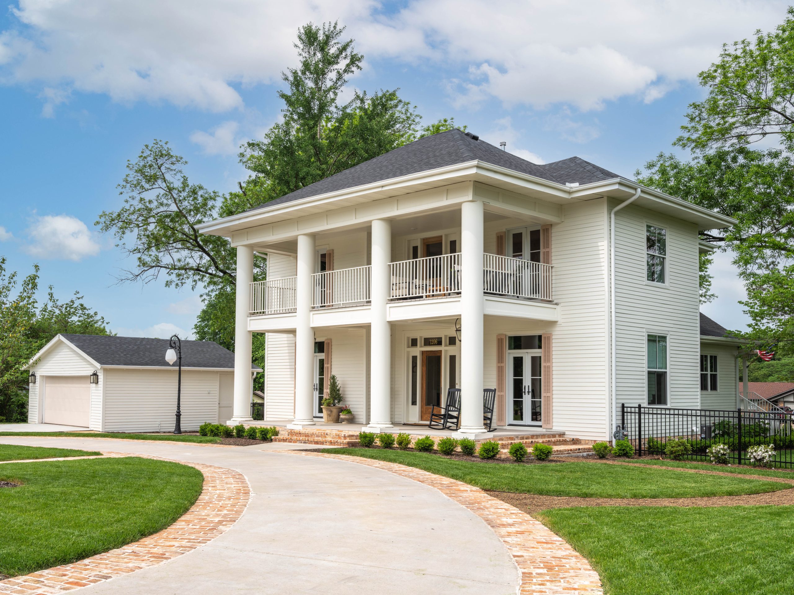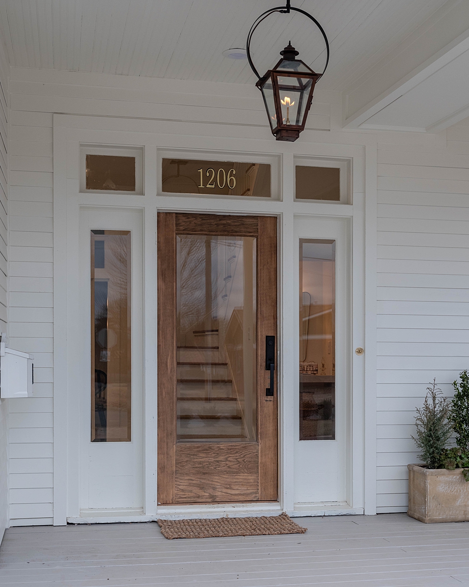 We kept the original shape of the circular driveway and enhanced it with reclaimed brick along the edges, as well as along the front of the house. We also added flagstone pavers to the walkway from the front porch to the garage. Both porches (the bottom level and the second floor) were in bad shape. The wood was rotted, maybe from termite damage. Dave replaced all the wood in the two front porches and welded new metal railings to secure everything together. We added new siding, a new roof and painted the entire house white to bring it back to its former glory. Where there had been windows in the front, we switched them out for French doors that flank both sides of the front door, and we added floor-to-ceiling blush-colored shutters. The gas lanterns on the front porch add a finishing touch, true to the house’s southern charm.