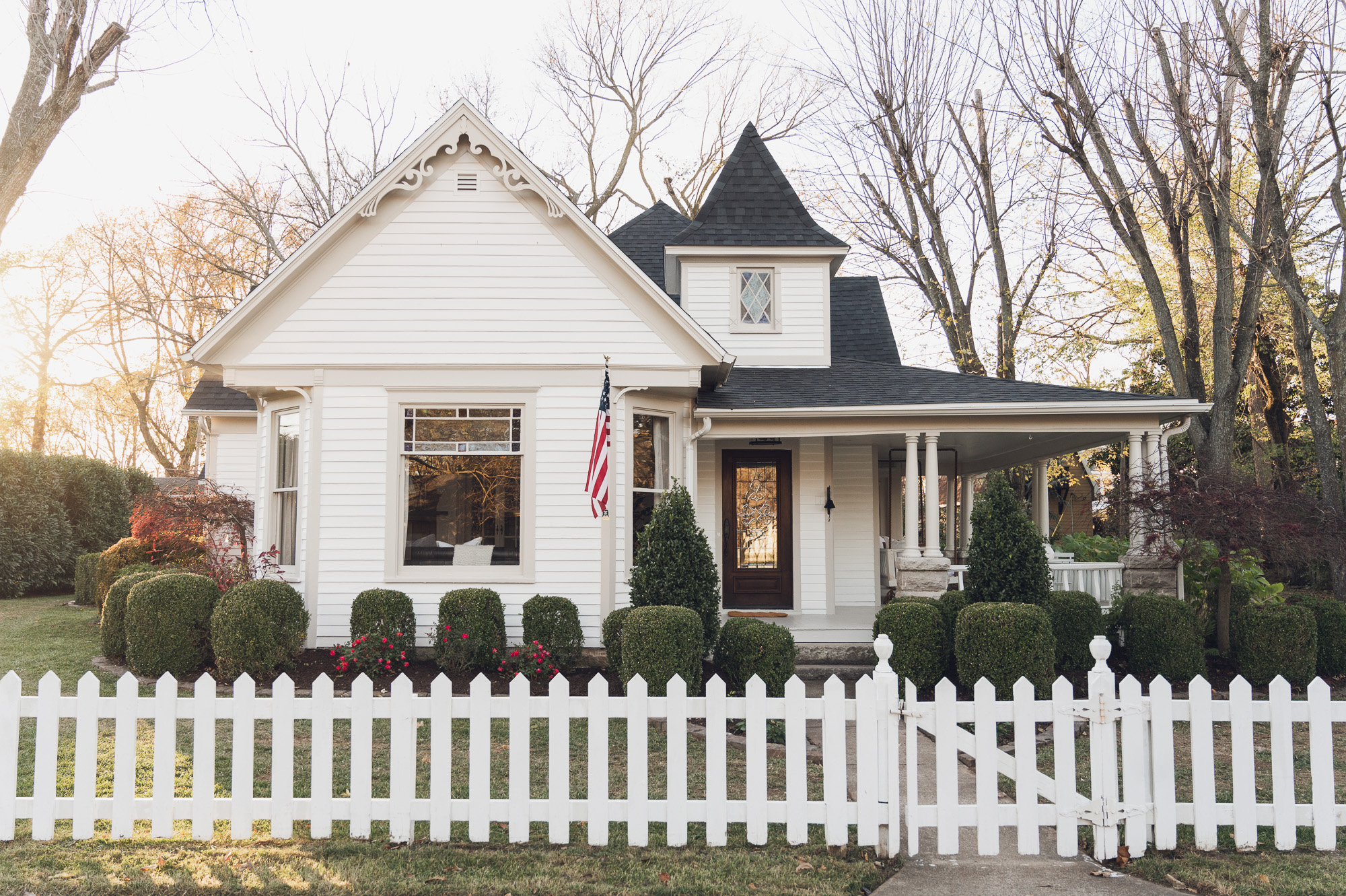 To freshen up the outside, we cleaned up the landscaping and painted the exterior with a new coat of white. I wanted to accent the trim on this old house and make it pop, so I went with a light gray as a contrast. We also replaced the roof, making it a darker color to show off the pointed charm of the roof. These details were some of the first things the Ducas noticed about the house and we loved being able to make these features stand out.