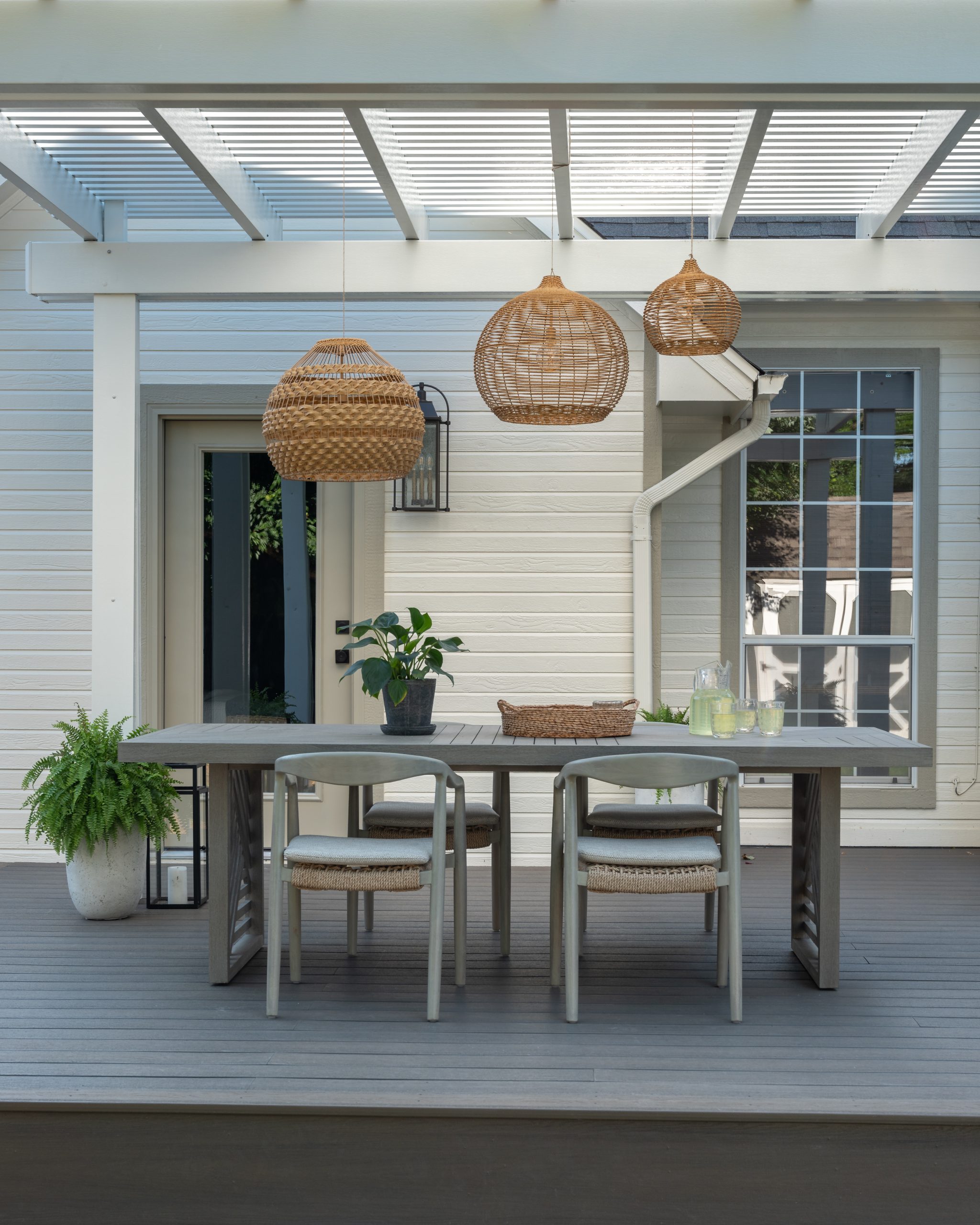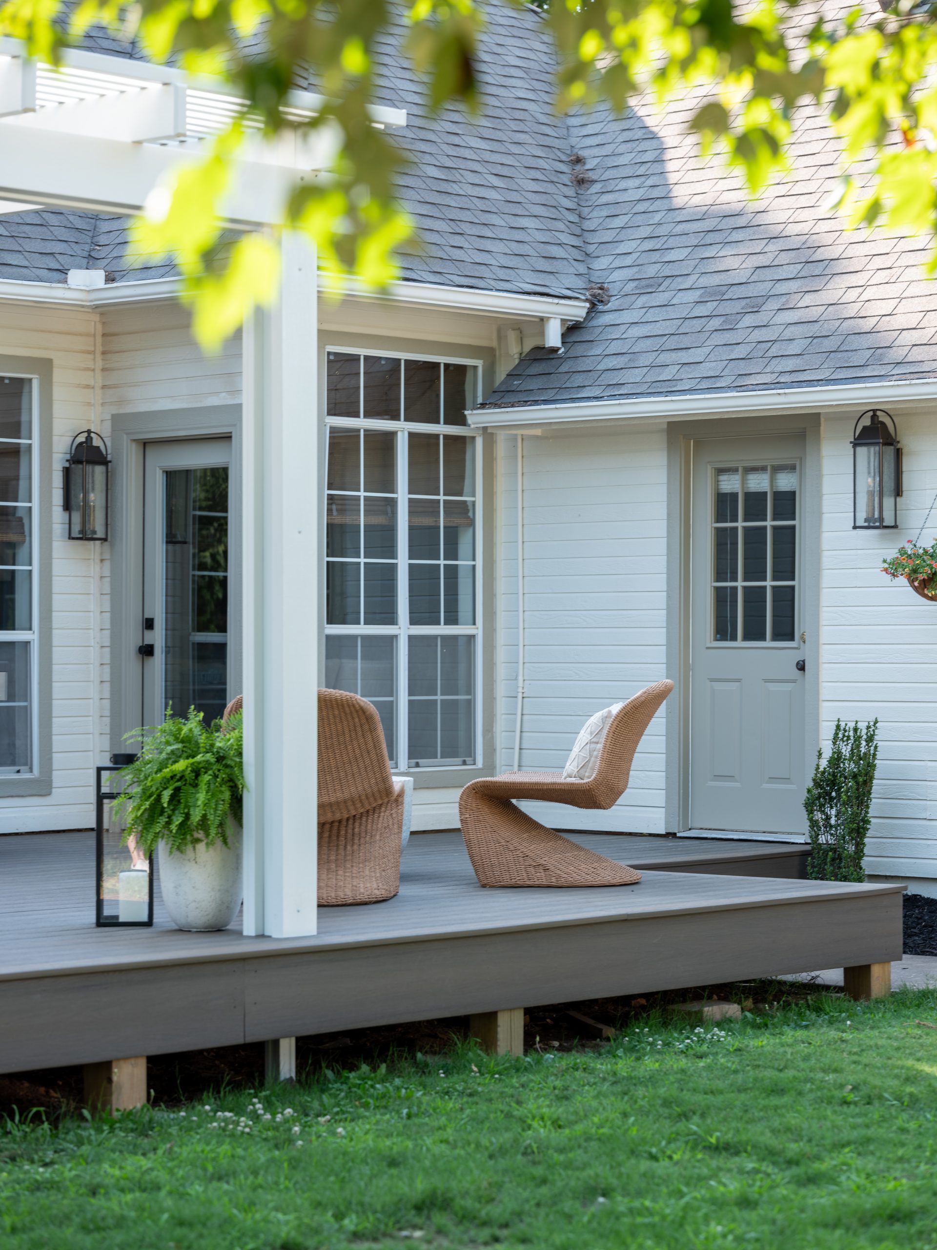 We painted the brick a beautiful creamy color that’s a bit softer than traditional white. Dave built and installed shutters, which we painted in a taupe/gray color to add contrast. We replaced the front door with a beautiful natural wood, and I just love how the front arch adds dimension to the front entrance. Next, we removed the large shrubs that were blocking the front windows; now we can let in more natural light. And lastly, we freshened up the landscaping and swapped out the front light fixtures for larger scale ones.
