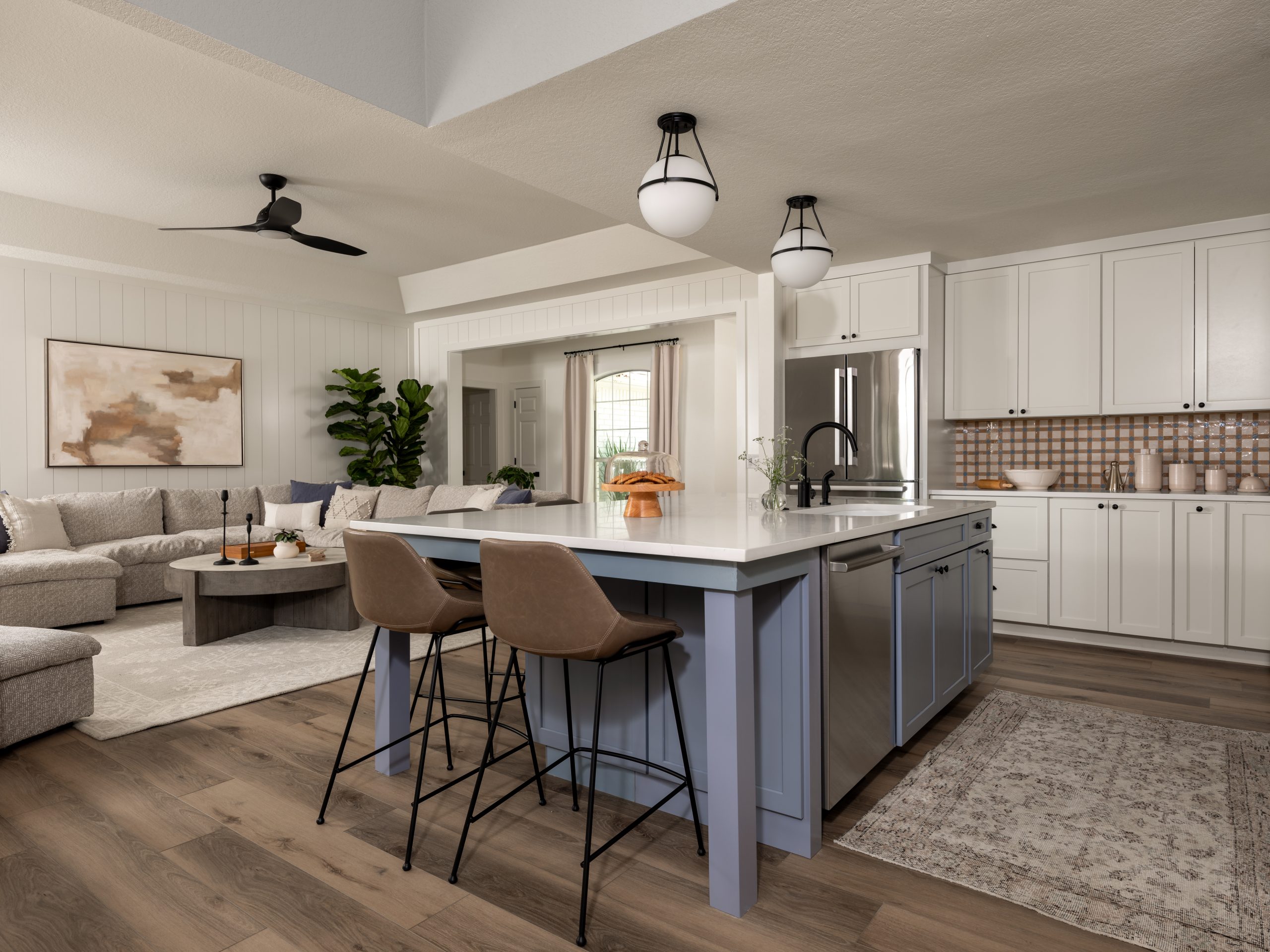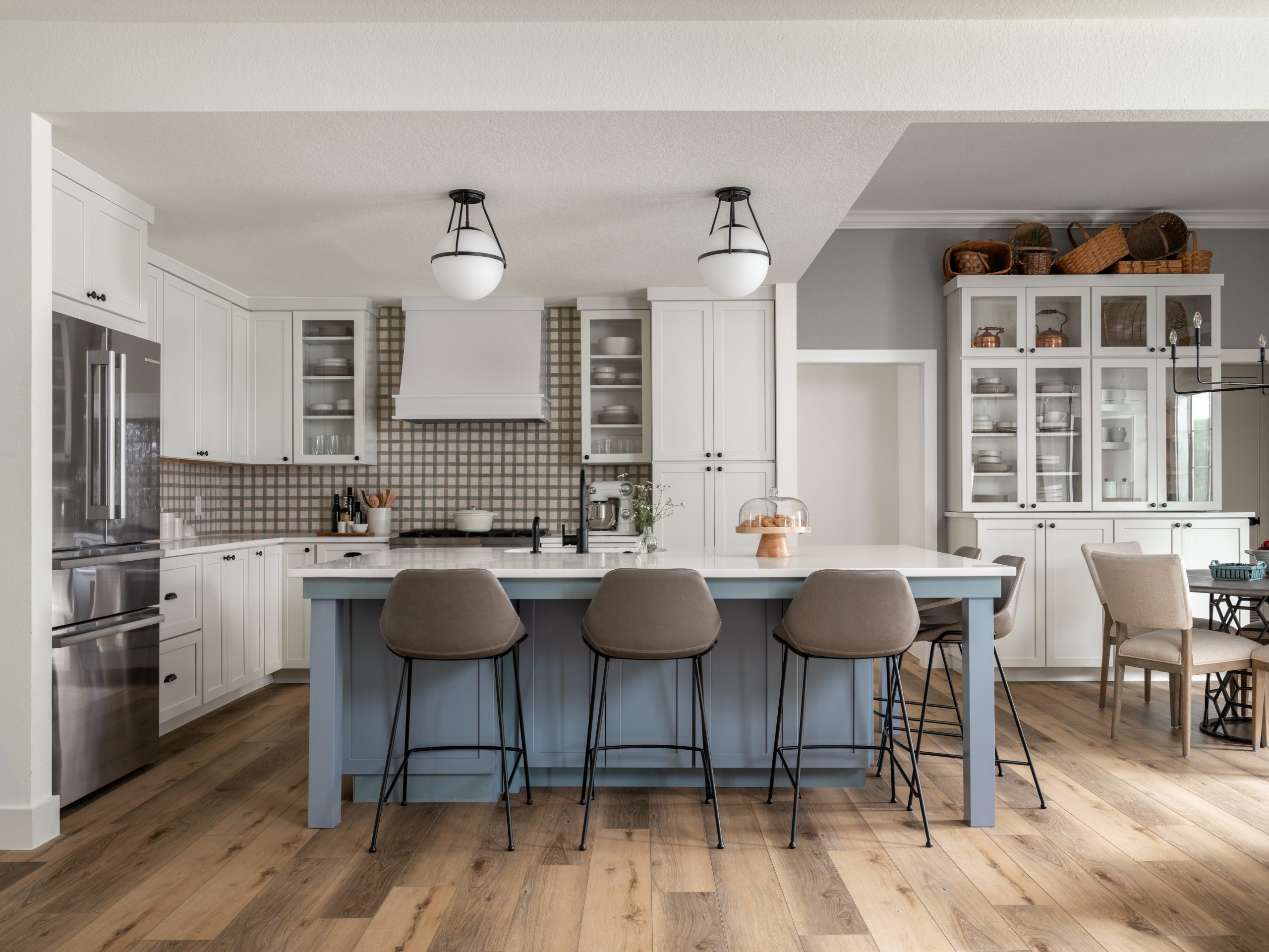 Jodi loves to bake, and I can tell you firsthand, she makes delicious cookies. We wanted to give her a kitchen with plenty of storage for all her baking supplies. Even though we took down a wall to open up the kitchen, we were able to add cabinets back in with a large island. She likes farmhouse style, so we went with cream-colored cabinets, a light blue shade on the island and a farmhouse-inspired tile for the backsplash. I absolutely love the detail and color of these these handmade tiles. Now, the kitchen is cozy and joyful just like this family.