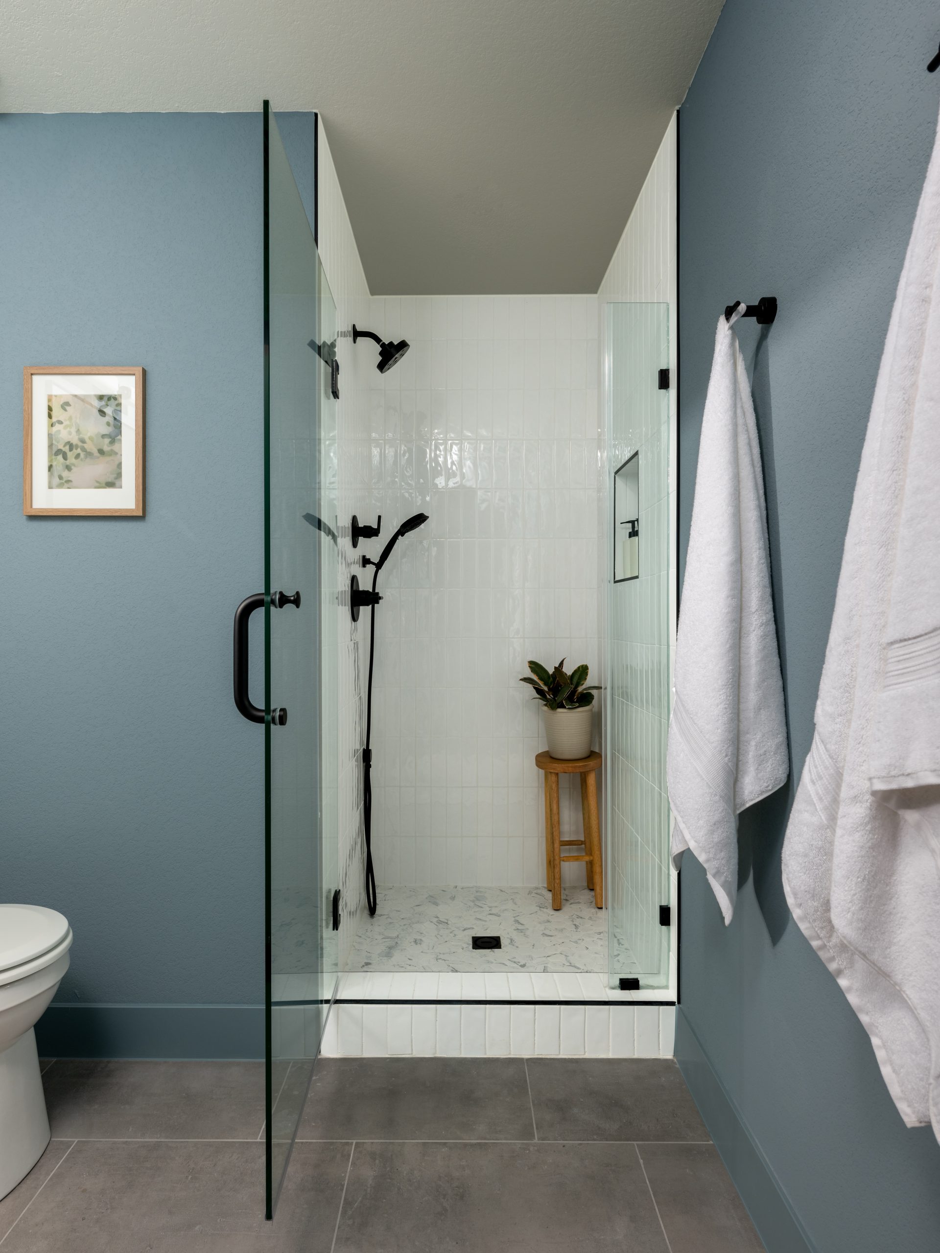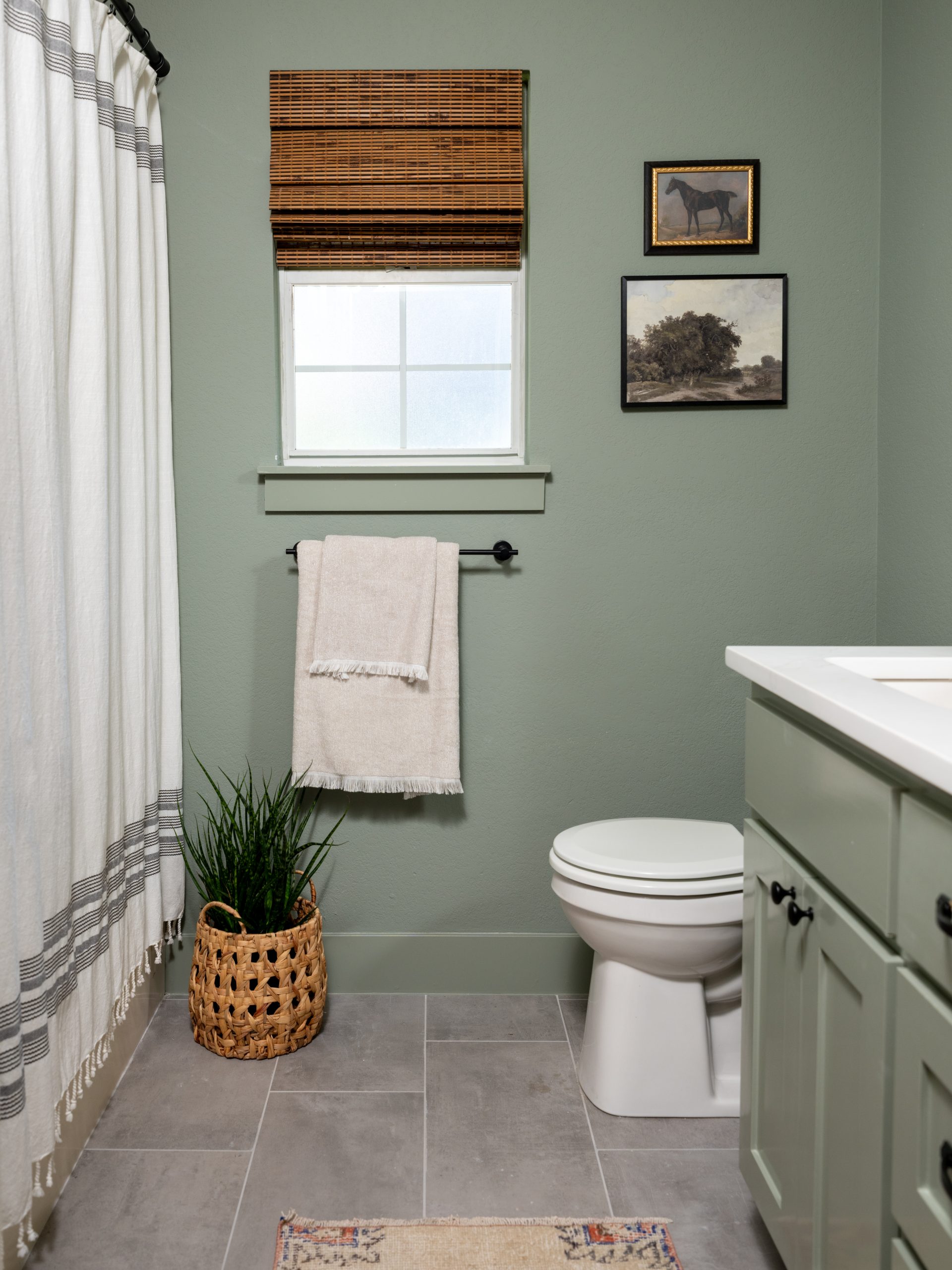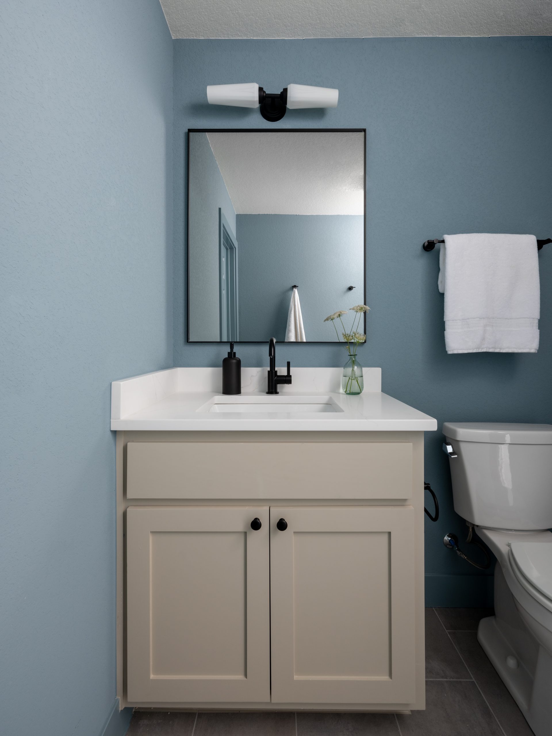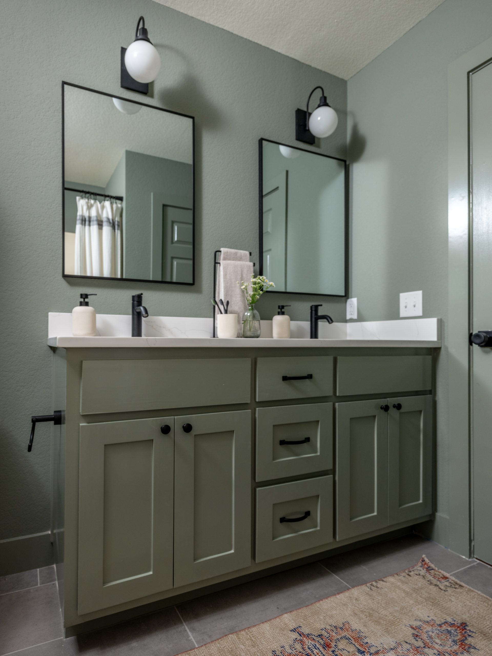 The kids bathroom wasn’t part of the original plan, but we gave it a little refresh. We added a new double vanity, new mirrors, new lights and a fresh coat of paint. Now the bathroom has more storage and a fun new color. The whole look is updated and modern.