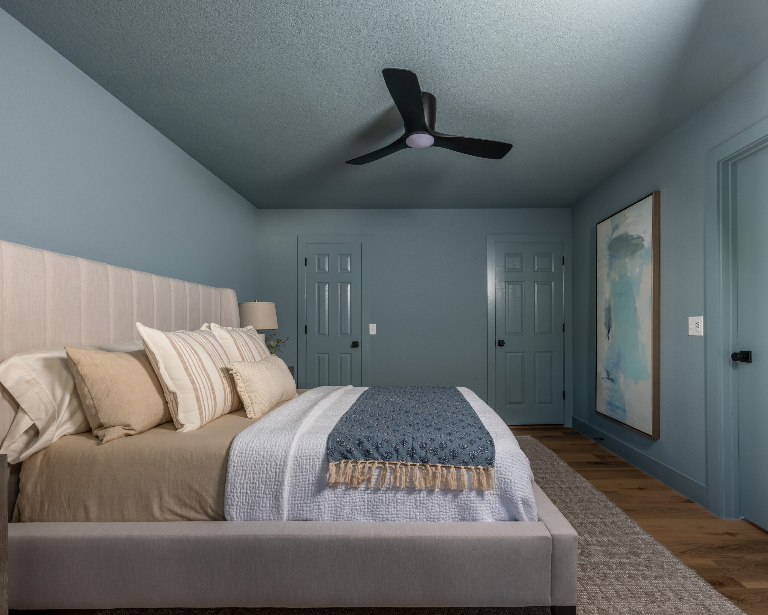 The plan had been to make a new room for the boys and to give this room to Jodi’s parents for their stay while Phillip is on deployment. What they didn’t know is that we added a surprise guest bathroom. Now, they will have their own bedroom and bathroom and they’ll be so much more comfortable. The bedroom has new flooring, a new ceiling fan and a fresh coat of paint. The bathroom is all new with a vanity and shower. The blue color is soothing and relaxing while the white tiles make the shower look fresh and classic.