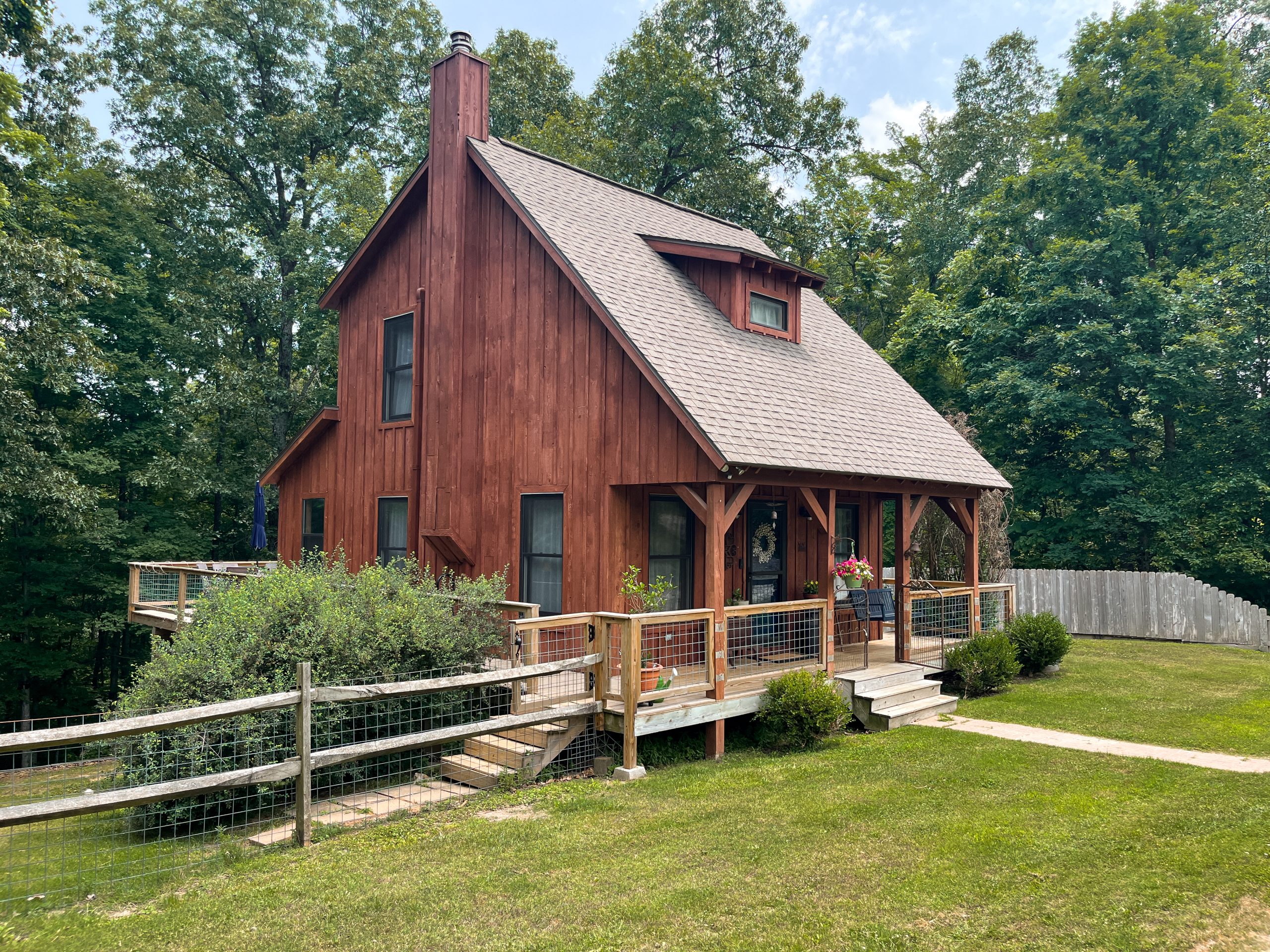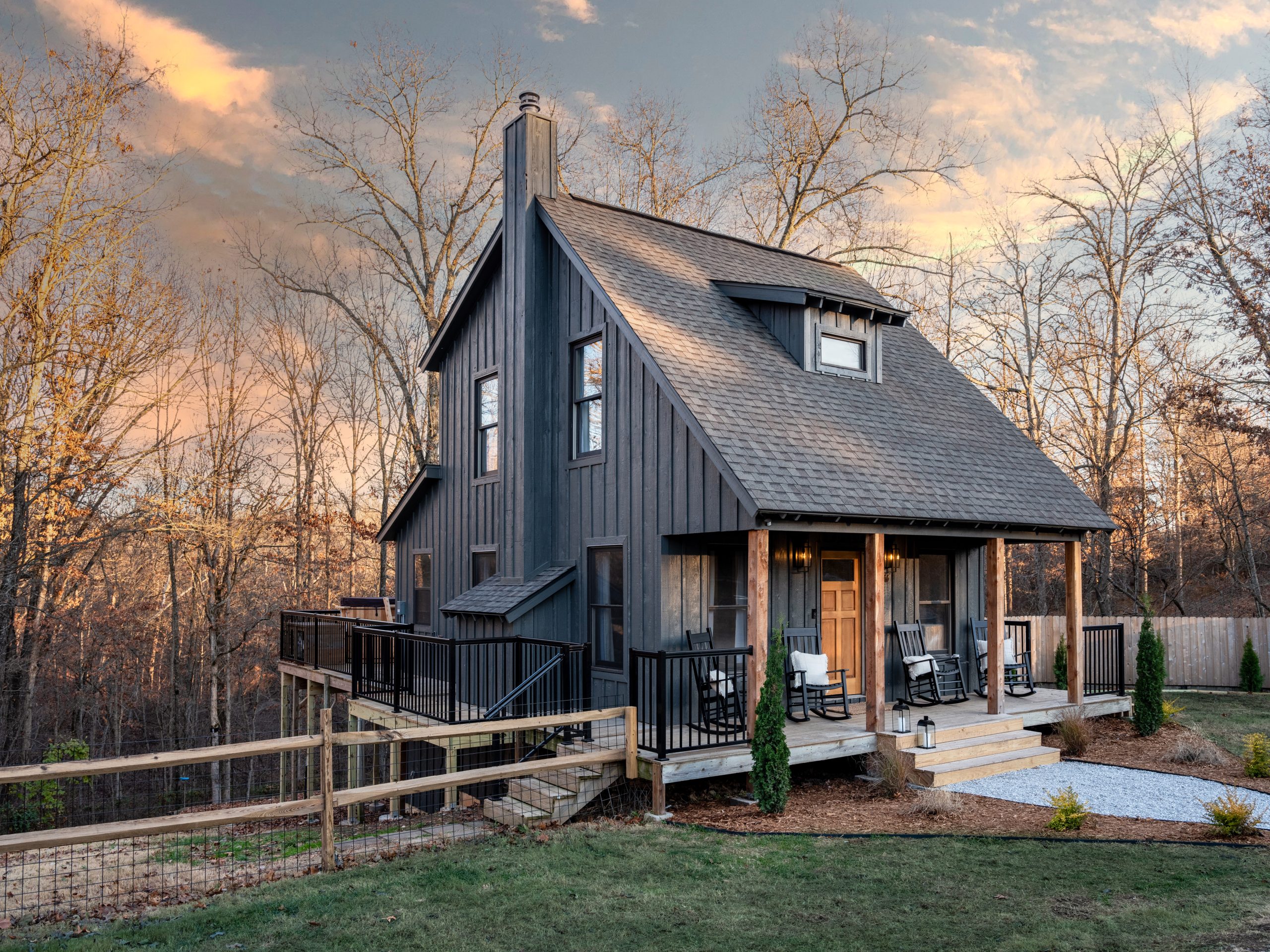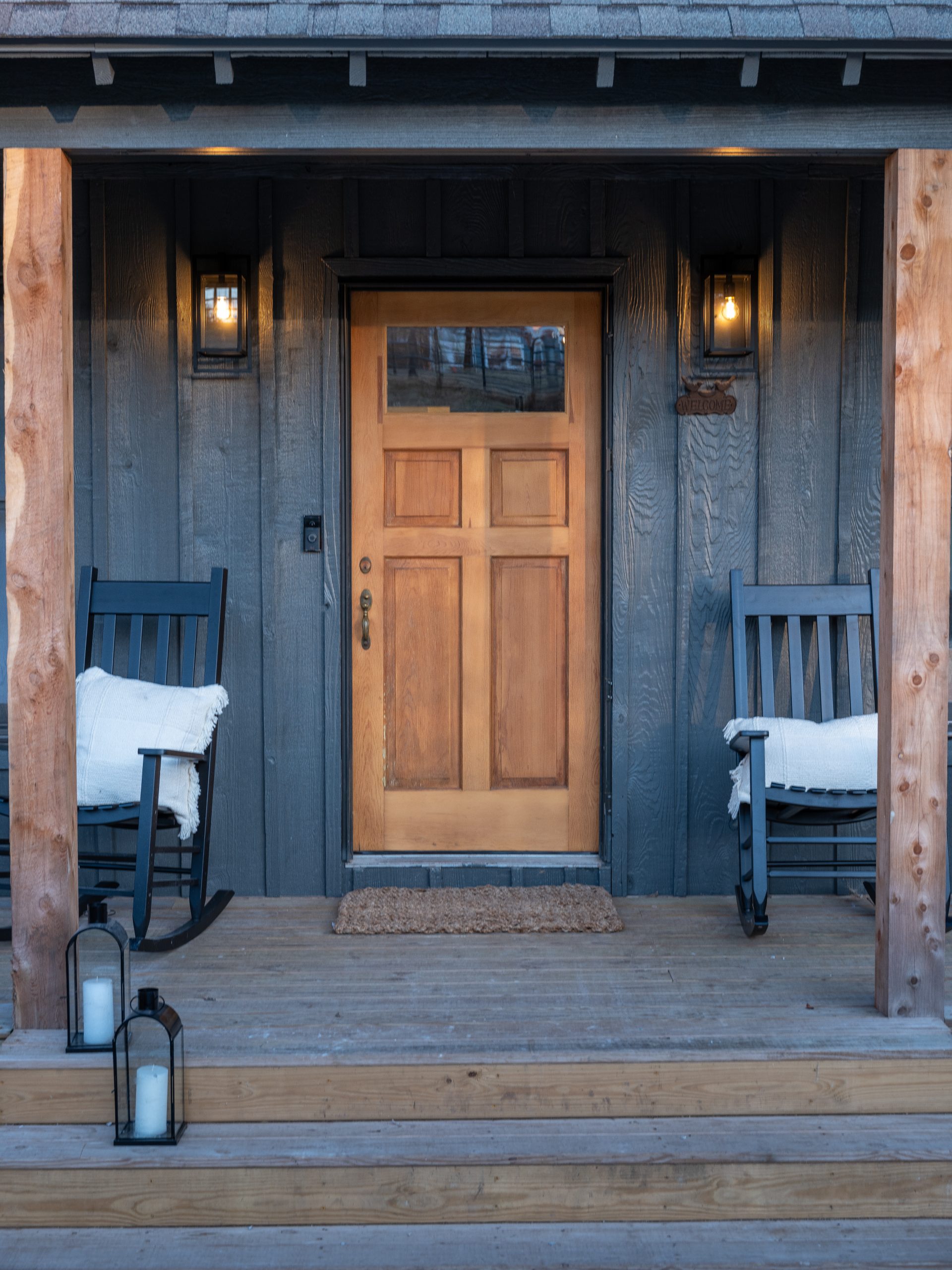Located in a heavily wooded area, this little cabin already had a peaceful feel to it, but it was looking a little outdated. We fixed up its wraparound porch by replacing the old wood-and-wire railing with a more updated black metal railing. We also beefed up the existing columns with thicker wood, making them stand out more and creating a nice warm contrast to the dark paint we chose for the exterior. We also put in a gravel walkway leading up to the front porch with fresh landscaping on both sides to make the entrance grander and more inviting. The front door got a refresh and we added new lighting to finish off the entrance.