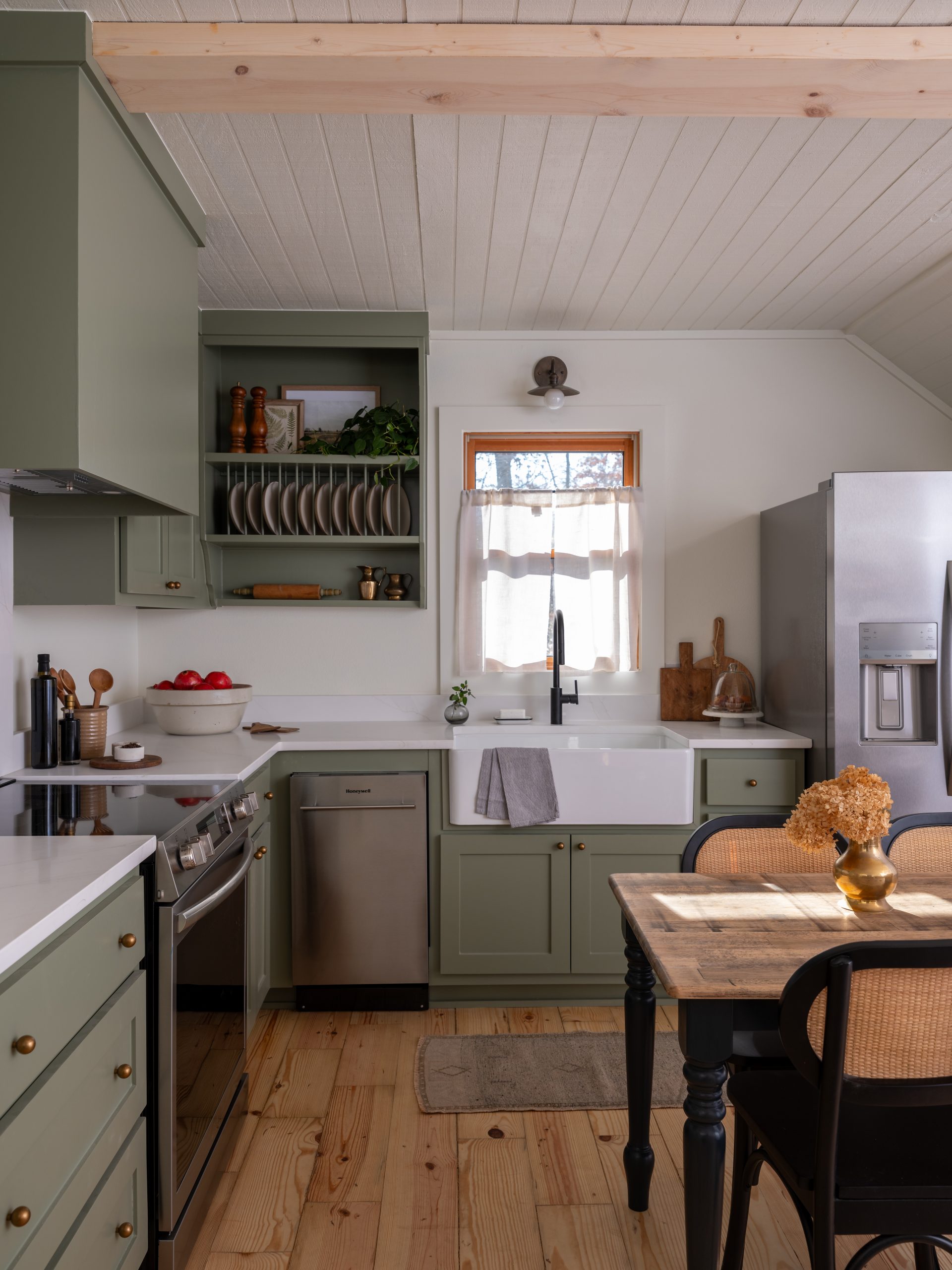 Rikki had no counter or cabinet space. One of the things she asked for was to have a kitchen where she could be proud to host family and friends. To do this, we removed all the existing cabinets and replaced them with a new L-shape cabinet layout. We installed new appliances, including a dishwasher which she didn’t have before. We went with a soft green color for the cabinets. It’s a warm shade that brings in the color of the trees outside and goes nicely with the white counters and white farmhouse sink. To make the most of this small space, we took advantage of the unused space under the stairs and made it into a pull-out pantry and a cute little dog nook. With new lighting and refinished floors, the kitchen looks like a sweet cottage and it’s much more functional.