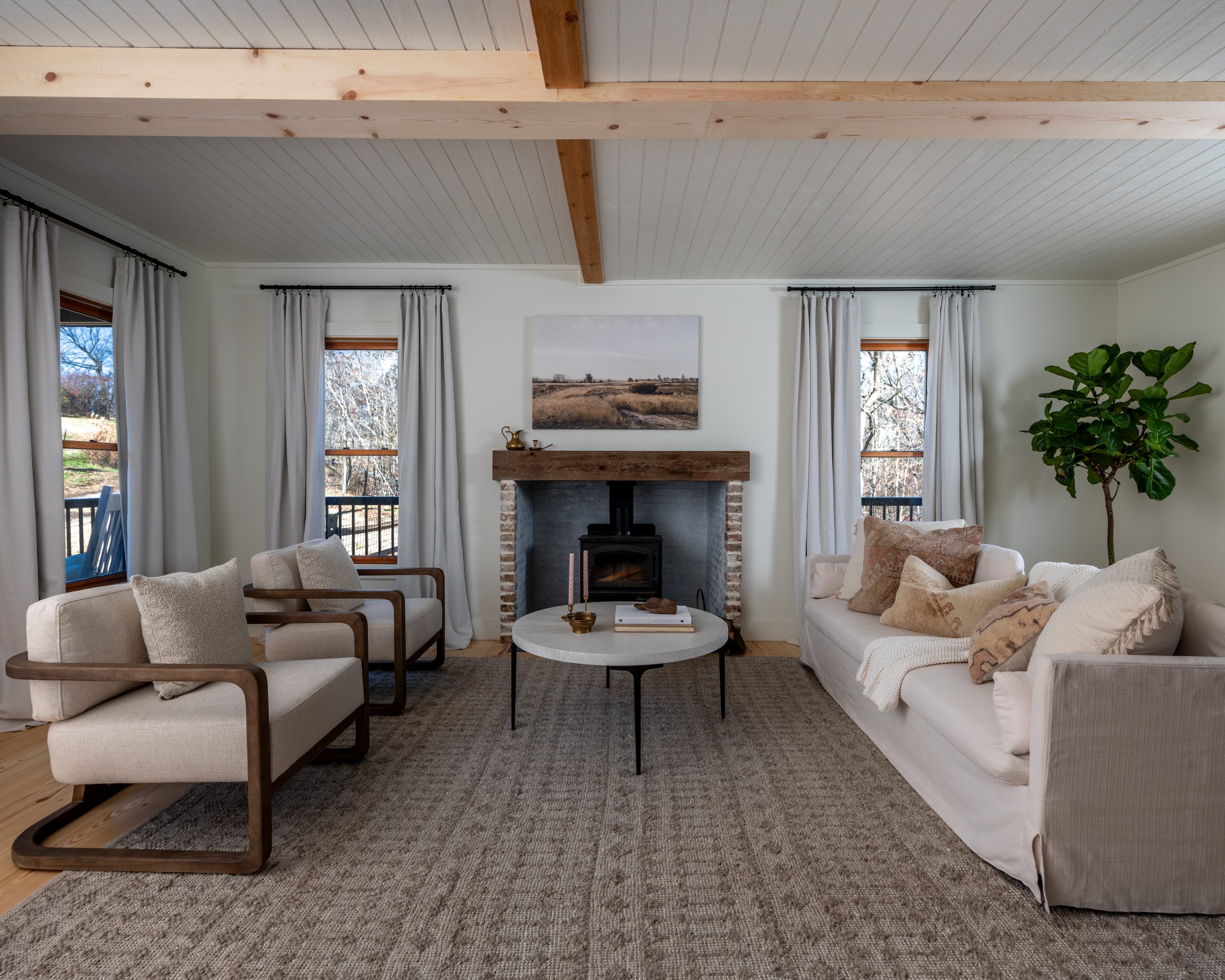 The living room needed a refresh. It had old wood paneling all around that made it feel smaller, darker and dated and the ceiling was just plywood. We painted the existing wood paneling to brighten it up, and now that it’s white, it has a light and airy cottage feel. The vertical shiplap feels so cozy. We also refinished the ceiling with a wood treatment to cover the plywood and added wooden beams for character. The fireplace got bumped out onto the deck to gain more space in the living room. The old-fashioned chimney fits the look perfectly. We created a small alcove for it and painted the brick white to blend in with the house, with a wood mantle to tie in with the beams on the ceiling.