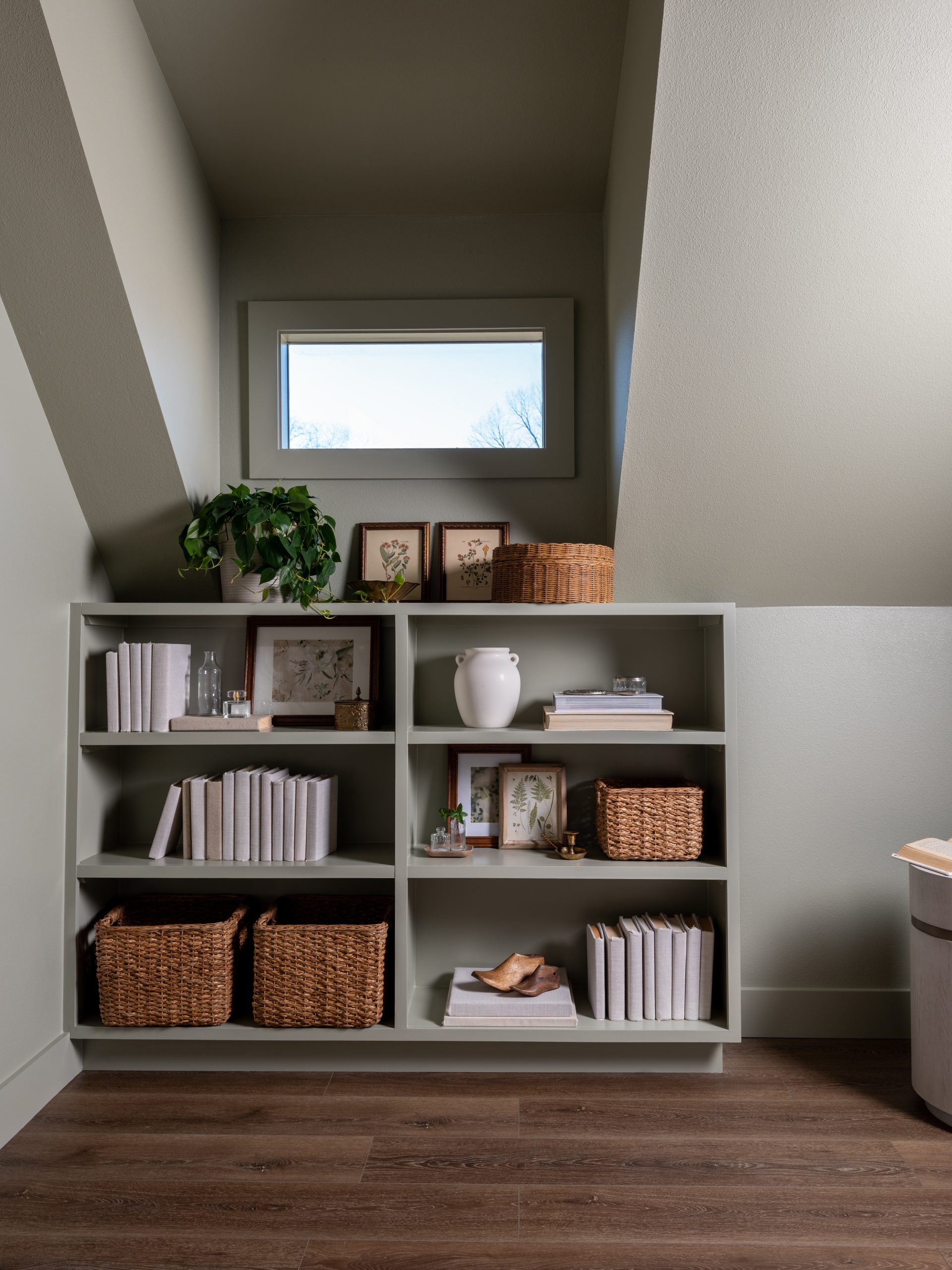 We started by removing the wall that separated Pearson’s room so we could gain more space and give Rikki a walk-in closet. Then, we took out the carpet and replaced it with new LVT flooring. We replaced the trim around the windows and doors and painted the walls a soft serene shade, while warming up the room with natural wood beams on the ceiling. By removing all the original walls and starting over, we were able to add a window, center the bed and give her a built-in book shelf.