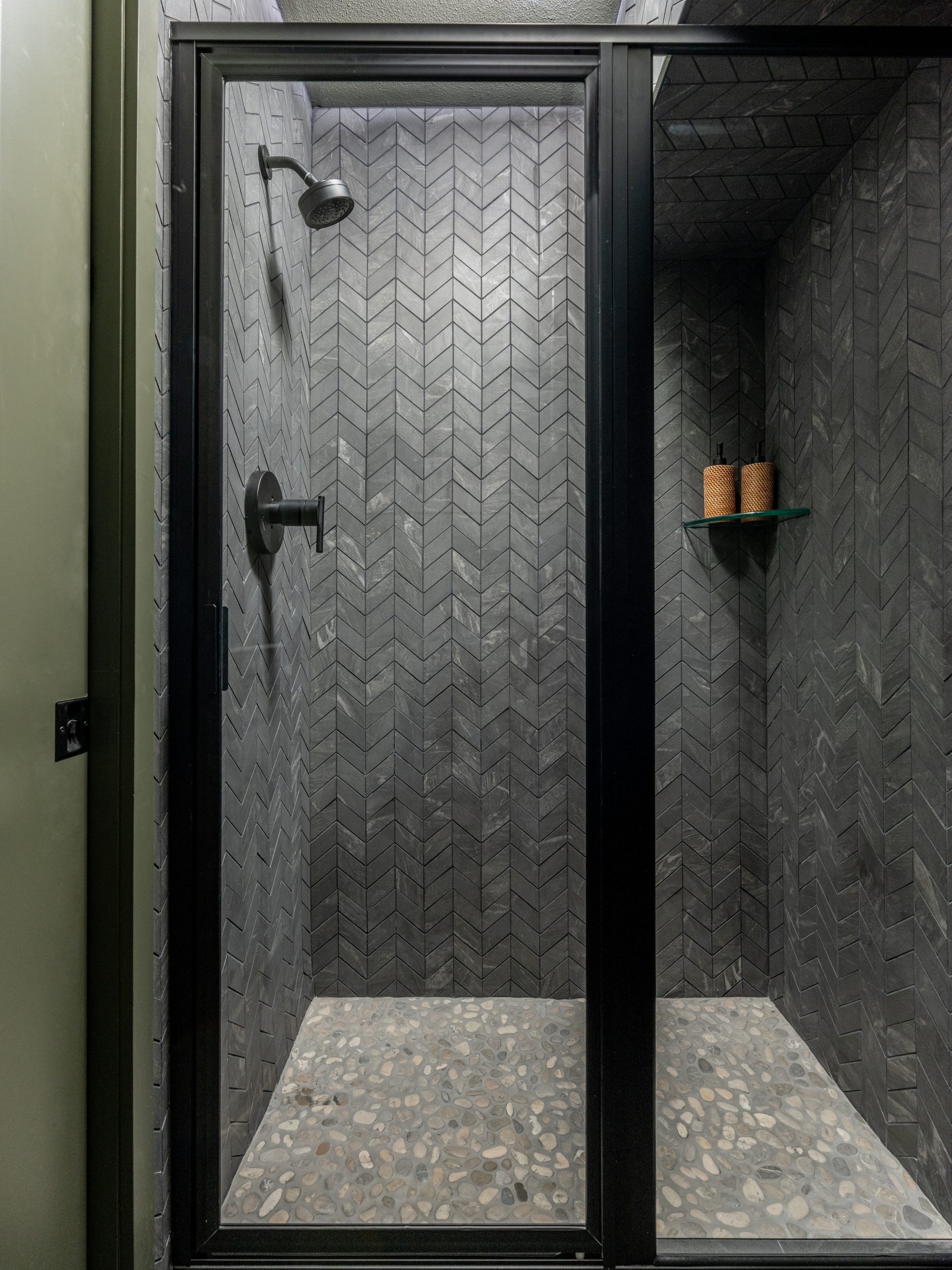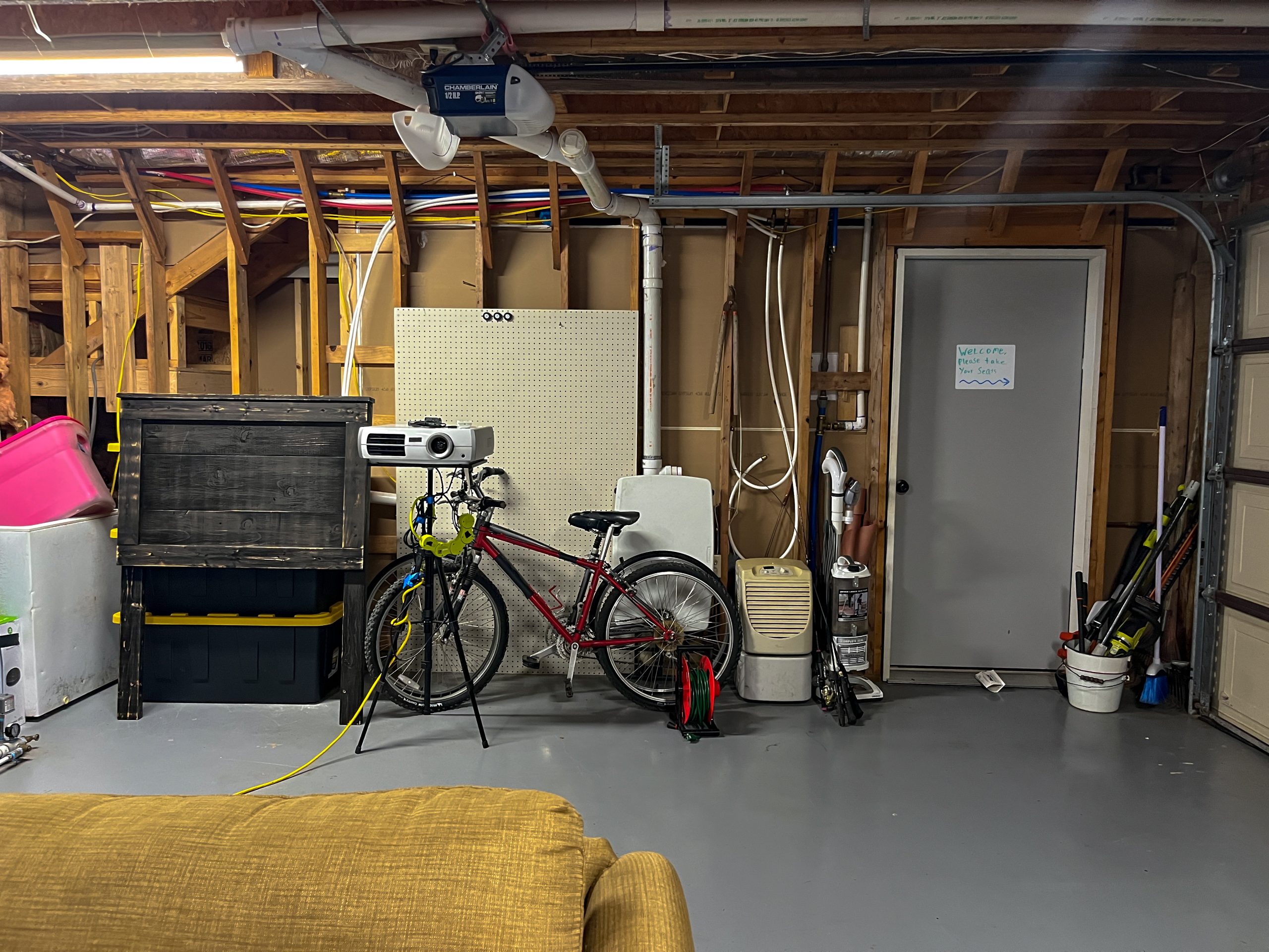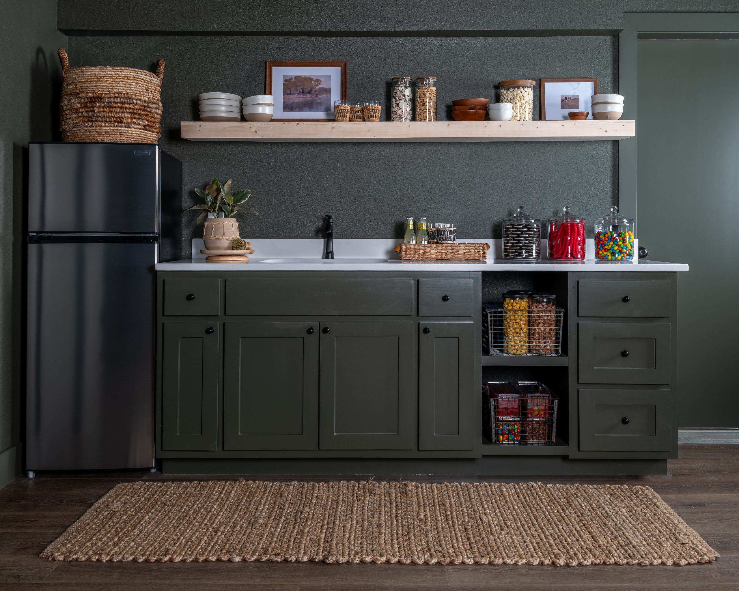 Rikki had mostly been using the basement as a storage area, but she knew it could be the perfect space for Pearson to get his own room. When we talked to him about it, he said he loves movies and then mentioned in a non-serious way how he would love movie room. We ran with that idea by creating the ultimate bedroom/movie theater space, complete with a kitchenette and a full bathroom.