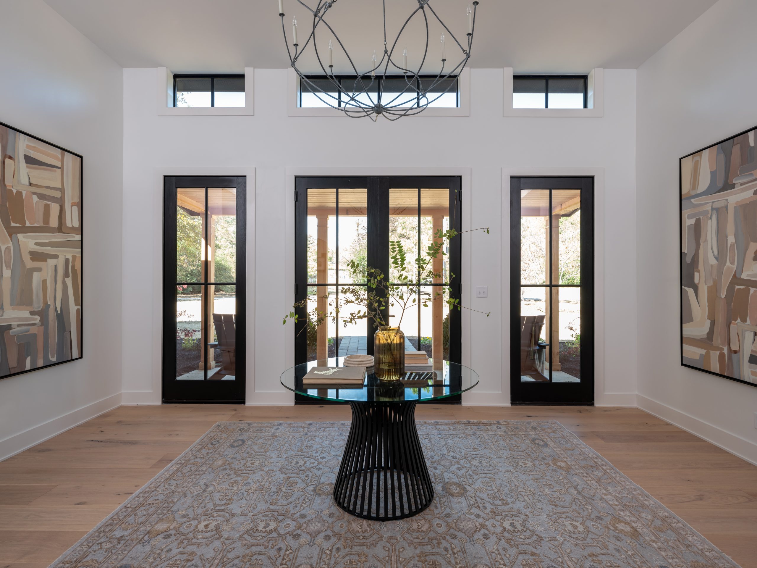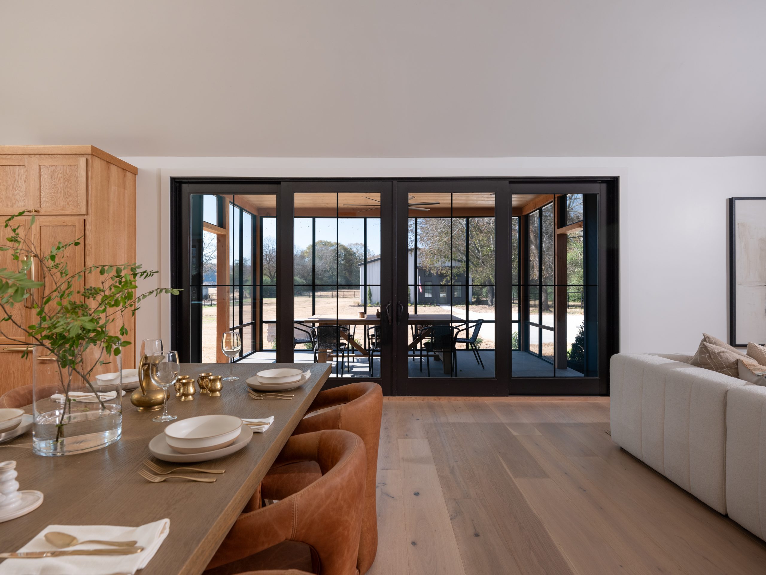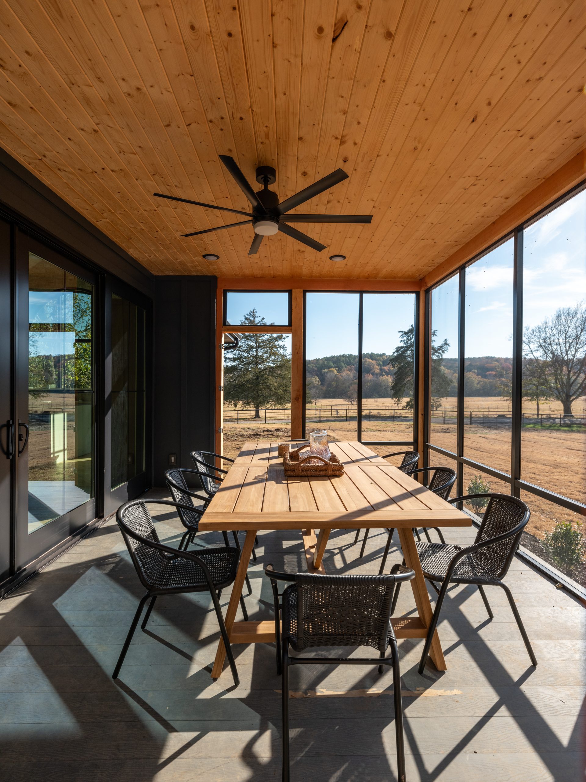 To the right of the living room, we added a covered deck for outdoor seating and dining. It gets buggy here in Arkansas, so it’s always nice to have a screened-in patio. We elevated the look of the patio to match the house by adding wood paneling and recessed lighting to the ceiling, as well as black trim to the walls.