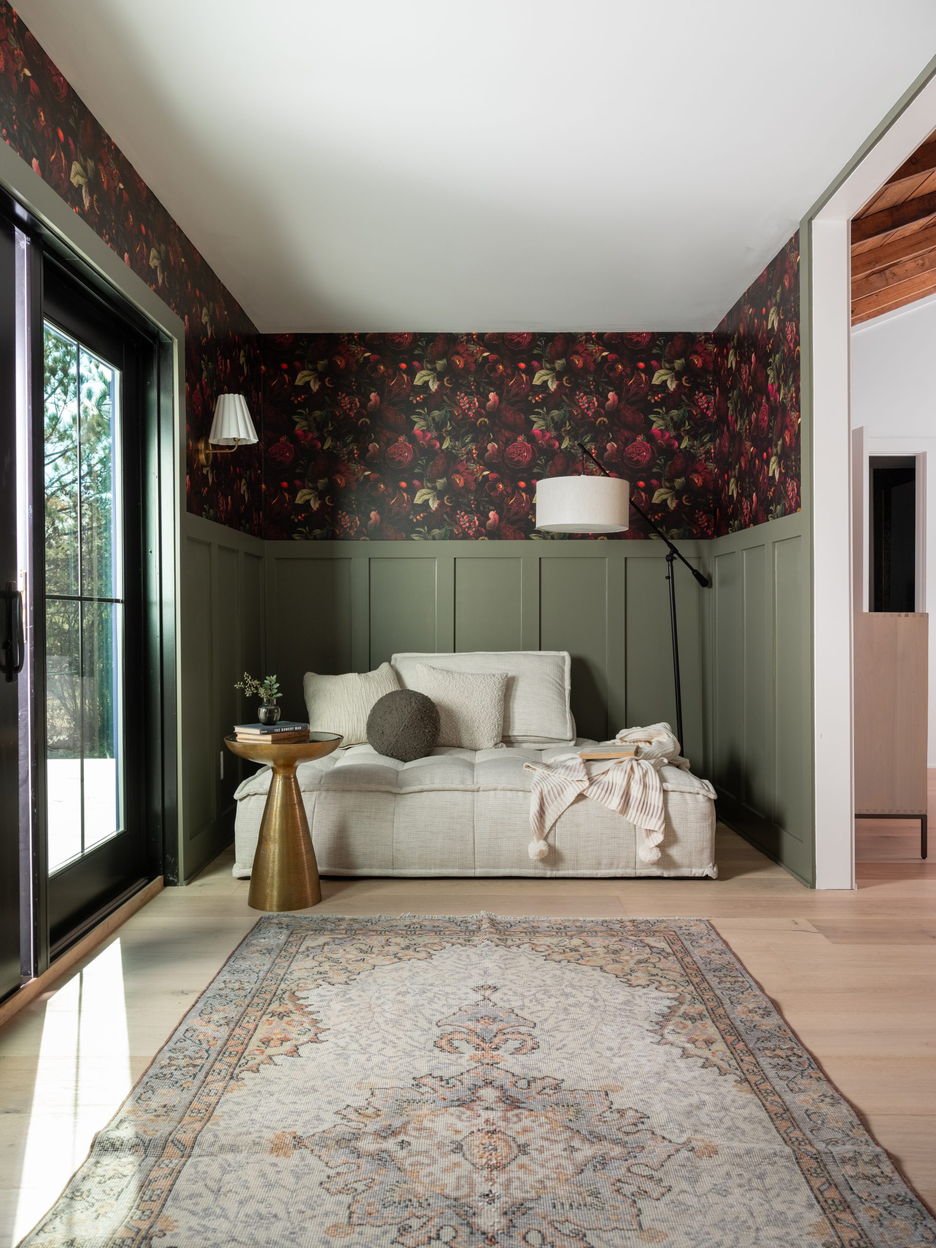 I’m so glad we were able to add insulation to the old porch and turn it into an indoor sitting room. This gave me a chance to add drama to the space with dark trim and bold wallpaper. It gives glamour to the bedroom. Plus, the built-in window seat makes for a cozy reading spot.