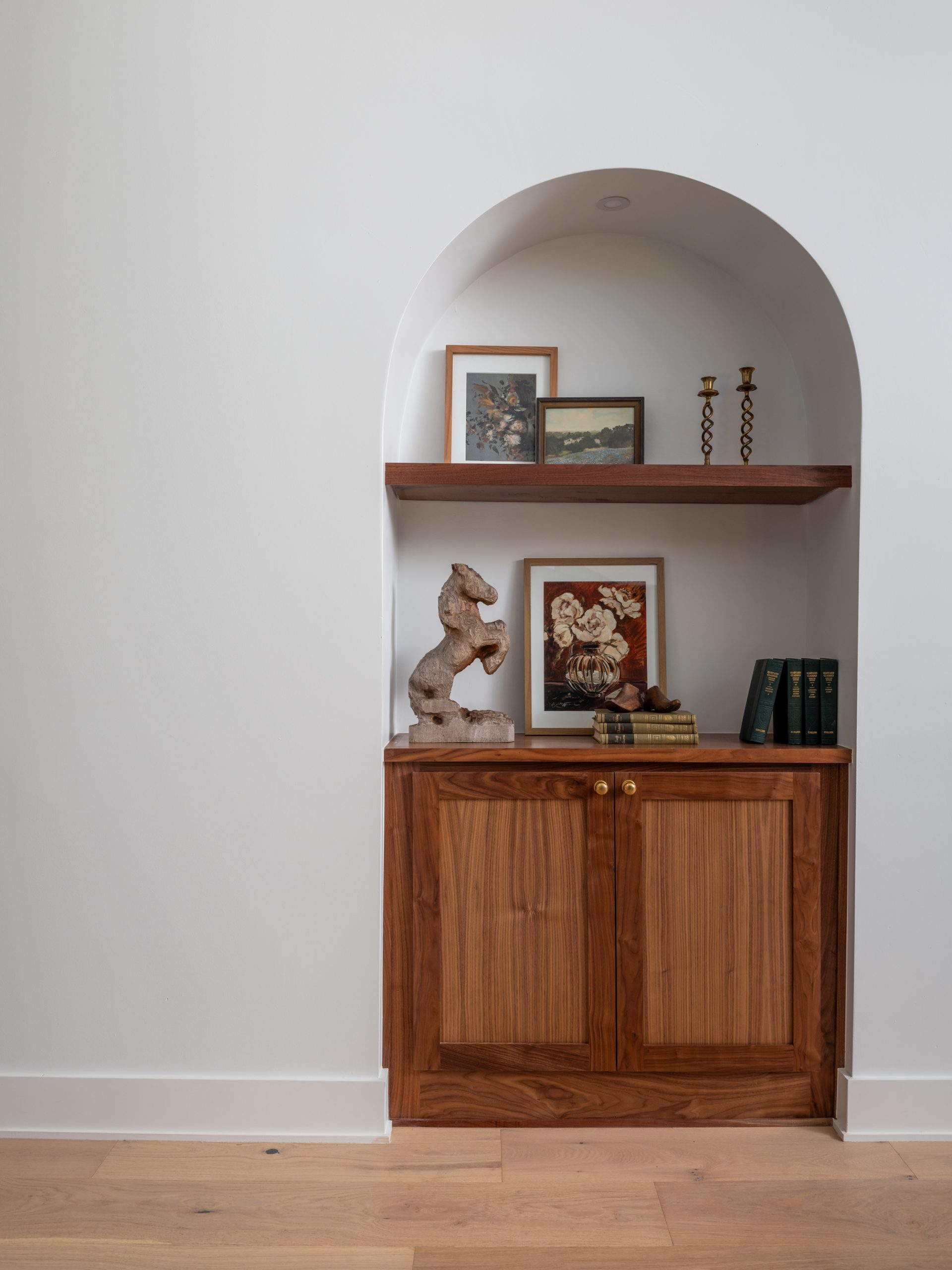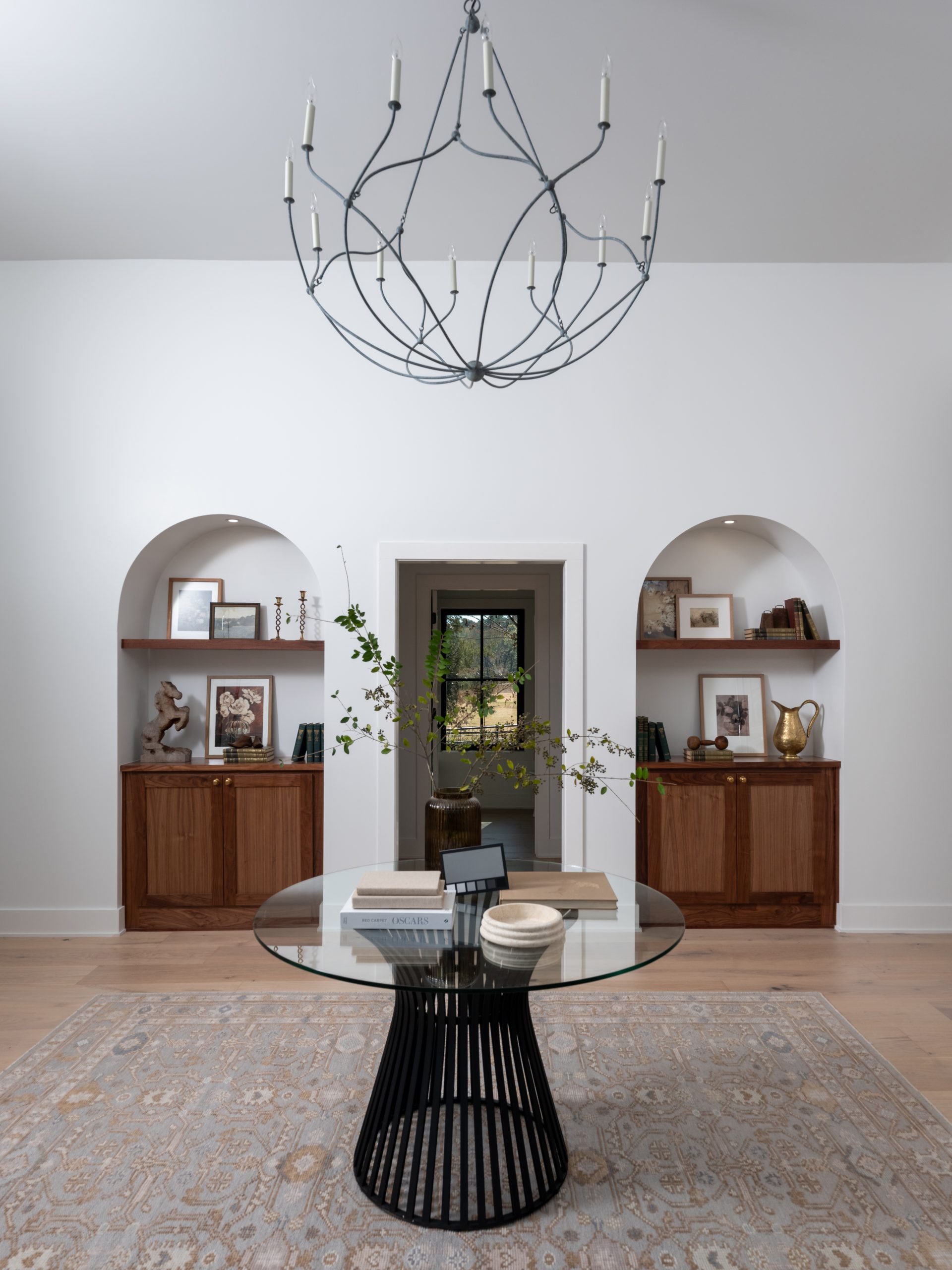 To add character in here, Dave built two beautiful cabinets within arched alcoves, using walnut from the family’s property. We added one of my absolute favorite chandeliers in here. It’s airy and modern and perfect in this beautiful space.