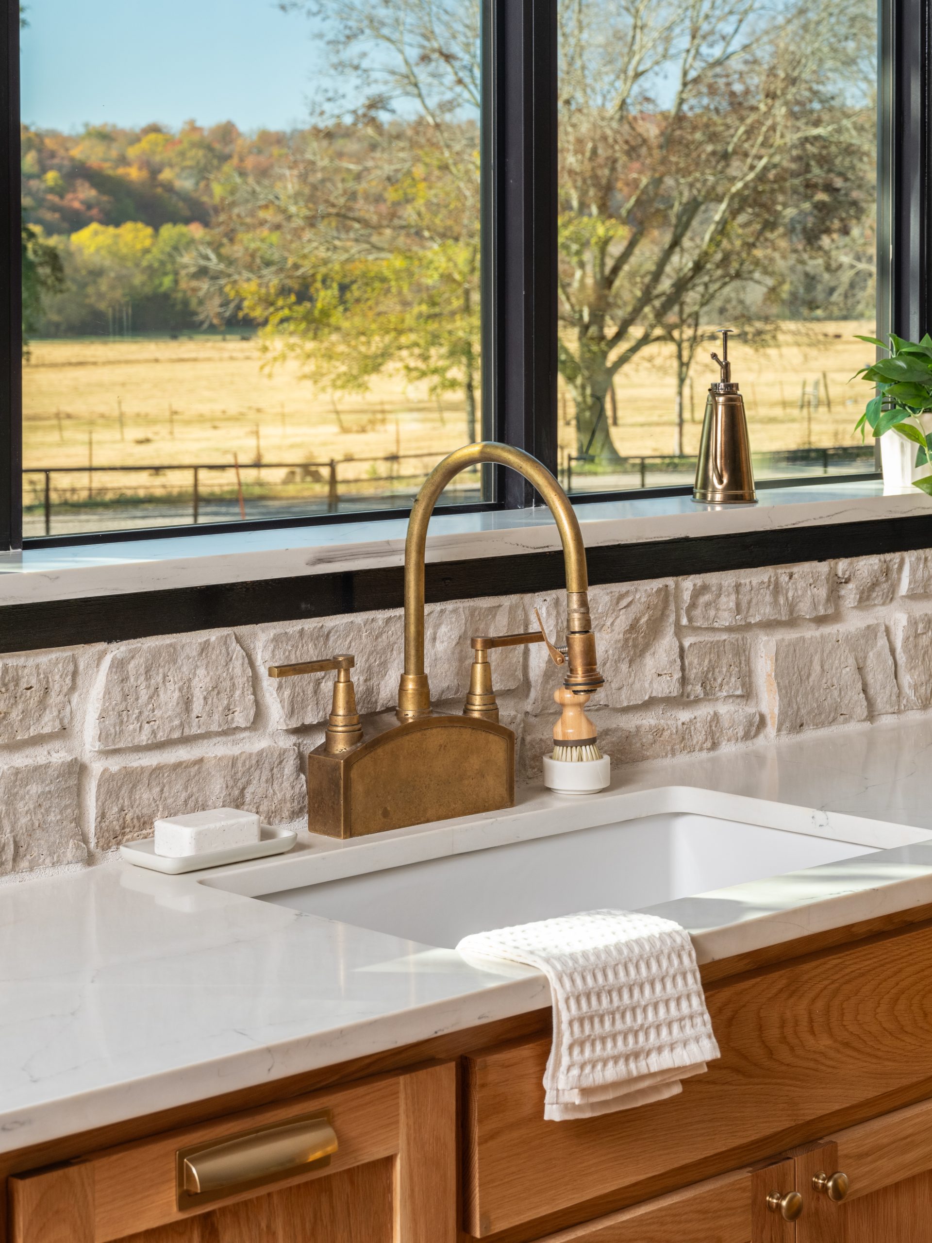 This kitchen. Where do I even begin??? The incredible arched window above the sink creates an incredible focal point with a gorgeous view and allows beautiful natural light to stream into the kitchen. Gabby loves stone (who doesn’t?!) so the stone backsplash wall was a perfect addition here. It also serves to bring the natural outdoors inside and creates a nice contrast with the white oak cabinetry and wide panel flooring. The cabinets, the dishwasher and the panel ready refrigerator are all covered in stunning white oak to allow the range to have its own moment. Together with the waterfall island, the gold hardware, gold sconces and my favorite handmade faucet, the kitchen has an elegant feel to it. Just off to the side in the kitchen, we added an old-fashioned wood-burning stone which Gabby really wanted. It helps to define the dining room and create a cozy feel in the space.
