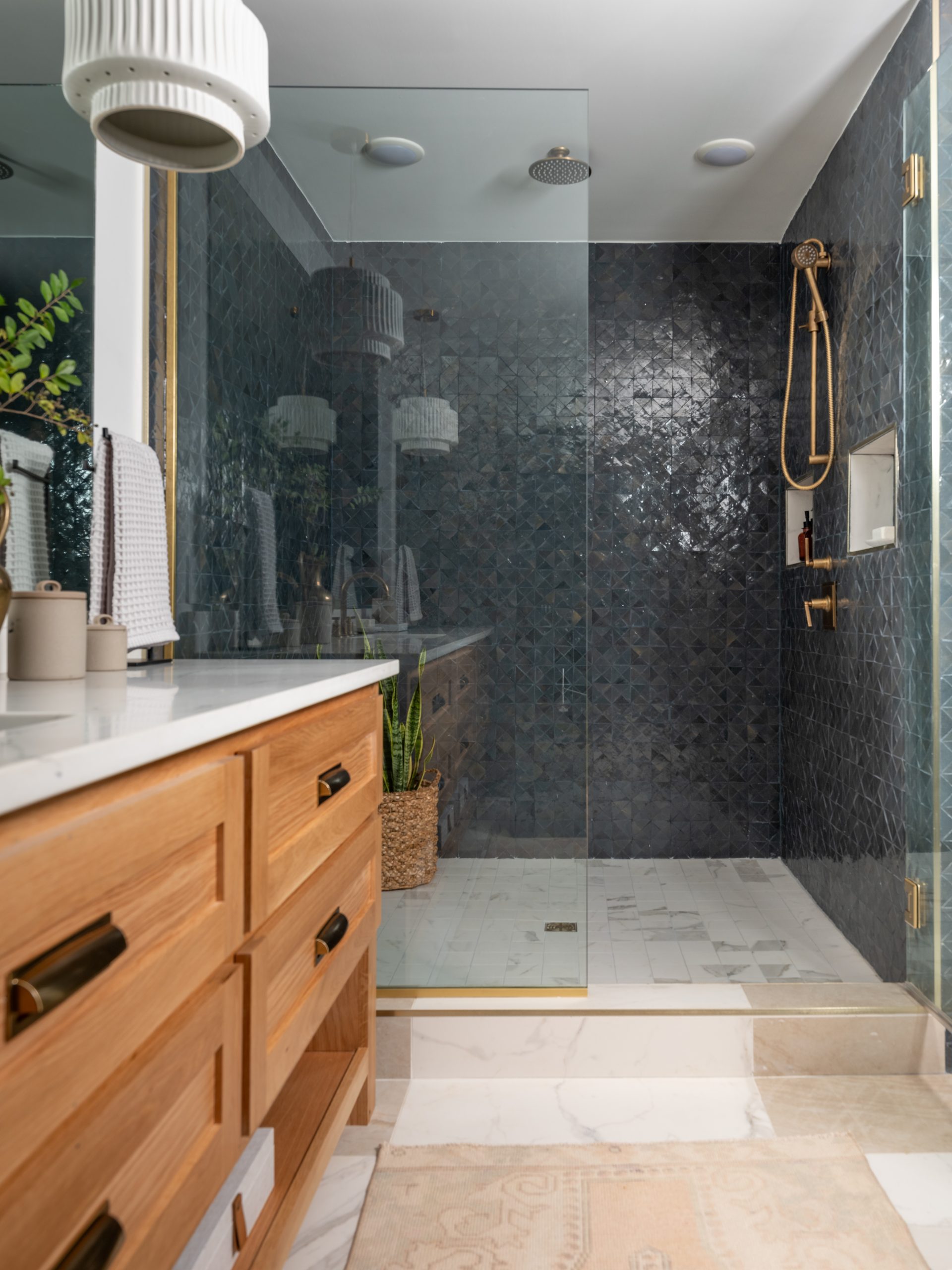 For the bathroom, we continued the glam theme with a larger checkerboard pattern for the floor and glossy handmade Zellige tile in the shower. The large individual floor tile magnifies the size of the bathroom, while the geometric shower tile elevates the style. We chose gold handmade Atmosphyre fixtures for the entire bathroom (shower, bath and sinks) – as we did in the kitchen. Above the bathtub, we hung a bubble chandelier as a fun play on bubble baths. The whole bathroom has a Hollywood Regency vibe to it.