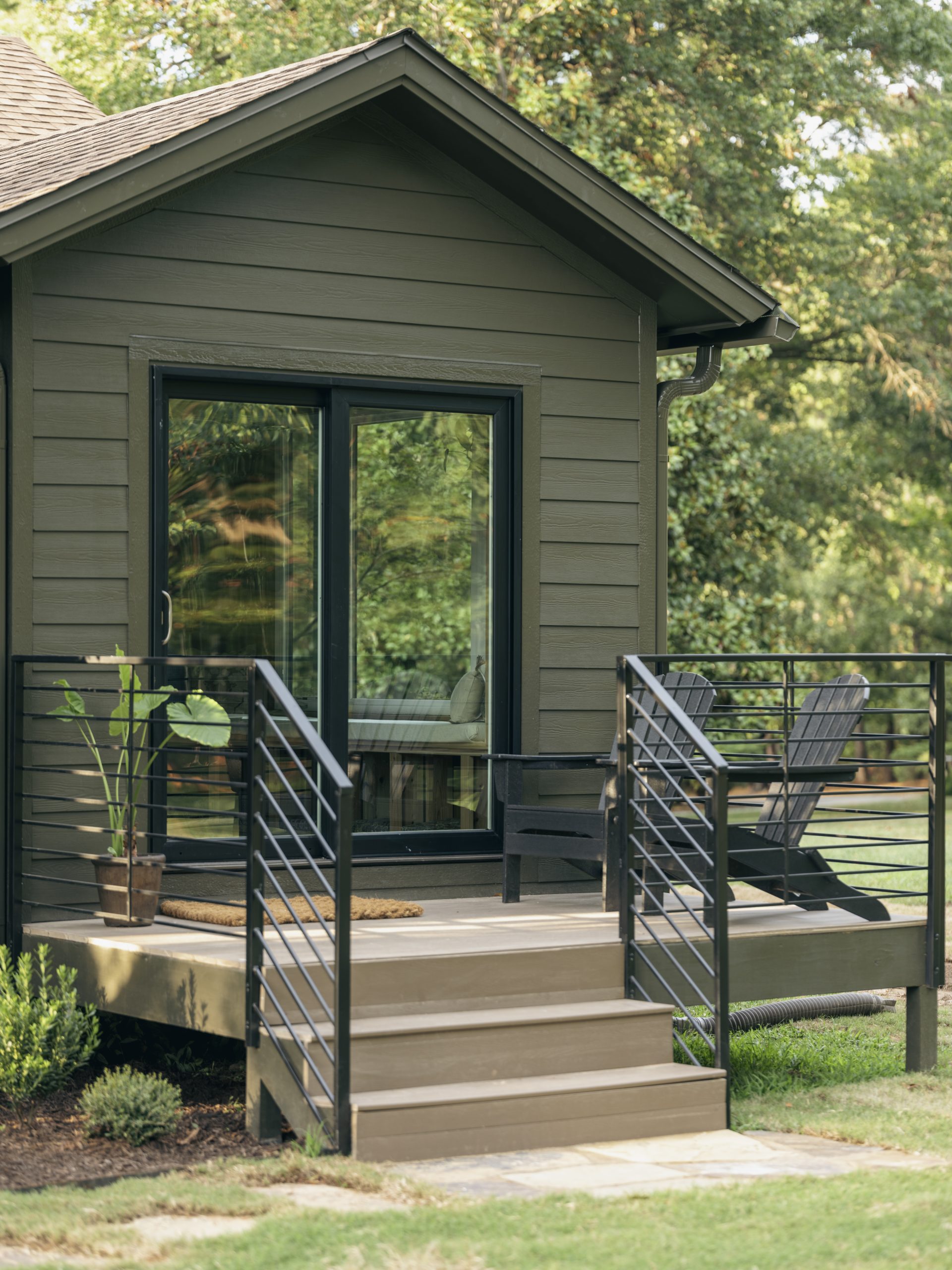 Once we rebuilt the decking, we added new horizontal railings in the same dark color to match the exterior trim, pulling it all together.