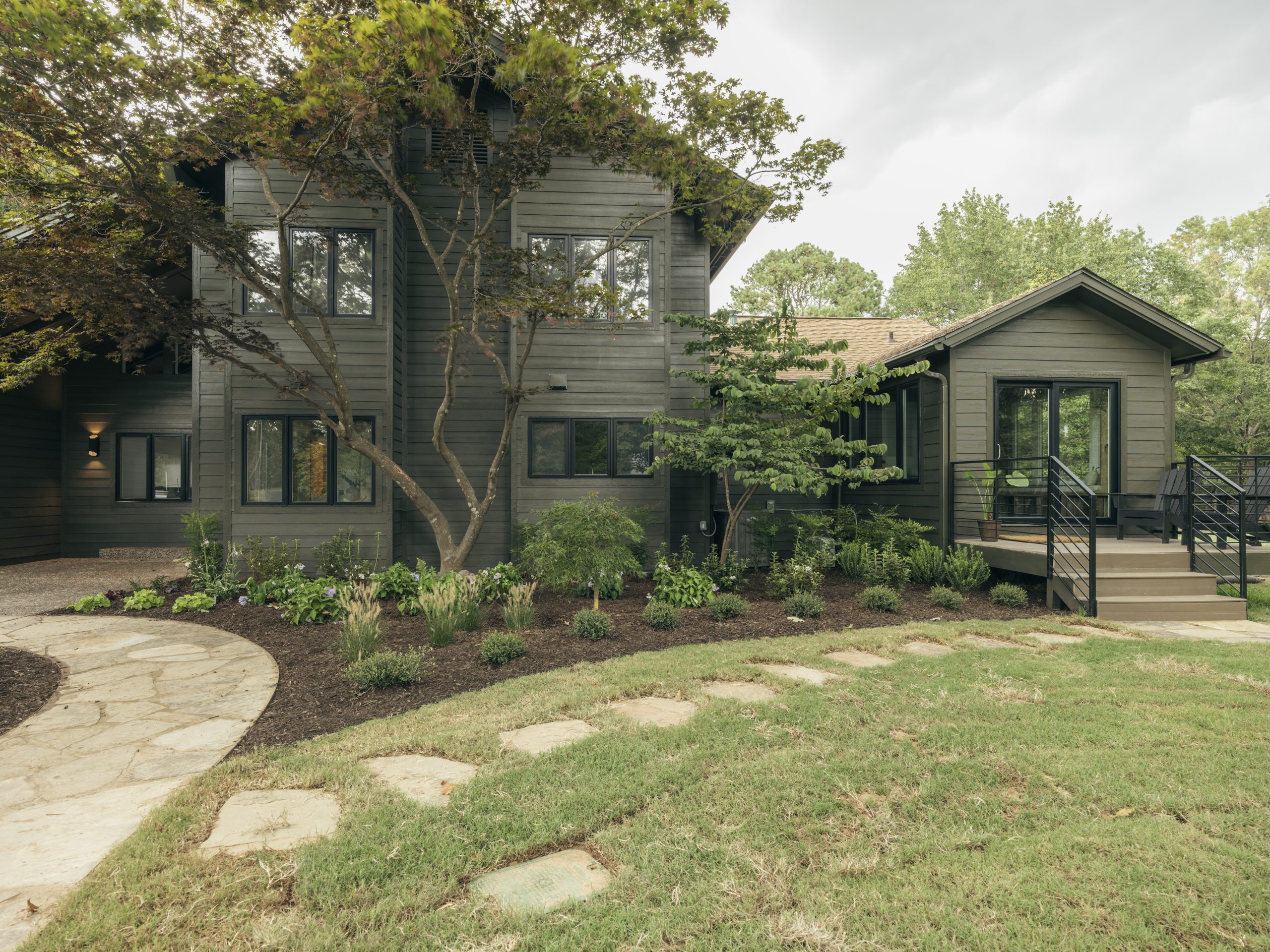 For the landscaping, we kept it simple but impactful, choosing one tall focal piece to line up with the stone at the center of the house. Fresh shrubs and plants around the front and back add contrast and texture, complementing the mature trees that surround the home.
