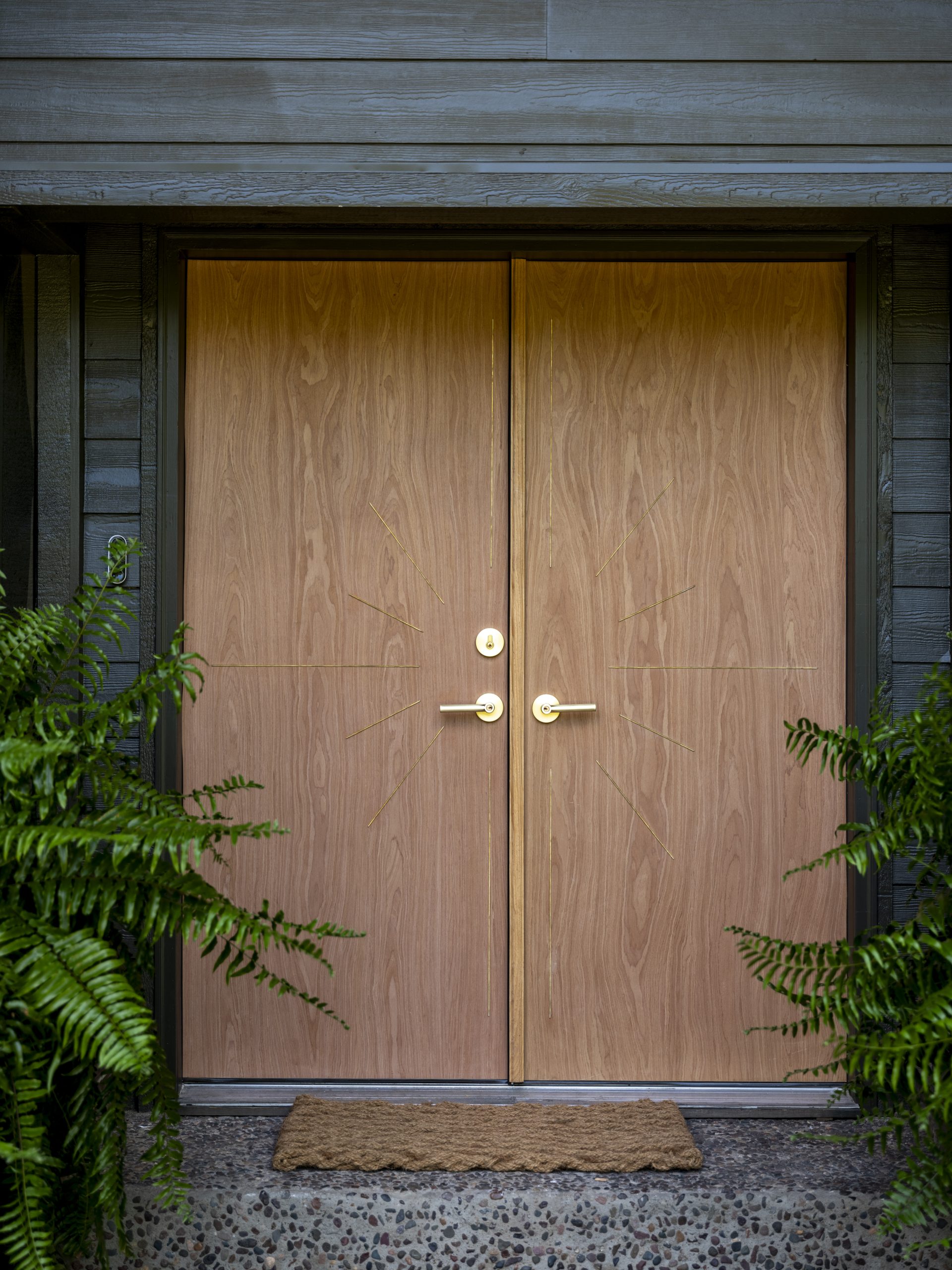 For the front door, we went to our neighbor’s barn for brass strips —just what we needed to inlay into the door for a little extra pizzazz. Dave worked his magic, setting the inlay in a starburst pattern that gives it the perfect mid-century vibe.
