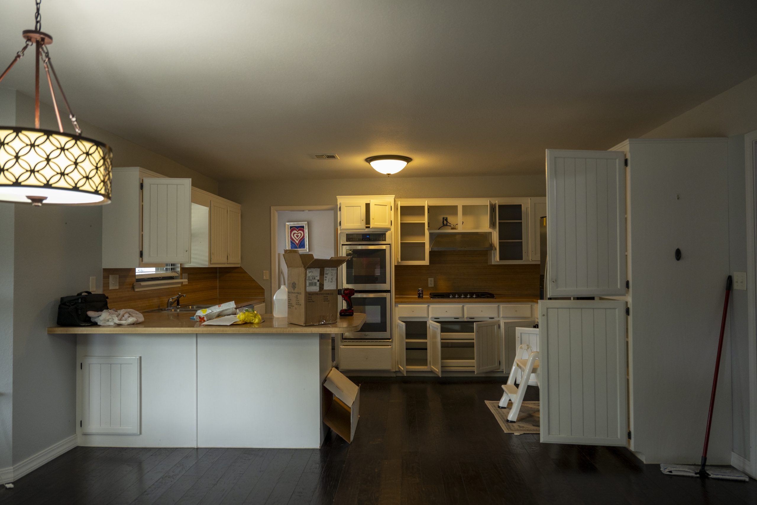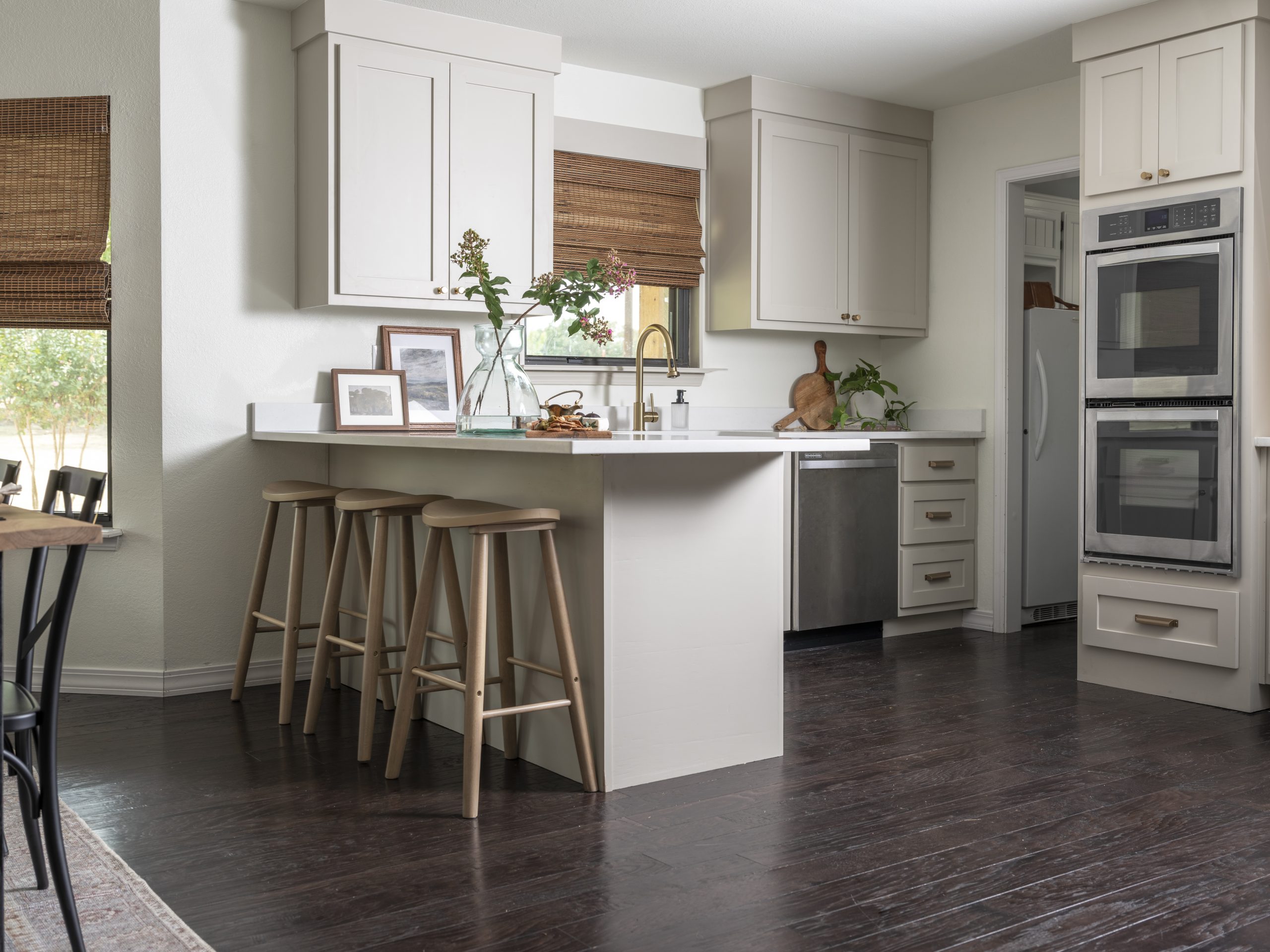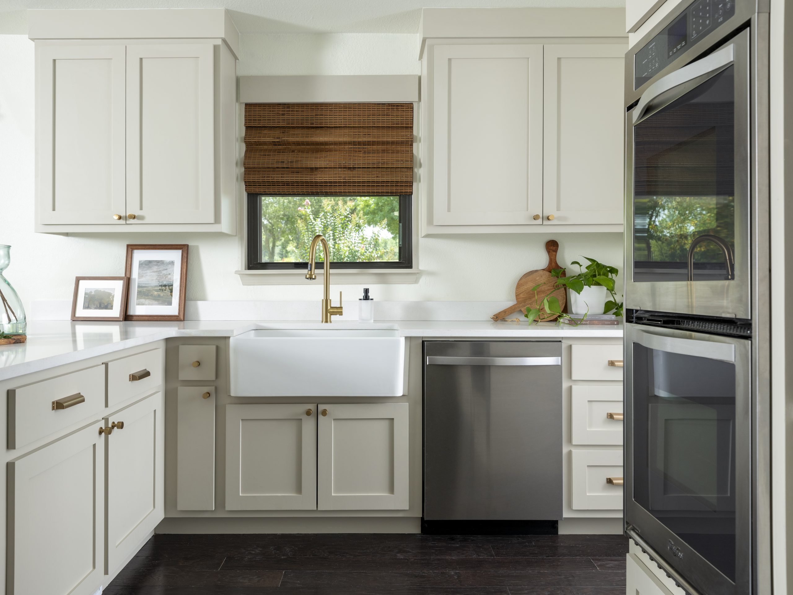 In addition to the cabinets, we added new appliances, a gorgeous quartz countertop, fresh paint, new lighting, and even an original piece of art depicting their backyard.