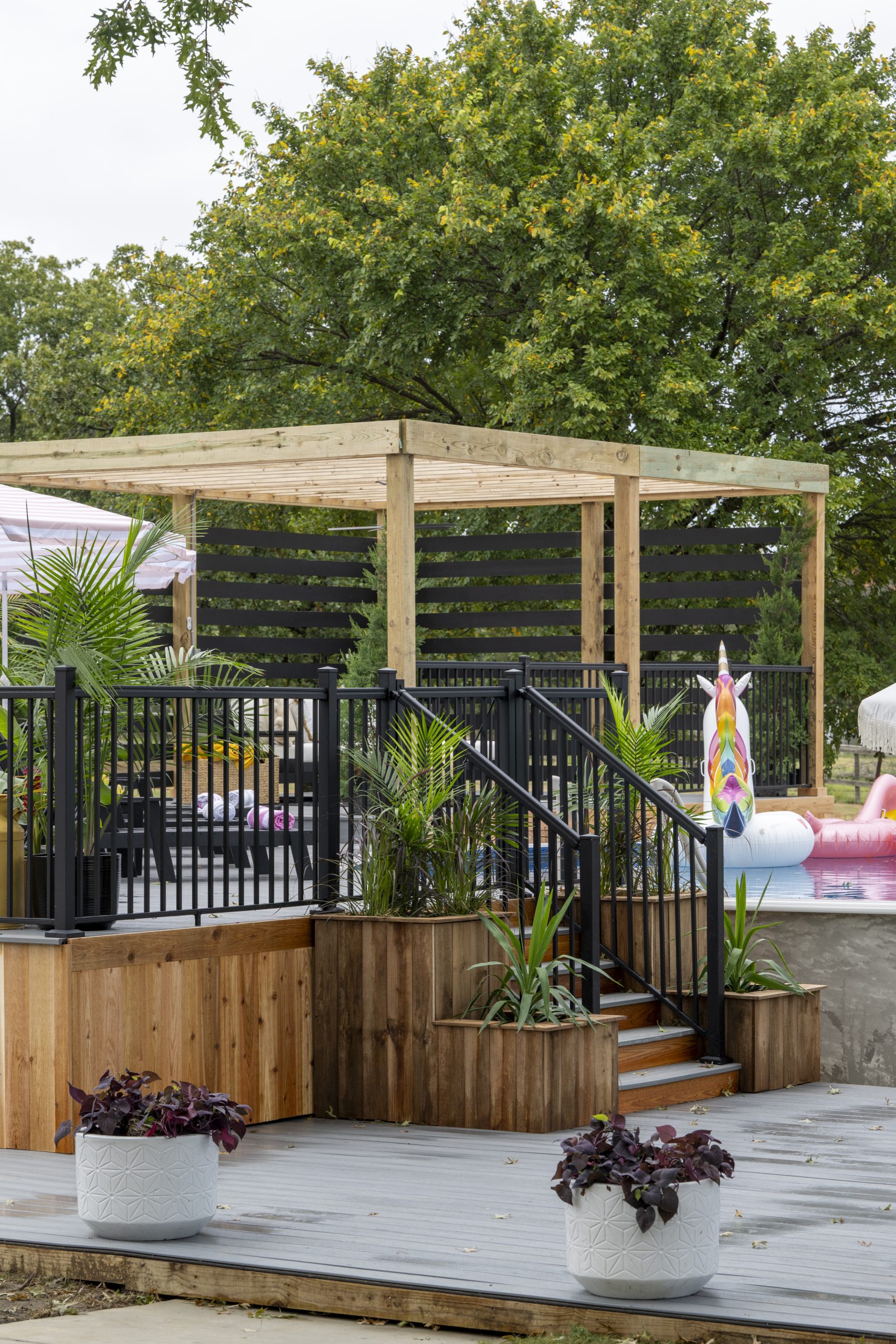 We started by matching the back of the house to the updated front, adding a patio, fresh trim, and new landscaping. Then, we dove into the most ambitious project of all: Jay’s plans for a three-level, 1,400-square-foot composite deck complete with handrail and a pergola.
