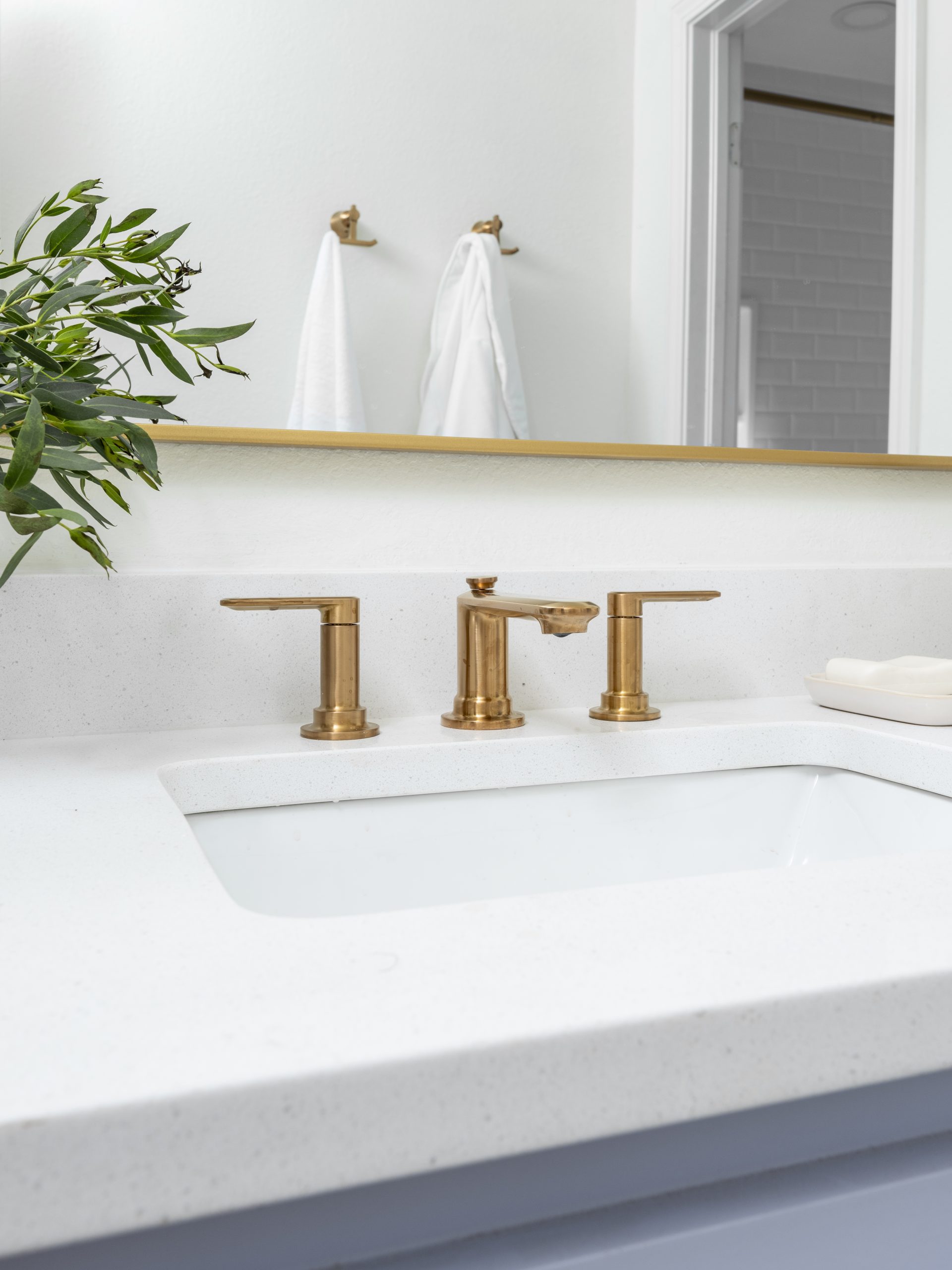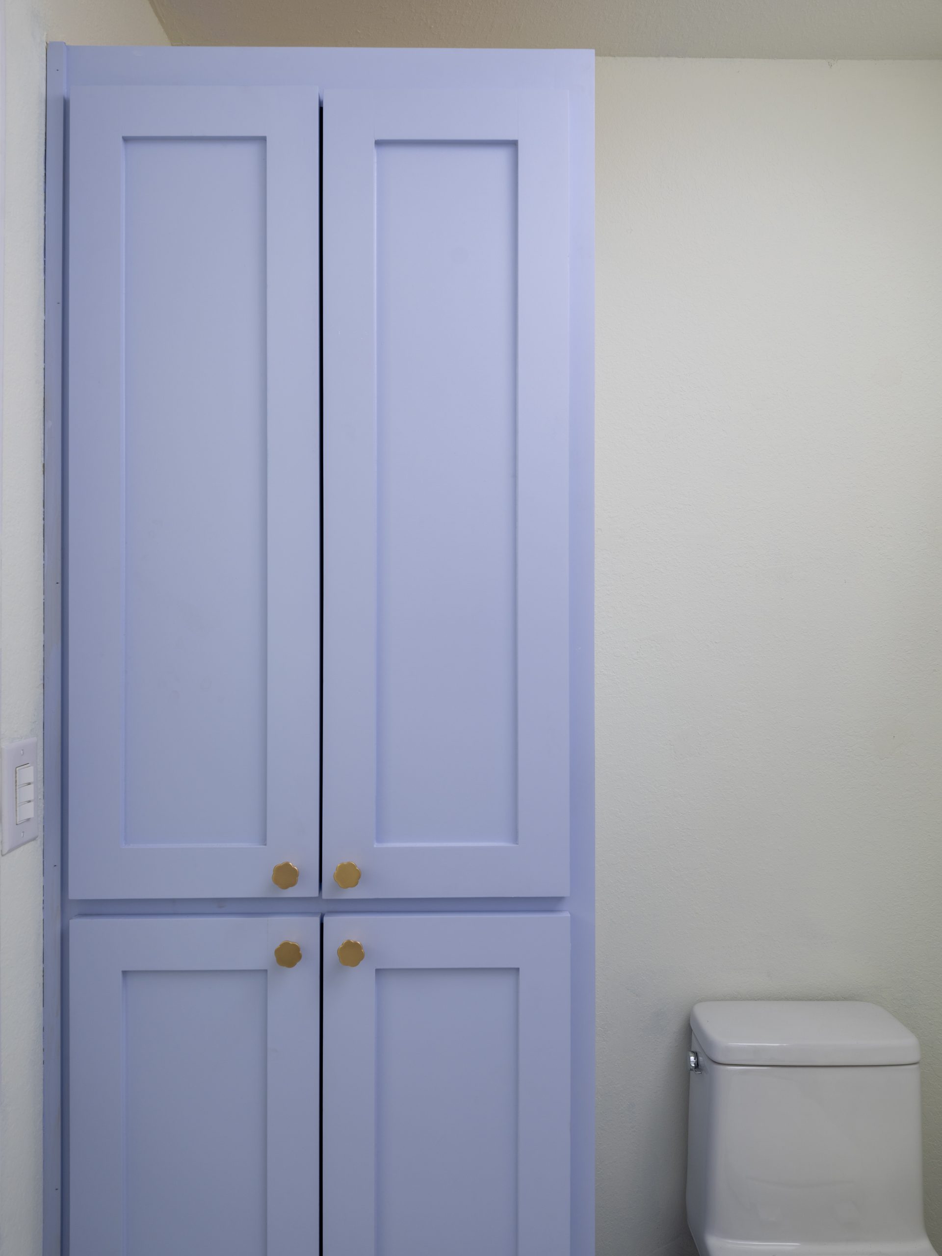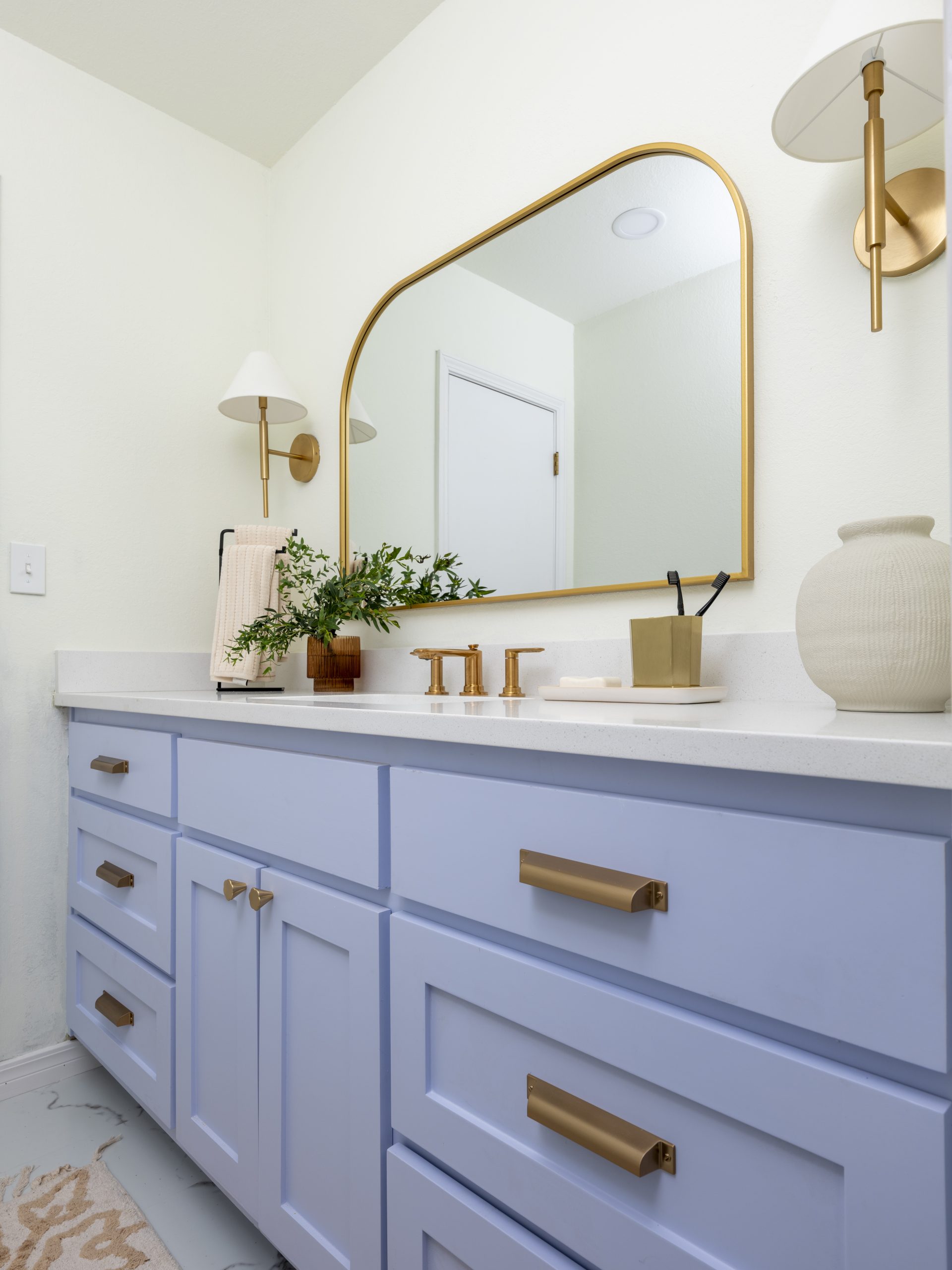 The bathroom was a good size but felt outdated. We completely transformed this space with new flooring, a new tub, new tile, new lighting, new fixtures – new everything! Chris worked his magic again, crafting a custom vanity painted in a light lavender—perfect for young girls like Hattie and Hazel. Gold accents throughout the space added the perfect mix of elegance and fun.
