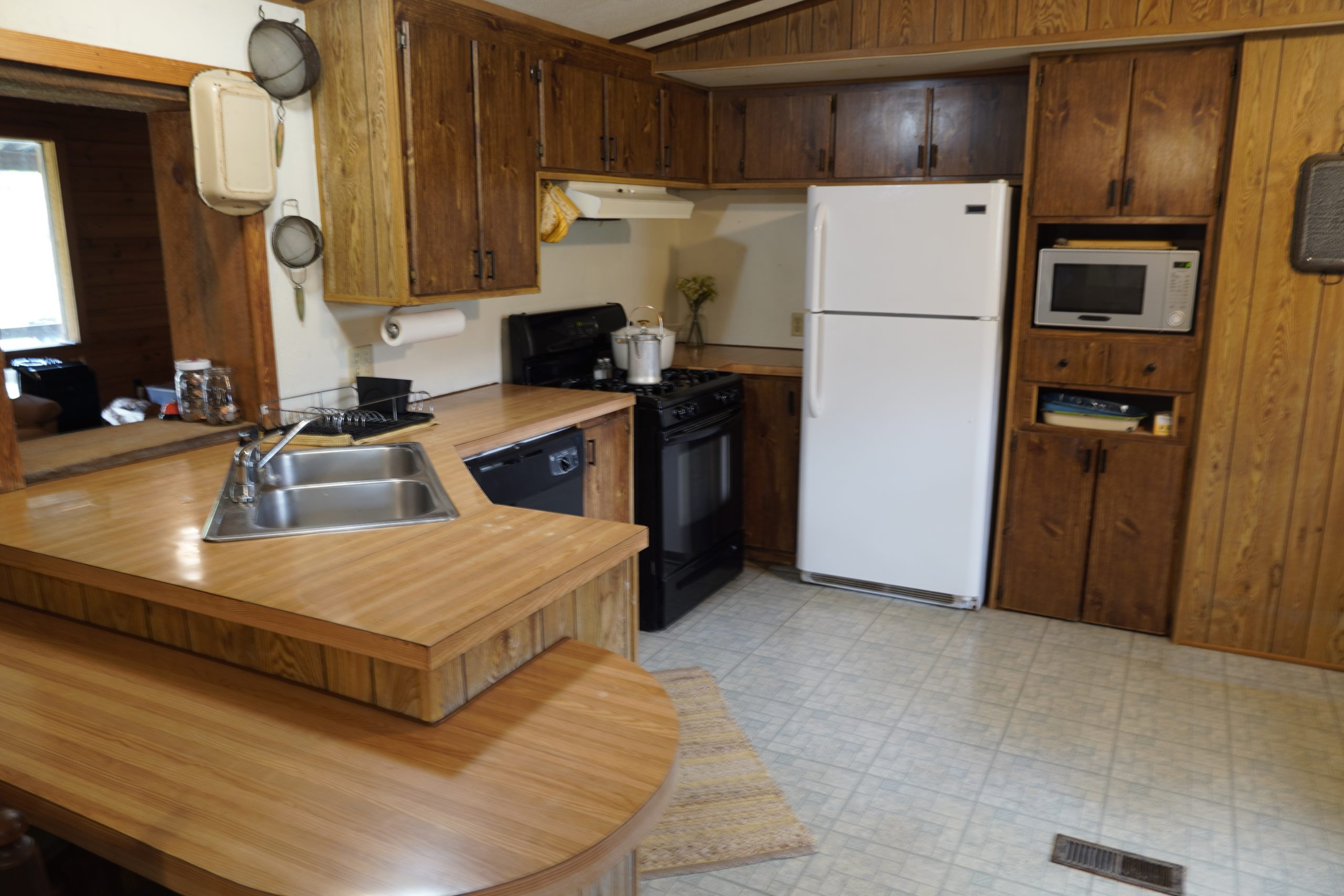 The layout is all about balance with a row of warm cabinets along one wall and a window and light-colored-stone along the opposite wall, blending nicely with the logs and other natural elements of the home.