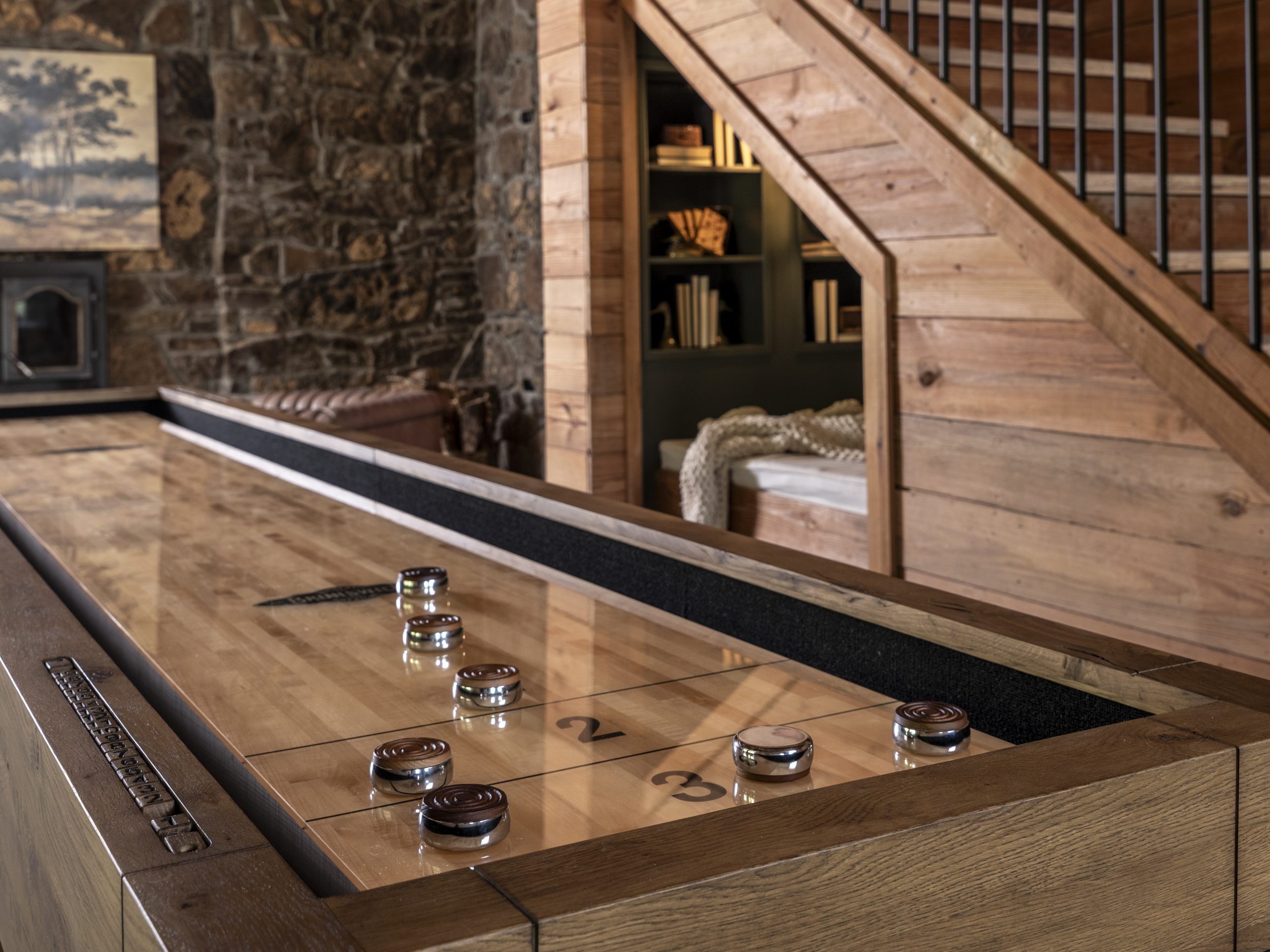 Dave used an old rusted barrel and walnut planks he found on the Wolfes’ property to create a one-of-a-kind repurposed coffee table. It was a fun addition to the man cave, and we always love finding ways to reuse old materials, especially when they bring in authentic details that reflect the history of the space.
