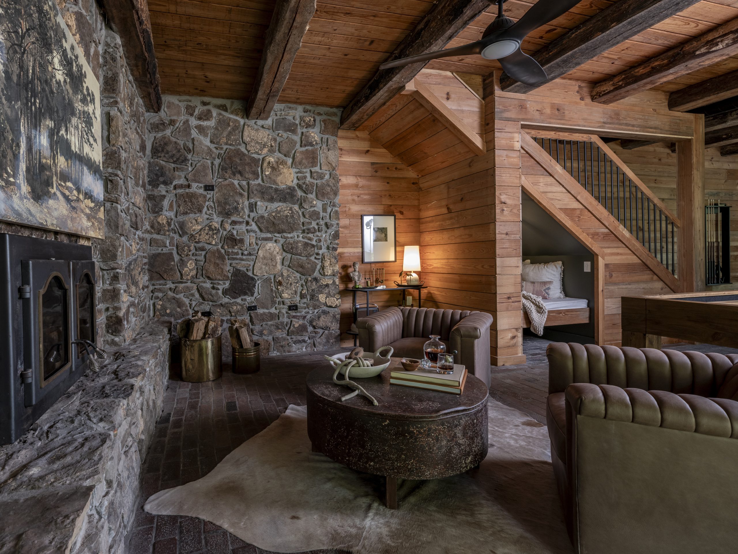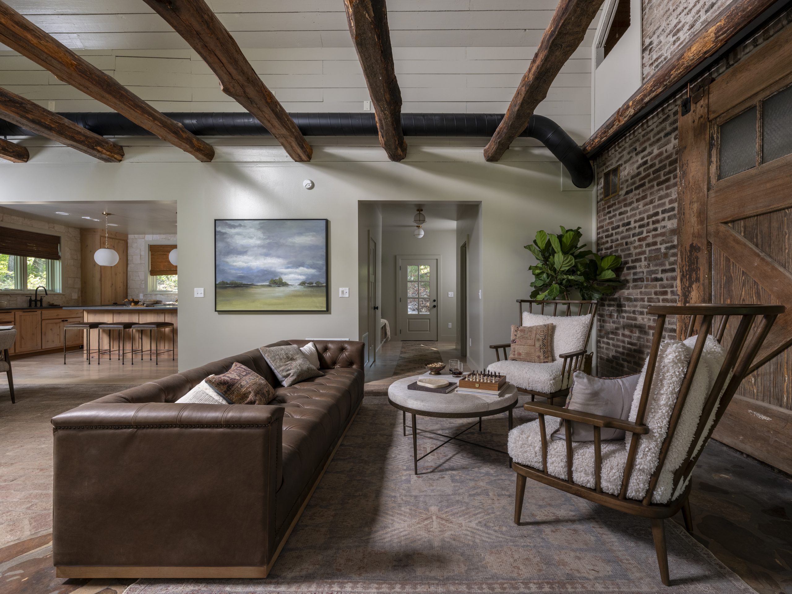 This space was previously the dining room and family room. Since those rooms were moved to the other side of the house, we were able to turn this area into a cozy man cave that really leans into the cabin feel. We closed off the wall between this new living room and the new main bedroom, added windows, and updated the furniture to create a comfortable place to hang out and play.